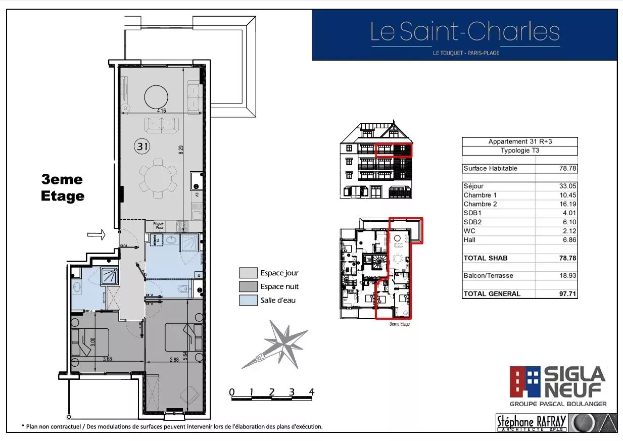 A deux pas de la Rue Saint-Jean, dans une résidence de standing livrée en 2025, appartement traversant de 78,78m² situé au 3ème étage comprenant :