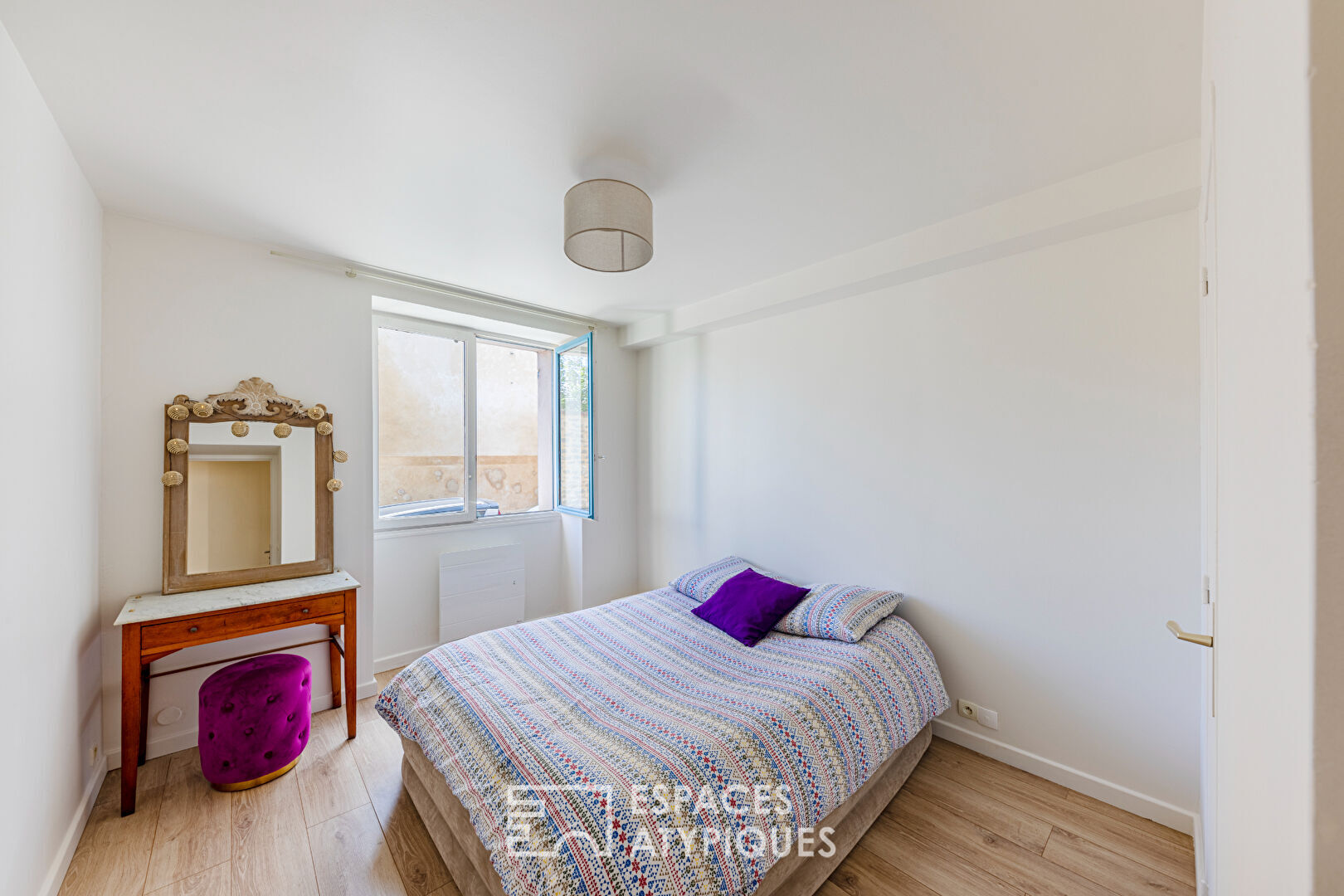 Au coeur du quartier le plus prisé et chargé d'histoire de Mantes-la-Jolie, à quelques pas des ruelles pavées piétonnes et des commerces, se niche un lieu de vie confidentiel et singulier. Loin du standard, cet appartement en duplex de presque 74 m² se vit comme une véritable maison de ville, offrant une indépendance rare et un cachet fou. Passé le seuil de ce bel immeuble ancien, on découvre un premier accès classique qui mène à l'appartement. Mais la magie opère véritablement grâce à sa seconde entrée, totalement privative, directement depuis la rue. Ce détail change tout et confère au lieu un sentiment d'exclusivité et d'indépendance totale. Le niveau principal accueille une vaste pièce de vie de 27 m² où le charme de l'ancien dialogue avec un esprit contemporain. La lumière y est belle et les volumes généreux. Les larges ouvertures ne donnent pas sur le tumulte de la ville, mais se prolongent visuellement sur une magnifique vue de la collégiale Notre-Dame. Deux chambres de 11 m² chacune dont une avec un dressing bénéficient également de cette belle luminosité et de l'exposition sud-ouest. Un escalier mène ensuite à l'espace souplex, véritable signature du lieu. Ici, l'atmosphère se fait plus feutrée, plus intime. Les pierres apparentes pourraient y raconter l'histoire du quartier. C'est par cet espace que l'entrée depuis la rue se fait. On y trouve de nombreux placards sur mesure, un petit coin buanderie et une magnifique salle de bain, véritable espace de bien-être. C'est un refuge, un cocon de tranquillité. Petite surprise de fin de visite : la petite copropriété se partage un grand jardin totalement clos de murs et aux multiples espaces permettant d'en profiter en toute tranquillité. Véritable écrin de verdure au coeur de la ville, cet espace partagé offre un lieu apaisant en toute saison, vous invitant à profiter de la nature en plein coeur de ville ! Une cave complète ce bien résolument atypique. Un lieu de vie hybride et intelligent, qui combine à la perfection la sécurité d'une copropriété, les volumes d'un appartement de caractère et l'esprit "maison" très rare dans ce quartier. Pour ceux qui cherchent l'exceptionnel au quotidien. CLASSE ENERGIE : D / CLASSE CLIMAT : B Prix moyen des énergies indexés sur les années 2021, 2022, 2023 (abonnements compris) : 1 380 euros et 1 890 euros Contact : Julie 07 77 84 74 57 RSAC Versailles 894 542 950 Copropriété de 25 lots - dont 8 lots habitation. Julie VALODE RAUBER (EI) Agent Commercial - Numéro RSAC : 894 542 950 - Versailles.