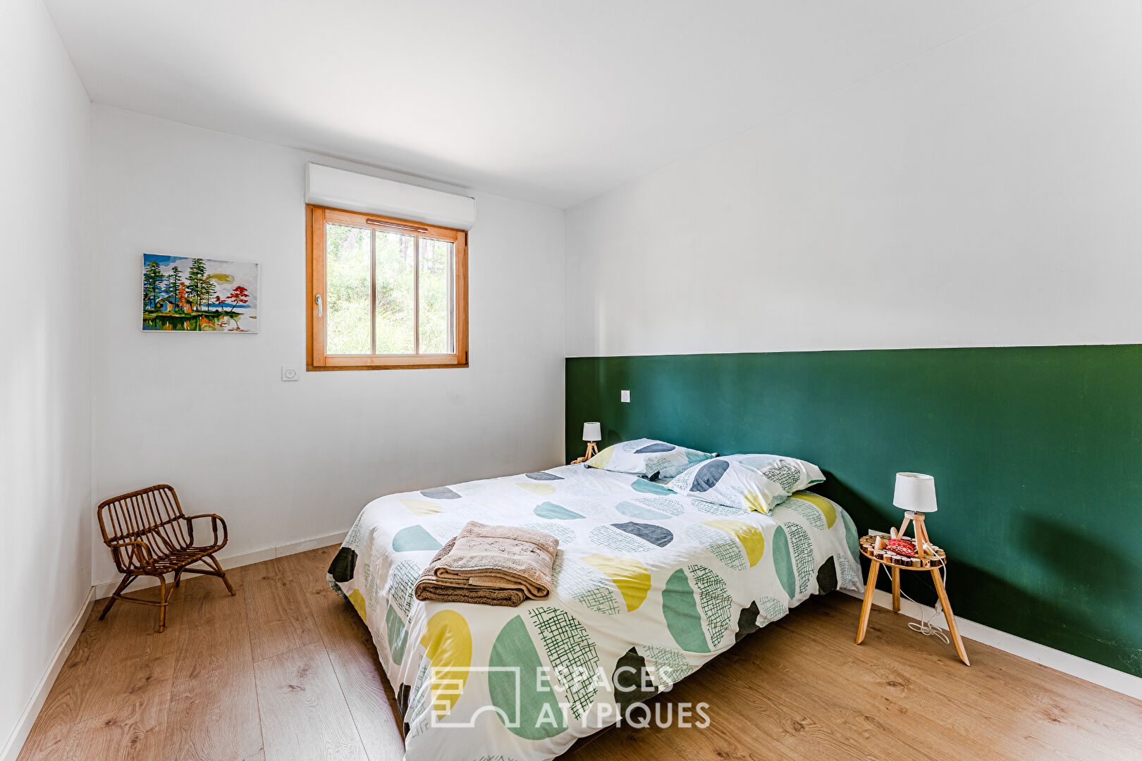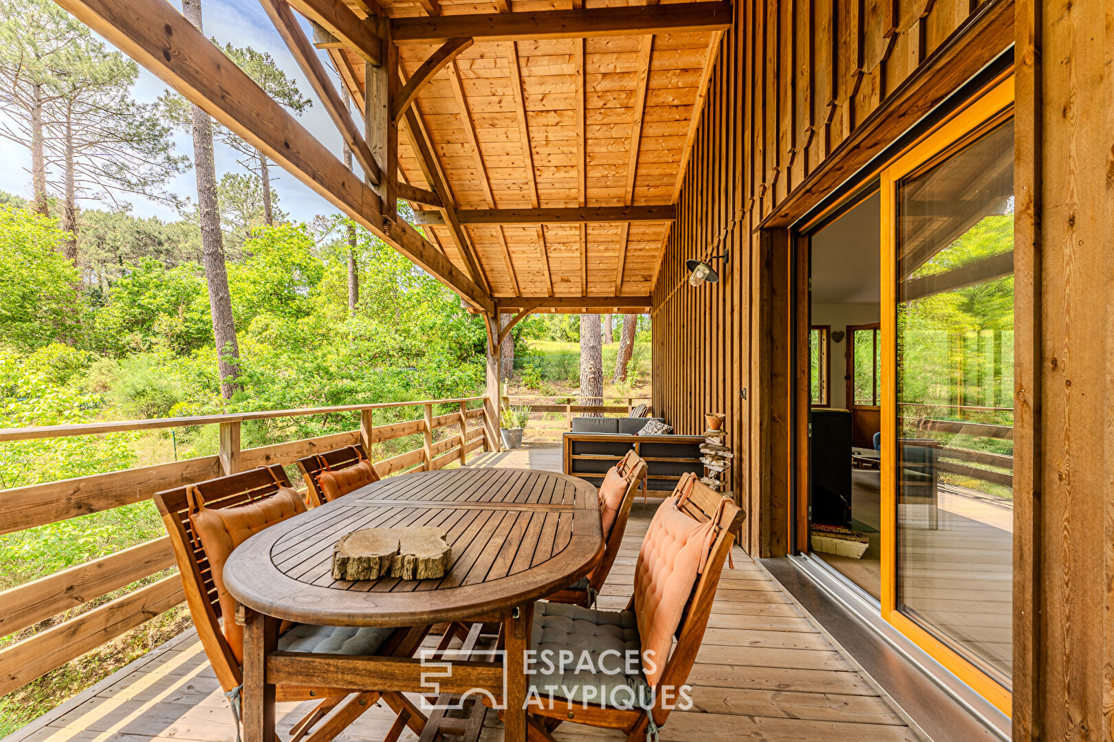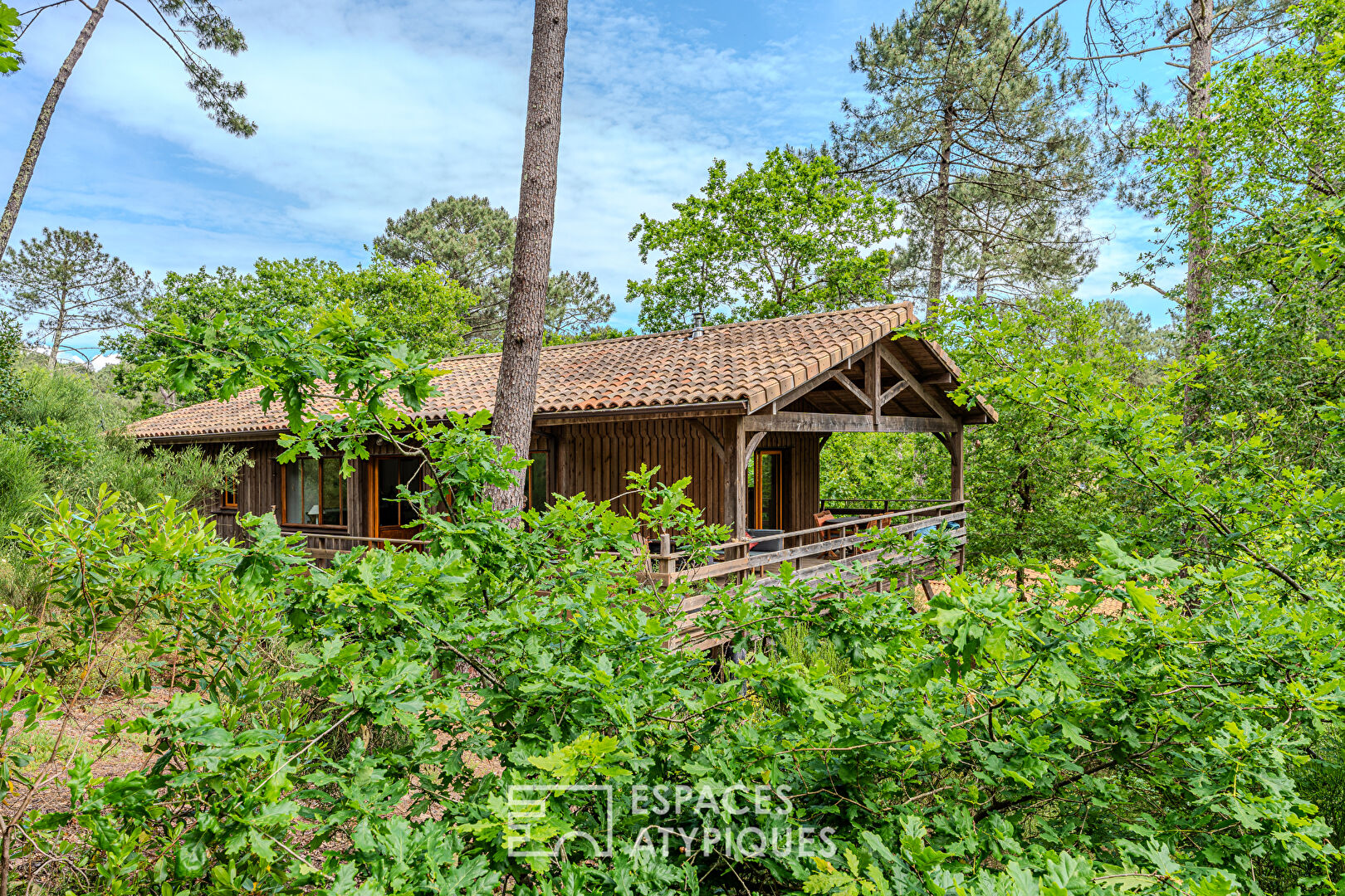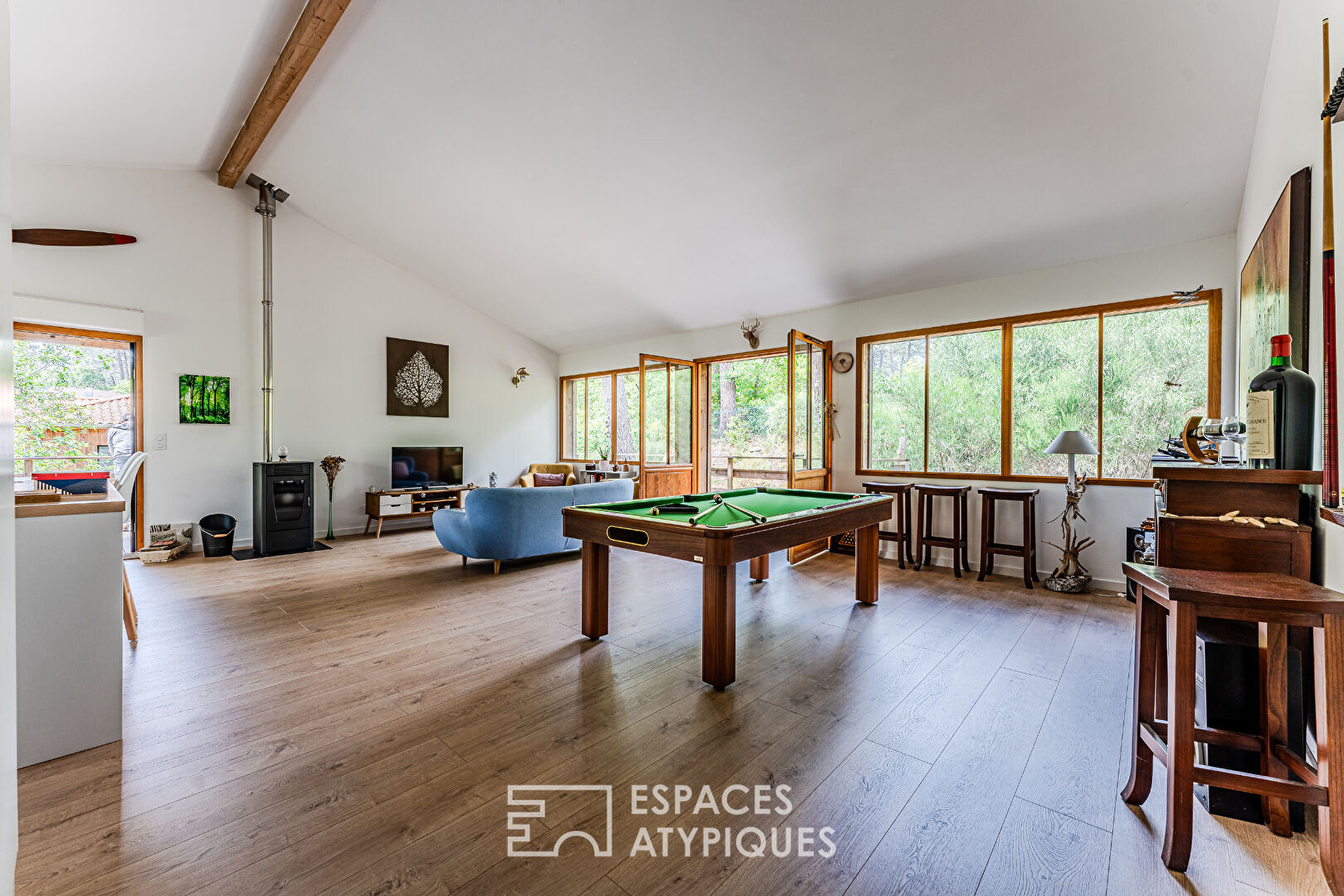Nichée au coeur du domaine privé du golf de Biscarrosse, cette maison d'architecte de 104 m² séduit par son caractère singulier et son intégration parfaite dans un environnement naturel préservé. Suspendue sur pilotis, elle s'élève au milieu d'un terrain arboré de chênes, créant un véritable cocon végétal. Sa grande terrasse en bois prolonge harmonieusement la pièce de vie, invitant à profiter du calme et des vues dégagées sur la canopée. Un lieu de vie rare, en lisière directe du parcours de golf, dans un cadre verdoyant et confidentiel. L'intérieur se distingue par une architecture ouverte et lumineuse. La pièce de vie principale, orientée plein sud, développe 56 m² baignée de lumière naturelle, grâce à de larges baies vitrées qui encadrent le paysage. Le volume généreux permet une configuration fluide entre salon, salle à manger et cuisine ouverte. Trois chambres complètent les espaces nuit, ainsi qu'une salle d'eau contemporaine. Le bois et les matériaux naturels renforcent l'ambiance chaleureuse et apaisante du lieu. L'agencement a été pensé pour allier confort de vie et fonctionnalité, dans une atmosphère épurée. L'extérieur prolonge la sensation d'évasion. Implantée en surplomb, la maison se fond dans un jardin naturel peuplé de chênes. Le terrain, à la fois sauvage et maîtrisé, offre de belles possibilités d'aménagement paysager ou de création d'un espace de détente. Le domaine du golf garantit calme et intimité, tout en restant à proximité immédiate du lac et de la plage. Maison atypique par excellence, ce bien suspendu allie architecture contemporaine et immersion en pleine nature. Un équilibre rare entre design, sérénité et fonctionnalité. CLASSE ÉNERGIE : B / CLASSE CLIMAT : A Montant moyen estimé des dépenses annuelles d'énergie pour un usage standard, établi à partir des prix de l'énergie de l'année 2021 : entre 610 euros et 890 euros. Contact : Arnaud Schwizguebel tél : 06.84.25.71.00 RSAC : 941 363 046 Mont-de-Marsan ARNAUD SCHWIZGUEBEL (EI) Agent Commercial - Numéro RSAC : 941363046 - Mont-de-Marsan.