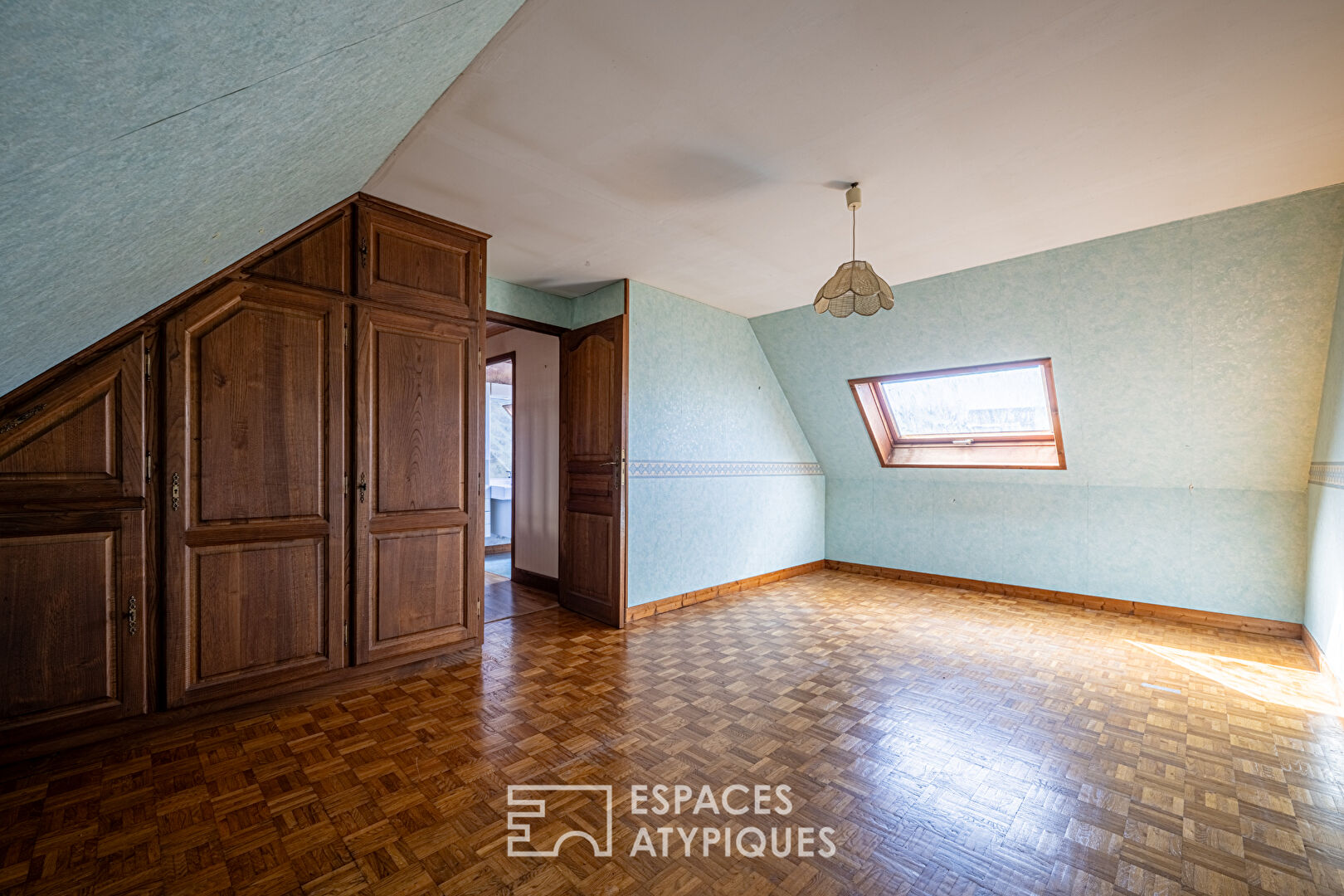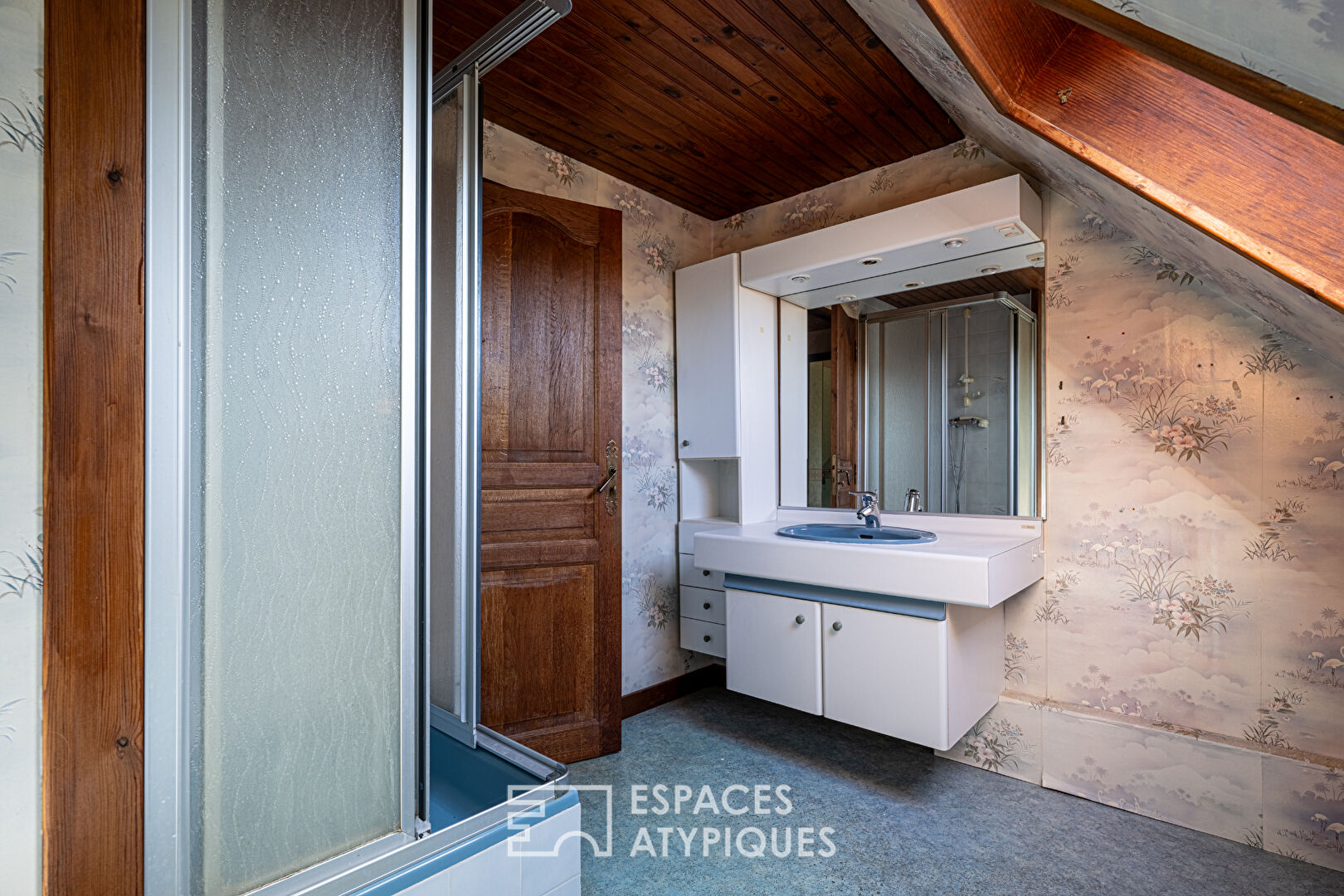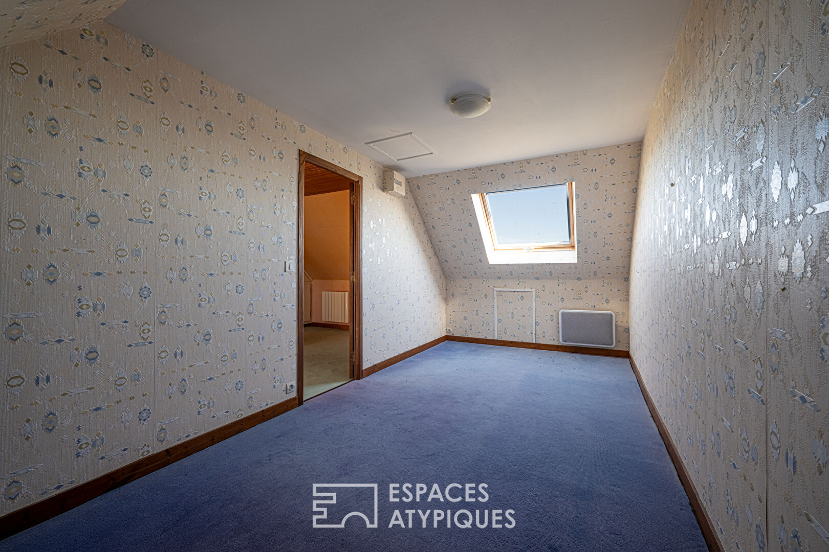 Située à Querqueville, au sein de la commune de Cherbourg-en-Cotentin, cette maison de 145 m² environ sur une parcelle de 1 840 m² environ offre l' opportunité d'un projet de ré interprétation totale. Érigée sur un terrain généreux et offrant un jardin arboré, cette ensemble séduit par ses volumes qui ne demandent qu'à être sublimés. L'intérieur dévoile un agencement spacieux propice à une restructuration créative. Le rez-de-chaussée s'ouvre sur une entrée et un couloir desservant un séjour-salon avec cheminée, une cuisine aménagée, ainsi qu'un bureau. La pièce de vie et la cuisine bénéficient toutes deux d'un accès direct à une véranda lumineuse. Ce niveau est complété par une double chambre avec placards, une salle de bains et des sanitaires. A l'étage, le palier distribue deux chambres avec placards, dont une double traversante, ainsi qu'une salle de douche avec sanitaire. Le sous-sol complet, une serre et un garage viennent enrichir les prestations fonctionnelles de ce bien . A l'extérieur, le vaste terrain entourant la maison permet d'imaginer de futurs espaces de détente en parfaite harmonie avec un environnement calme . La proximité immédiate des commerces, des écoles et des infrastructures facilite le quotidien tout en préservant une certaine sérénité. CLASSE ENERGIE : E / CLASSE CLIMAT : B Montant moyen estimé des dépenses annuelles d'énergie pour un usage standard, établi à partir des prix de l'énergie des années 2021, 2022, 2023 et 2024 : entre 1980 euros et 2720 euros. Les informations sur les risques auxquels ce bien est exposé sont disponibles sur le site Géorisques : www.georisques.gouv.fr Contact : Anne AMOURETTE, Agent commercial indépendant 06.07.30.13.90 EI RSAC : 402 516 447 RCS Nantes Anne AMOURETTE (EI) Agent Commercial - Numéro RSAC : 402 516 447 - NANTES.