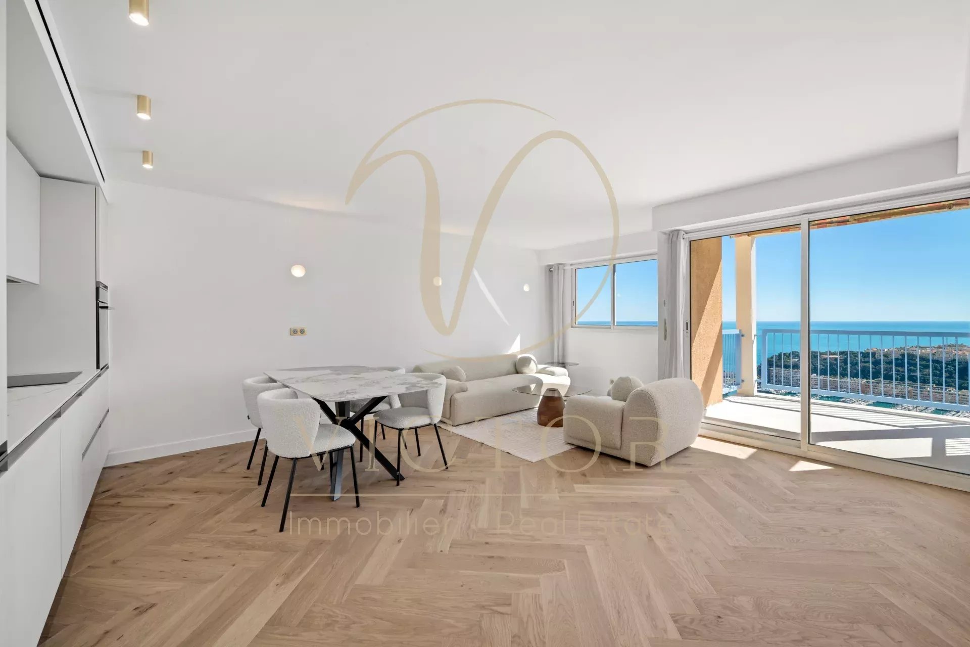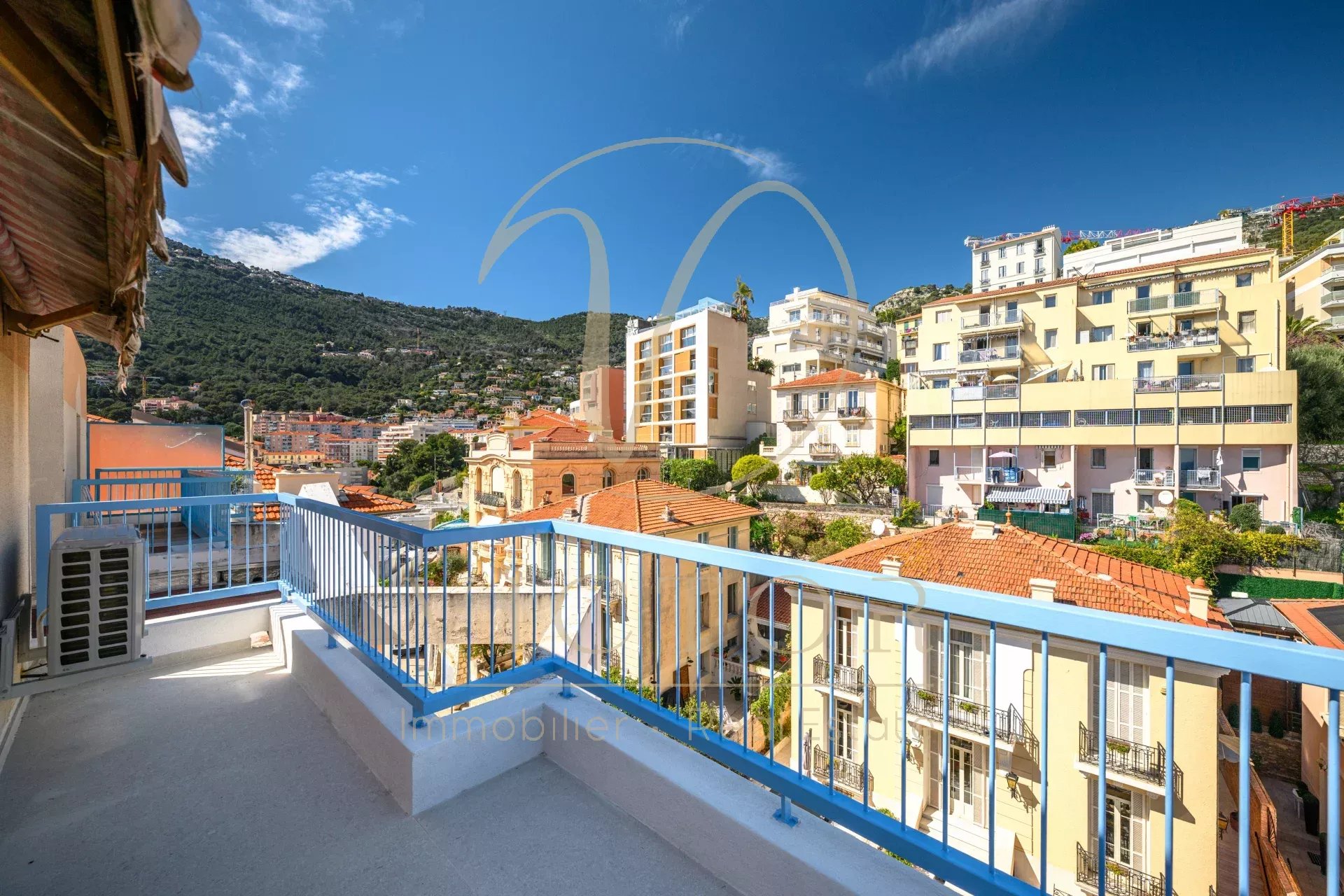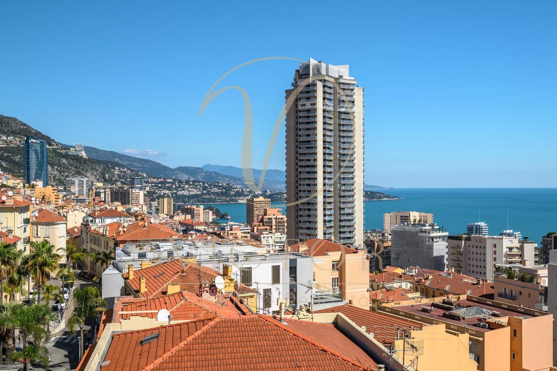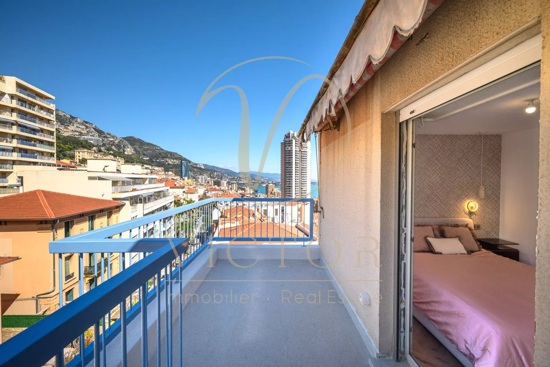 Aux portes de Monaco - position dominante Appartement de type 3p en dernier étage d'un immeuble de 6 étages avec ascenseur. 2 Terrasses avec VUE MER ET COLLINES Rénové avec goût. séjour avec cuisine ouverte de pratiquement 30m². 2 chambres avec chacune sa salle de douche. dressing. 2 toilettes. coin buanderie. Une cave et possibilité d'acquérir un garage de plain pied sur cour en supplément. Honoraires d’agence à la charge du vendeur. DPE : Classe énergie B (108 kWh/m²/an) – Classe climat A (4 kg CO₂/m²/an). Montant estimé des dépenses annuelles d’énergie pour un usage standard : entre 700 € et 1020 € par an (prix moyens des énergies indexés sur les années et 2023). Bien soumis au statut de la copropriété. Nombre de lots : 12 – Charges annuelles : 2232 €. Procédure en cours : non. Les informations sur les risques auxquels ce bien est exposé sont disponibles sur le site Géorisques : georisques.gouv.fr