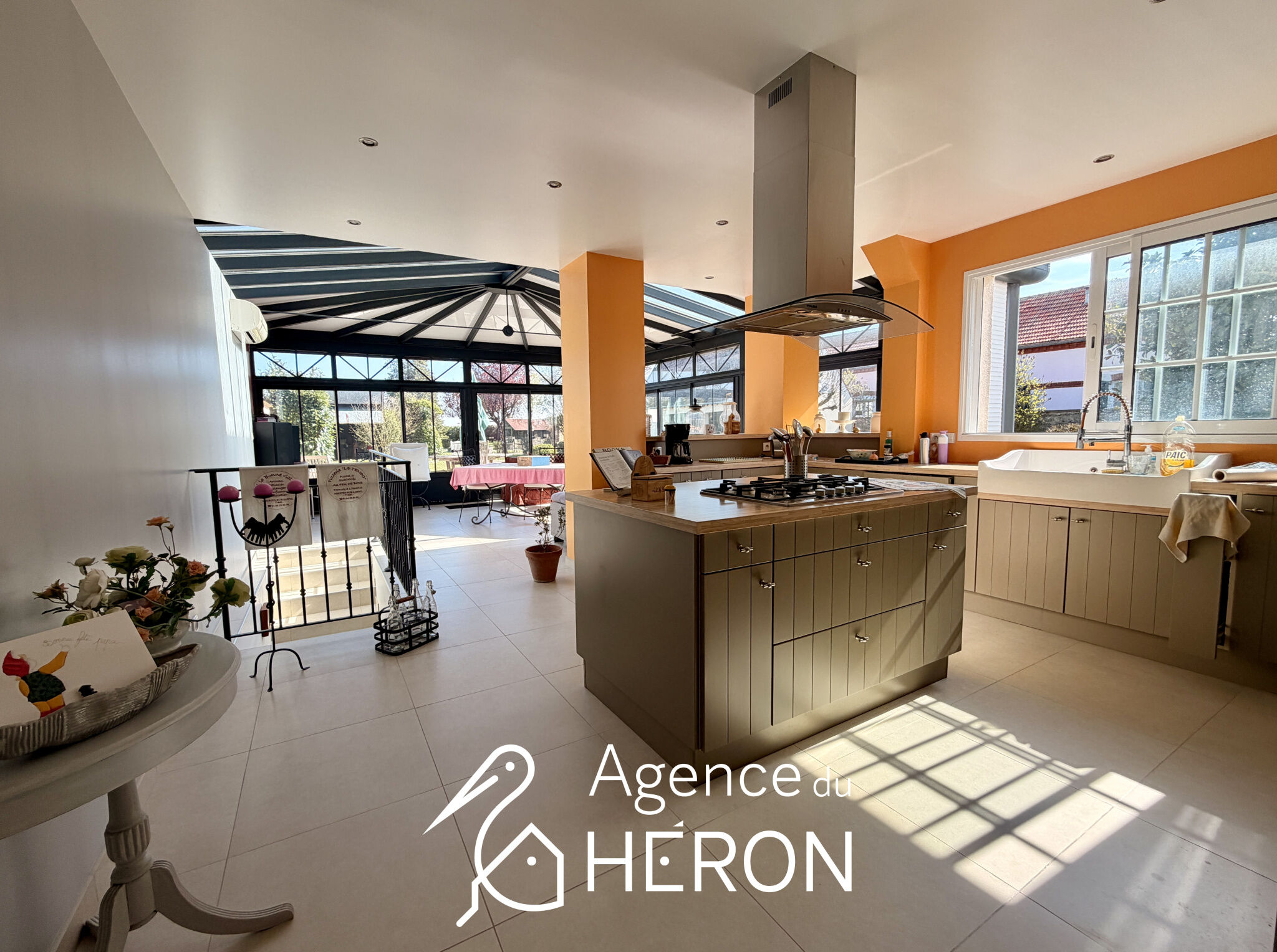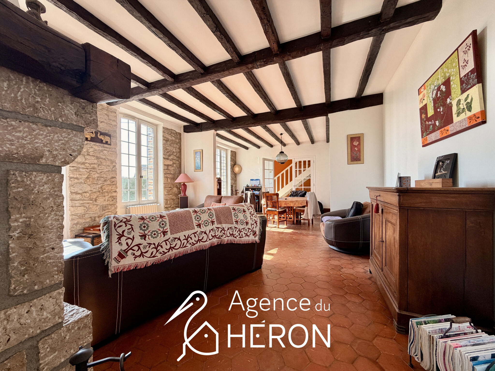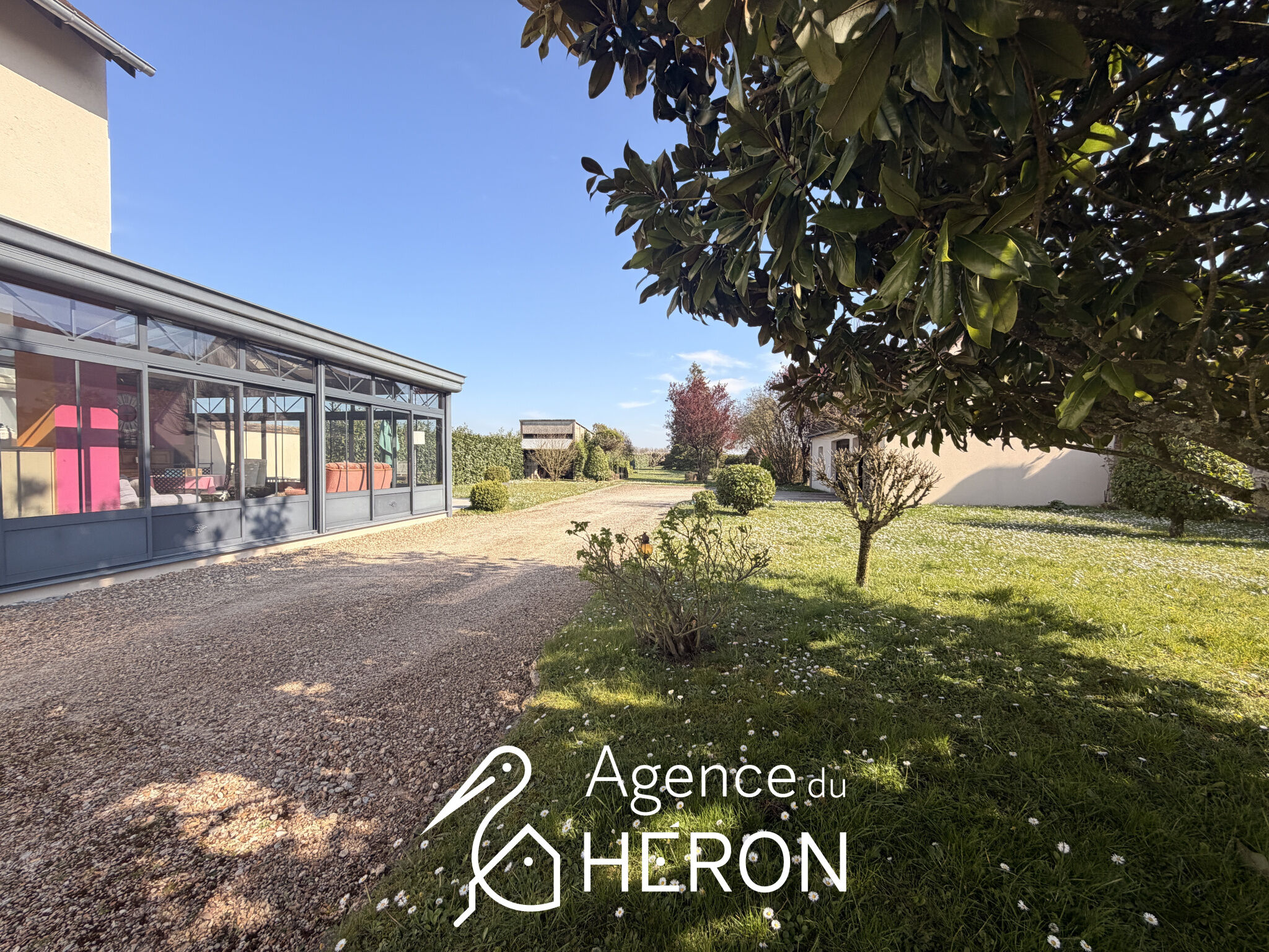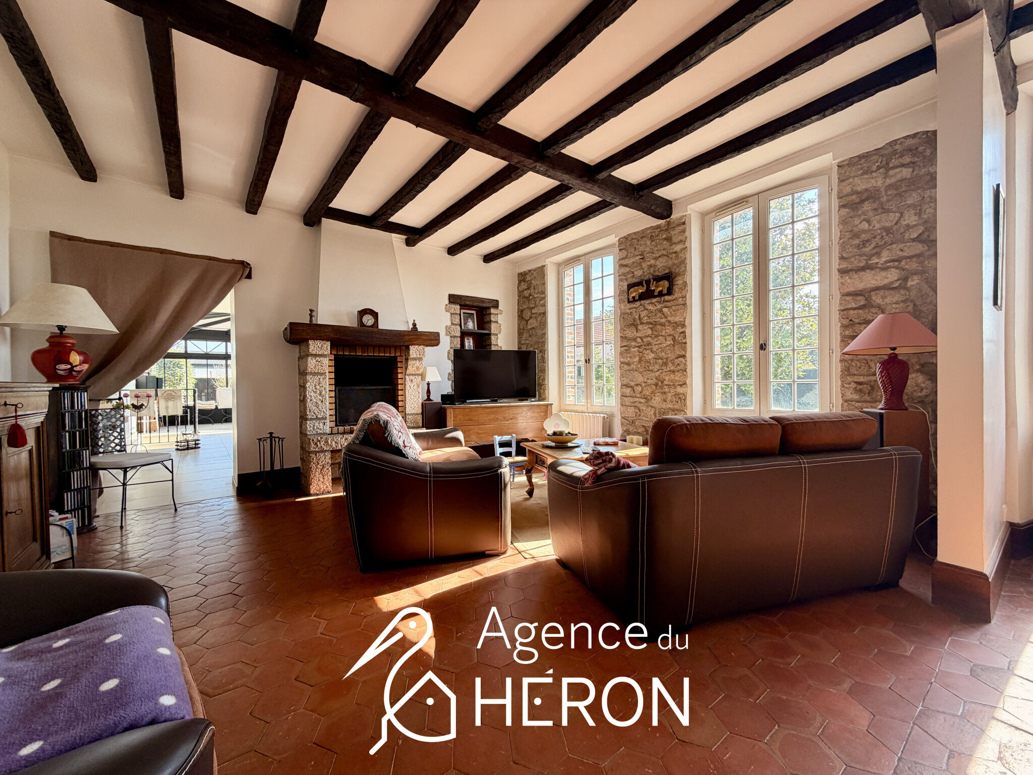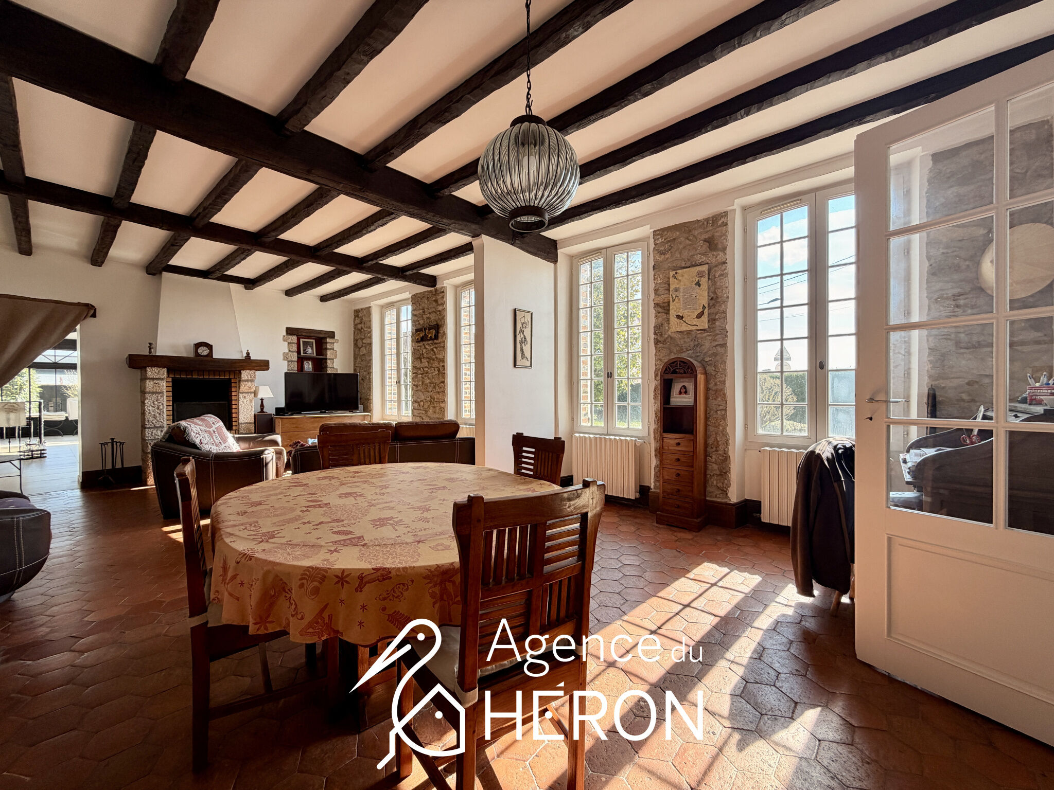 Coup de coeur assuré pour cette charmante longère de 191 m² habitables composée au rez-de-chaussée comme suit : entrée, une pièce pouvant servir de chambre ou de bureau, une salle de douches (douche à l'italienne), un wc, un double séjour lumineux (41 m²) avec cheminée alliant le charme des tomettes et des mur en pierre, une magnique véranda (59 m²) aménagée en cuisine et salle à manger avec accès à une première cave. À l'étage, un couloir desservant quatre chambres spacieuses dont une avec salle de douches et wc. Terrasse de 30 m². Double garage. Cave. Abri de jardin avec toiture neuve. Le tout sur un beau terrain clos et arboré de 1800 m². Les + : les avantages de la campagne sans les inconvénients : proximité immédiate de la ville tout en étant au calme. Cheminée à foyer ouvert. Pompes à chaleur pour la véranda.