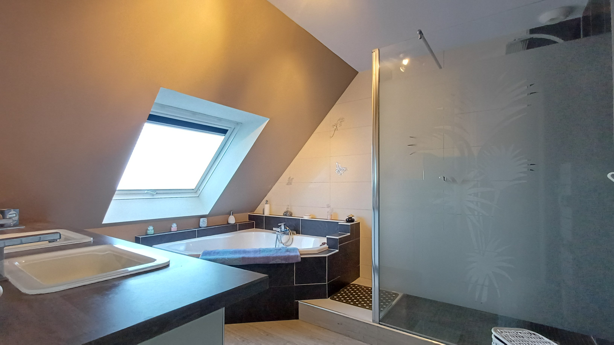 A l'étage : un palier desservant 3 chambres confortables, ainsi qu'une salle de bains avec baignoire et douche et WC.