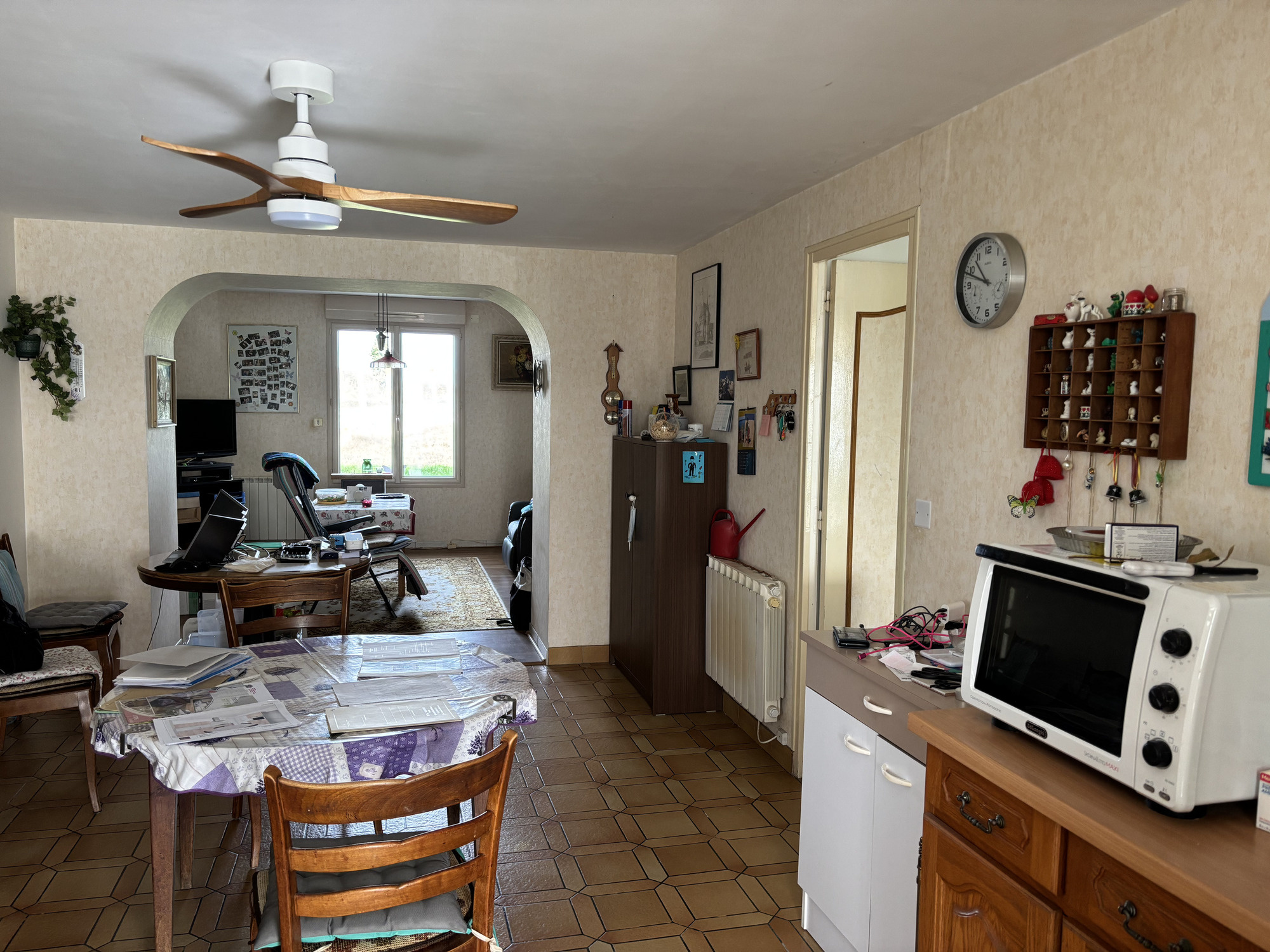La porte de gauche mène au salon, qui comprend d'abord un coin repas équipé d'un poêle à pellets, puis se prolonge vers le coin salon avec vue sur le jardin arrière. Depuis le coin salon, vous accédez à droite à la cuisine récemment rénovée, équipée de trois feux à gaz, d'une plaque de cuisson électrique et d'un four. À côté se trouve un petit local avec un raccordement pour une machine à laver et le chauffe-eau.