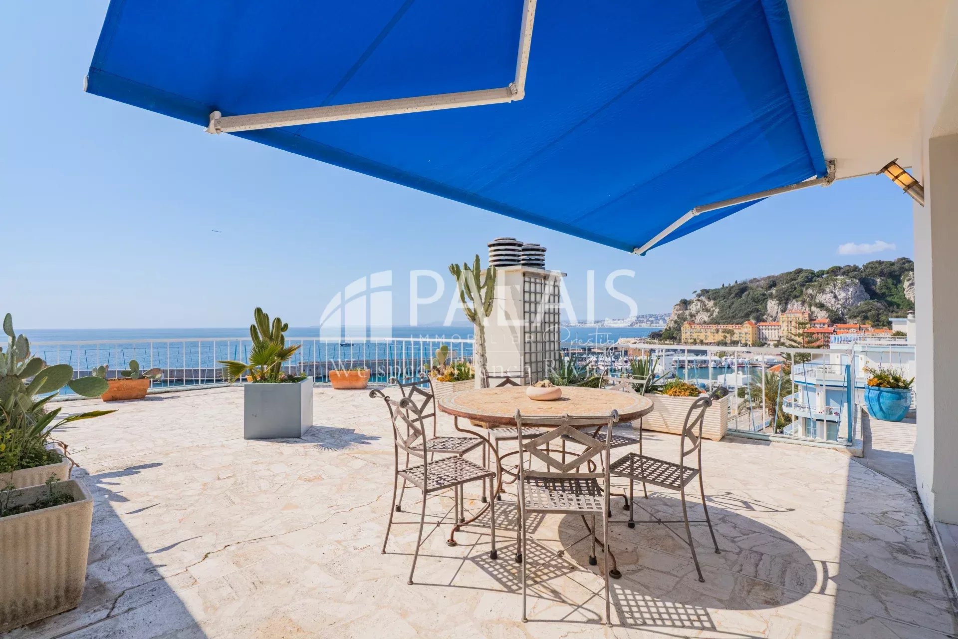 Nous avons le plaisir de vous présenter en Exclusivité ce rarissime appartement en dernier étage avec vue panoramique mer, entrée du port, la baie des Anges, ainsi que le Mont Boron.
