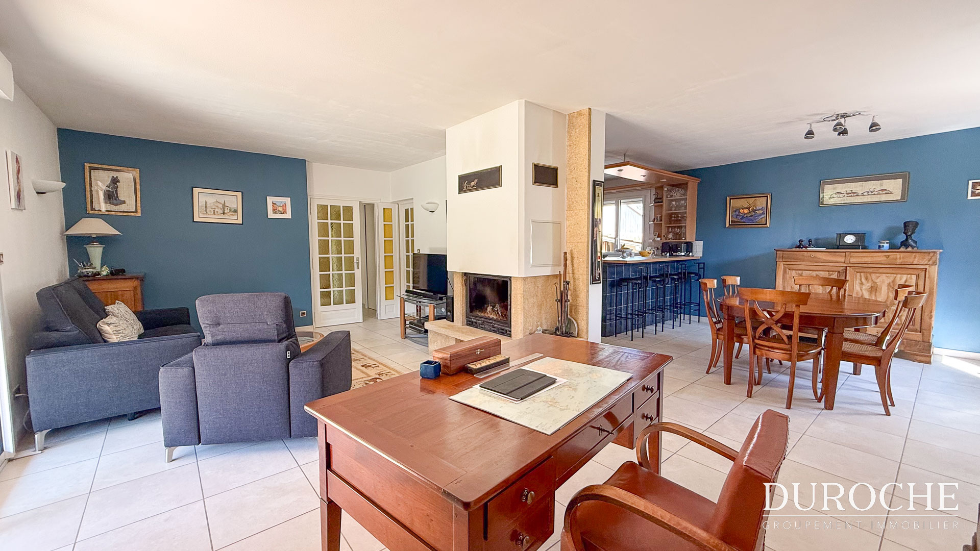 Dès l'entrée, vous profitez d'un intérieur chaleureux avec des matériaux de qualité et un agencement pensé pour le confort au quotidien. La maison propose une pièce de vie lumineuse d'environ 53 m2, composée d'un salon, d'un séjour et d'une cuisine, offrant de beaux volumes et une belle ouverture sur l'extérieur. Cet espace est équipé d'une climatisation, d'une cheminée avec insert et bénéficie d'un excellent confort thermique.
