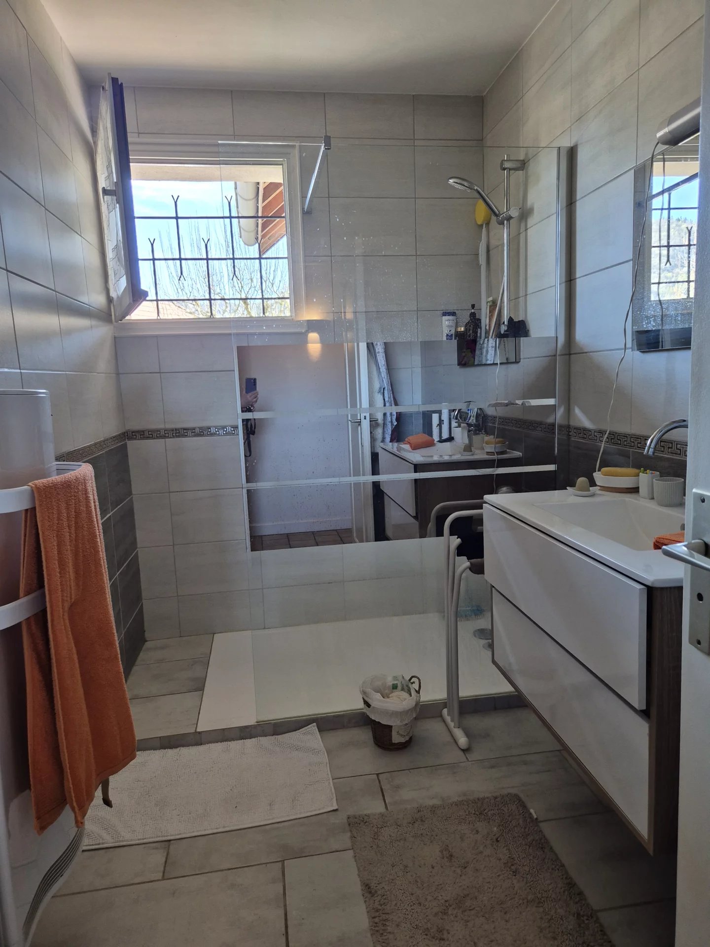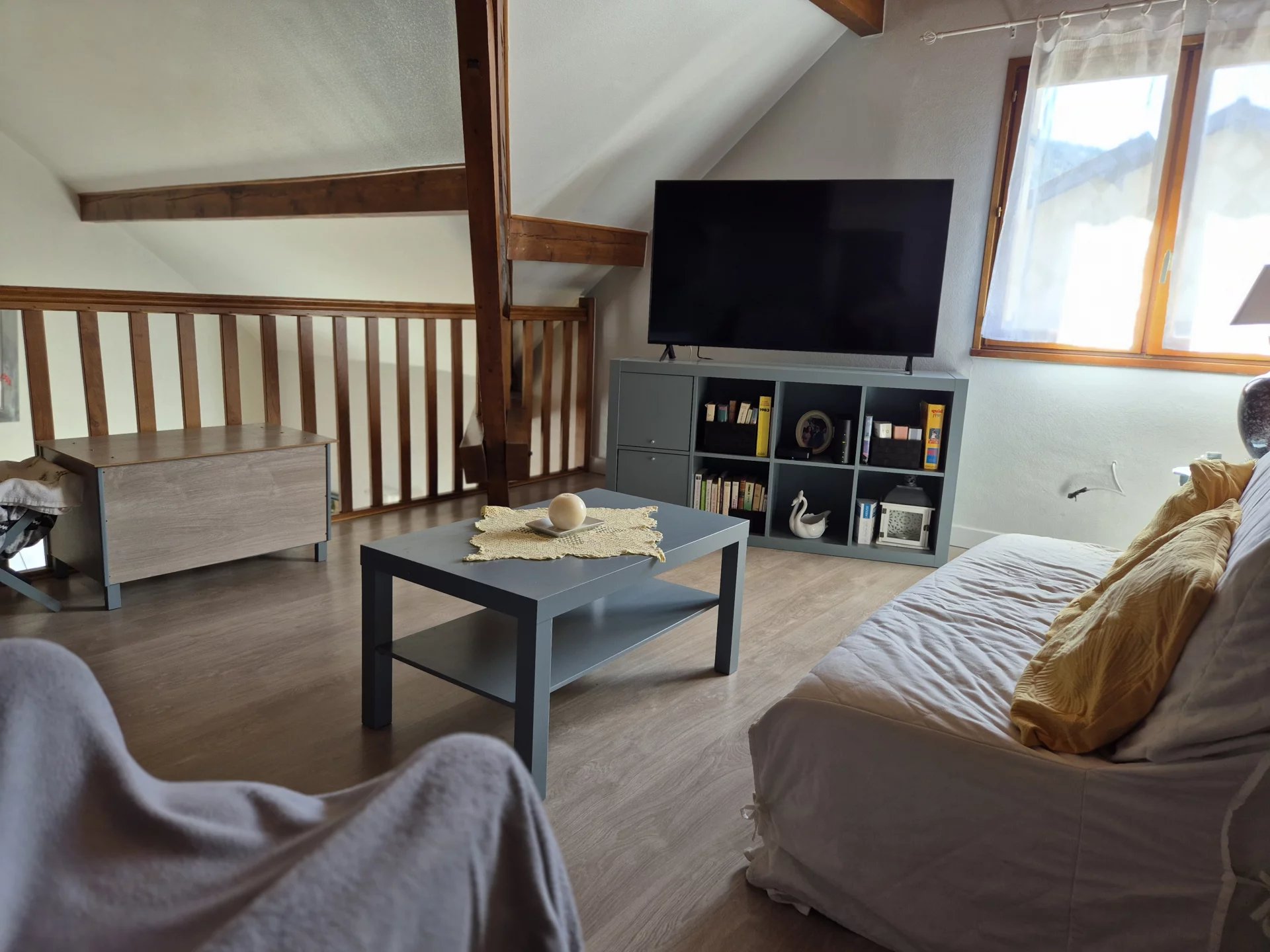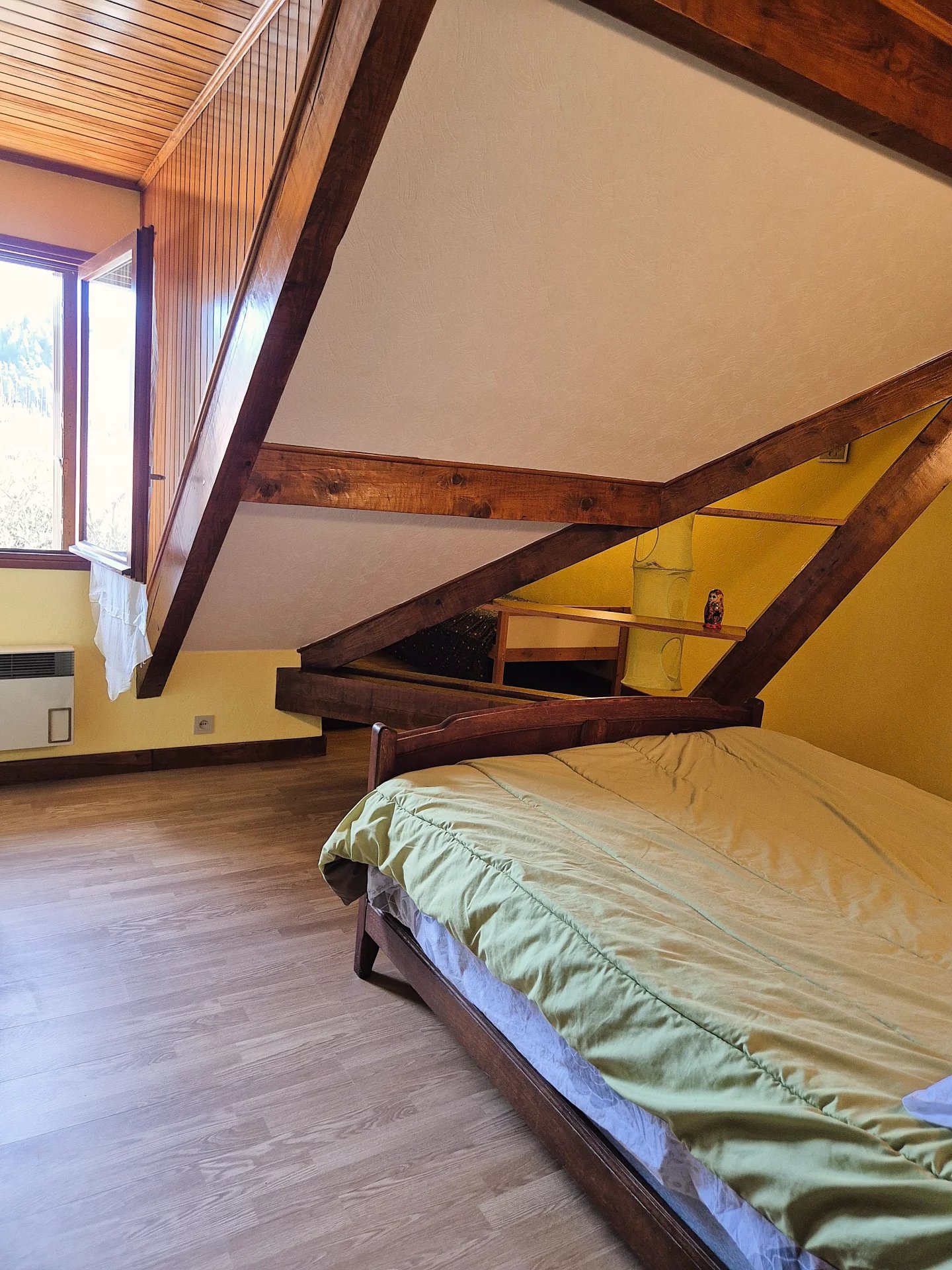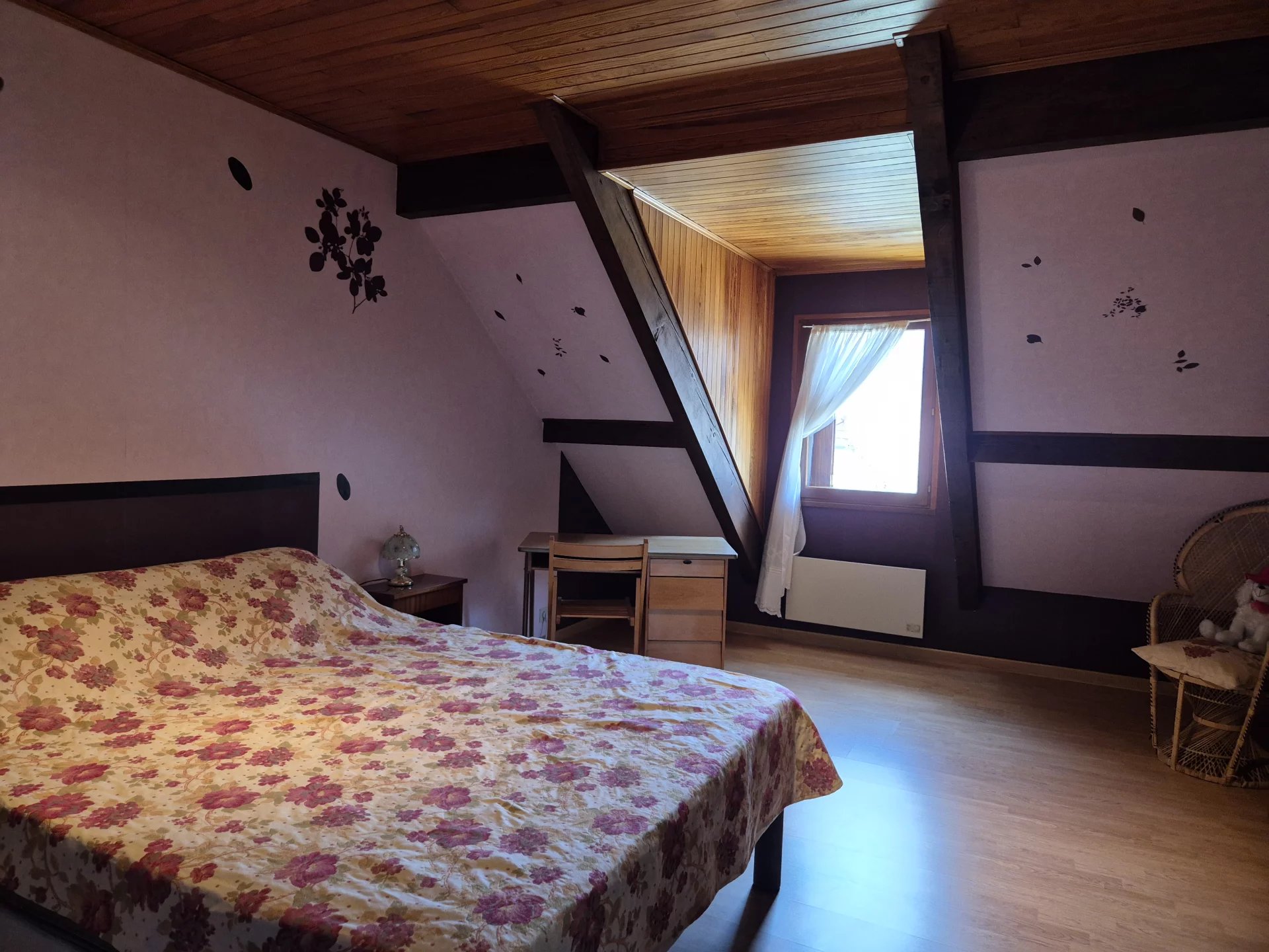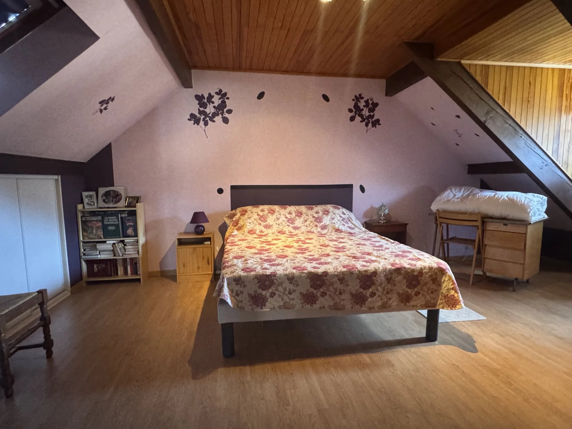À l'étage, une belle mezzanine offre un agréable espace ouvert, complété par deux chambres en partie mansardées et un deuxième WC avec lave-mains.