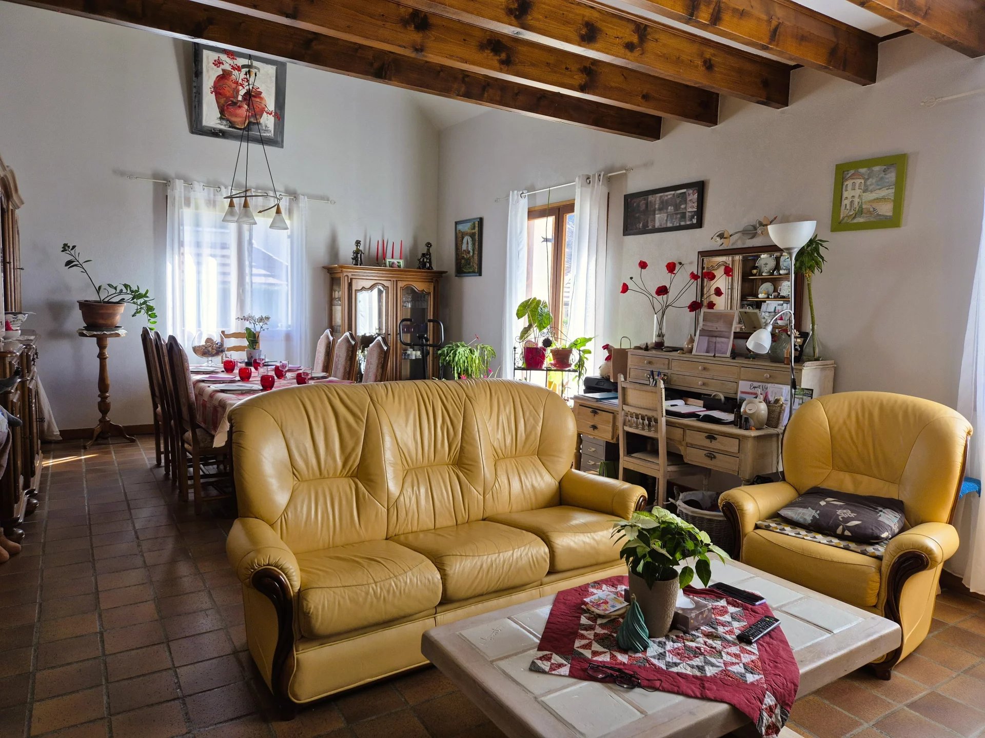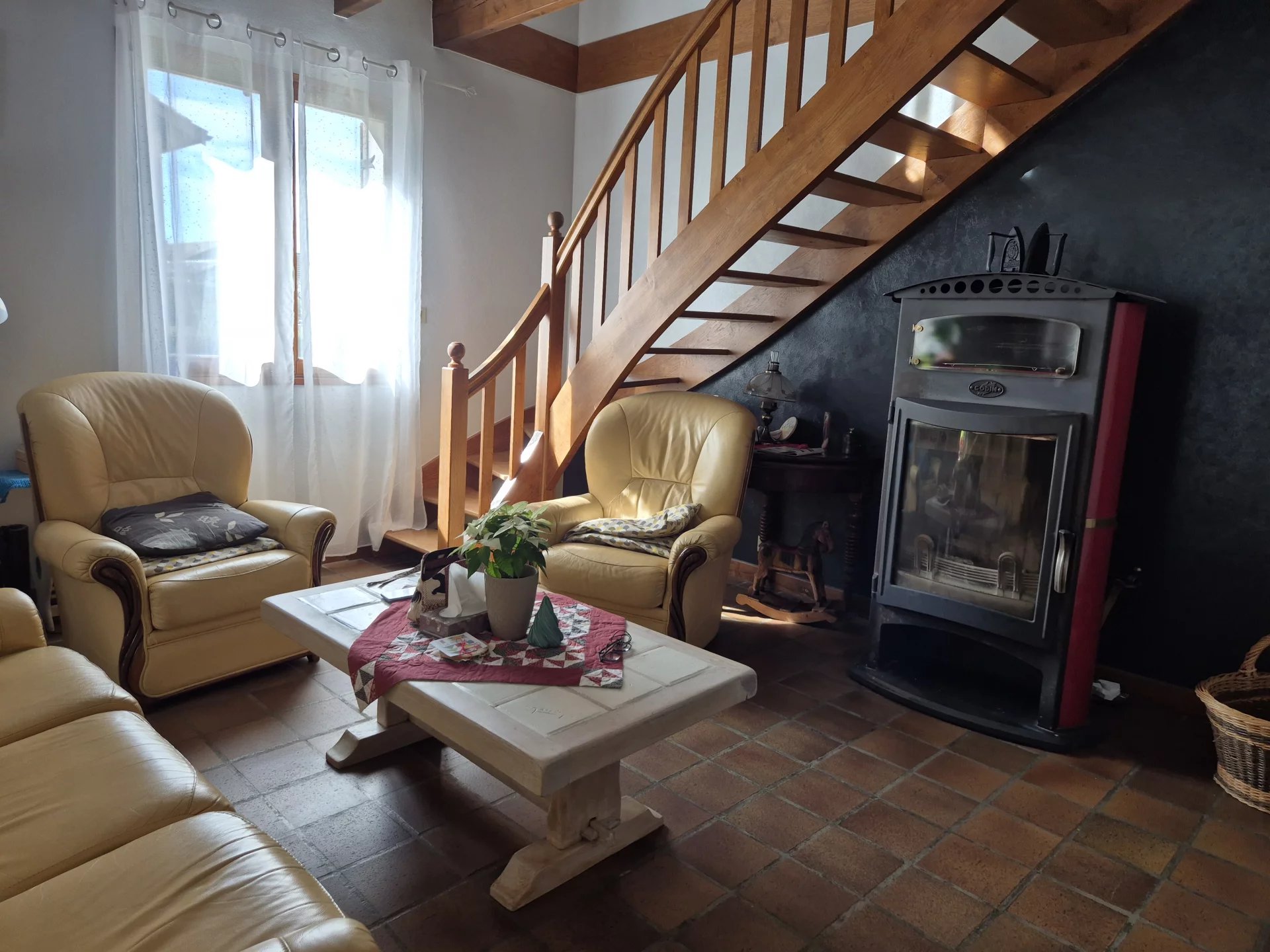Le rez-de-chaussée se compose d'une entrée desservant une cuisine équipée fonctionnelle avec accès direct à un cellier pratique et à une terrasse, un spacieux salon séjour de 36 m² doté d'un poêle à bois, ainsi que de deux chambres équipées de placards intégrés, un wc avec lave-mains et une salle d'eau récente (douche à l'italienne).