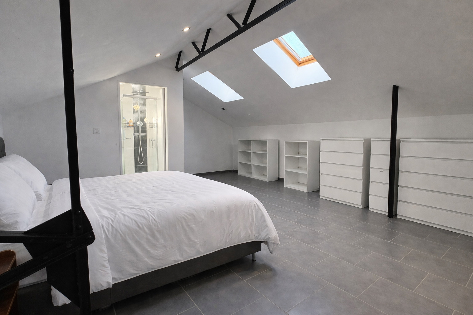 Le dernier niveau accueille une vaste chambre parentale avec sa propre salle d'eau et dressing. Cet espace peut également être aménagé en salle de jeux ou en bureau pour le télétravail, selon vos besoins.