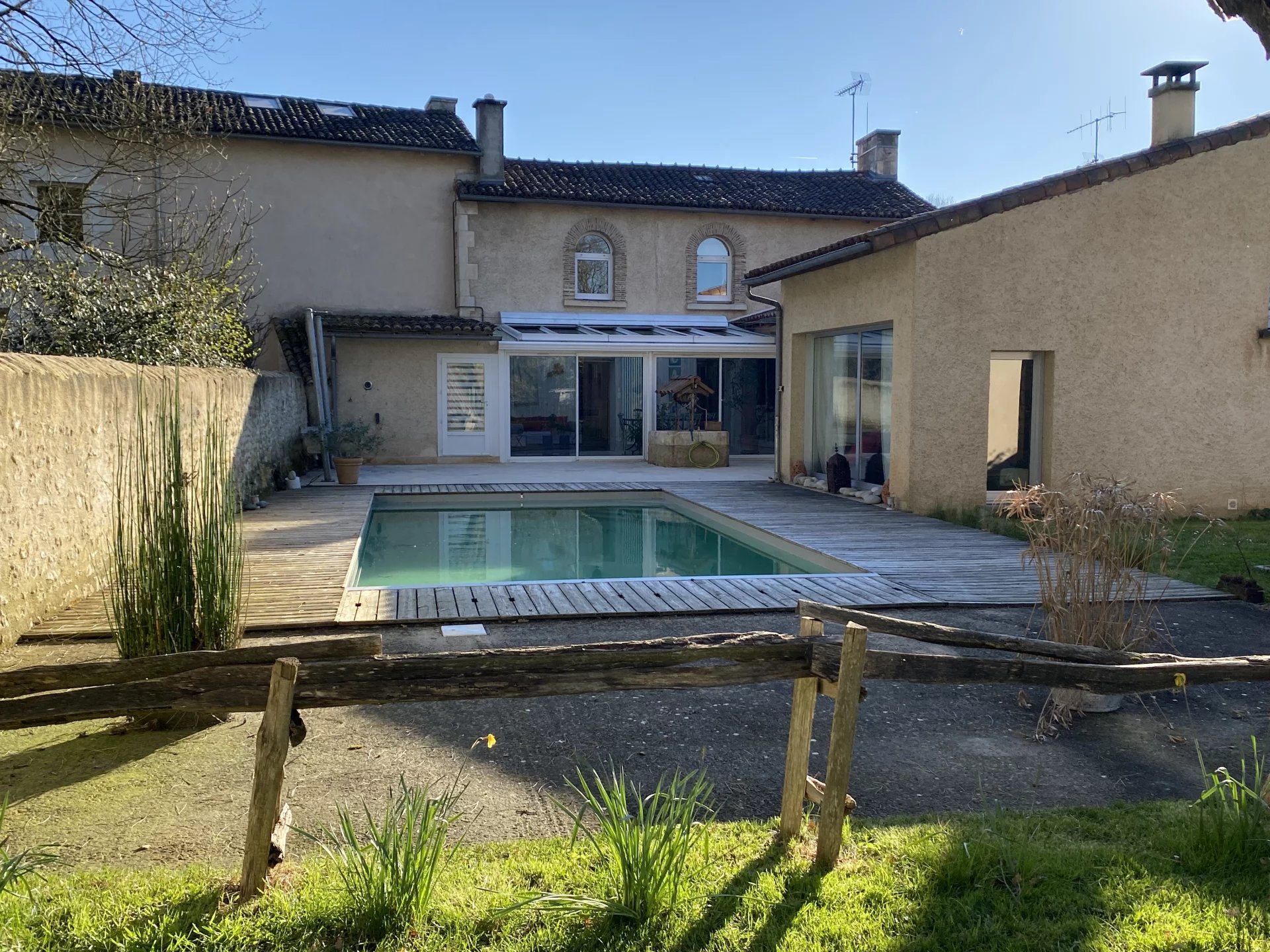 A seulement 15 minutes du centre-ville de Poitiers, dans une commune agréable, charmante maison ancienne totalement restaurée avec goût et matériaux de qualité offrant sur 197 m² et deux niveaux: au rez-de-chaussée, une entrée desservant un grand salon avec cheminée, une cuisine équipée et dînatoire, une grande véranda chauffée avec accès sur une terrasse et la piscine, un vaste salon-bureau avec accès à la terrasse et une chambre en mezzanine, une salle d'eau-wc, un espace lingerie-chaufferie; à l'étage, trois chambres lumineuses, une salle d'eau-wc.