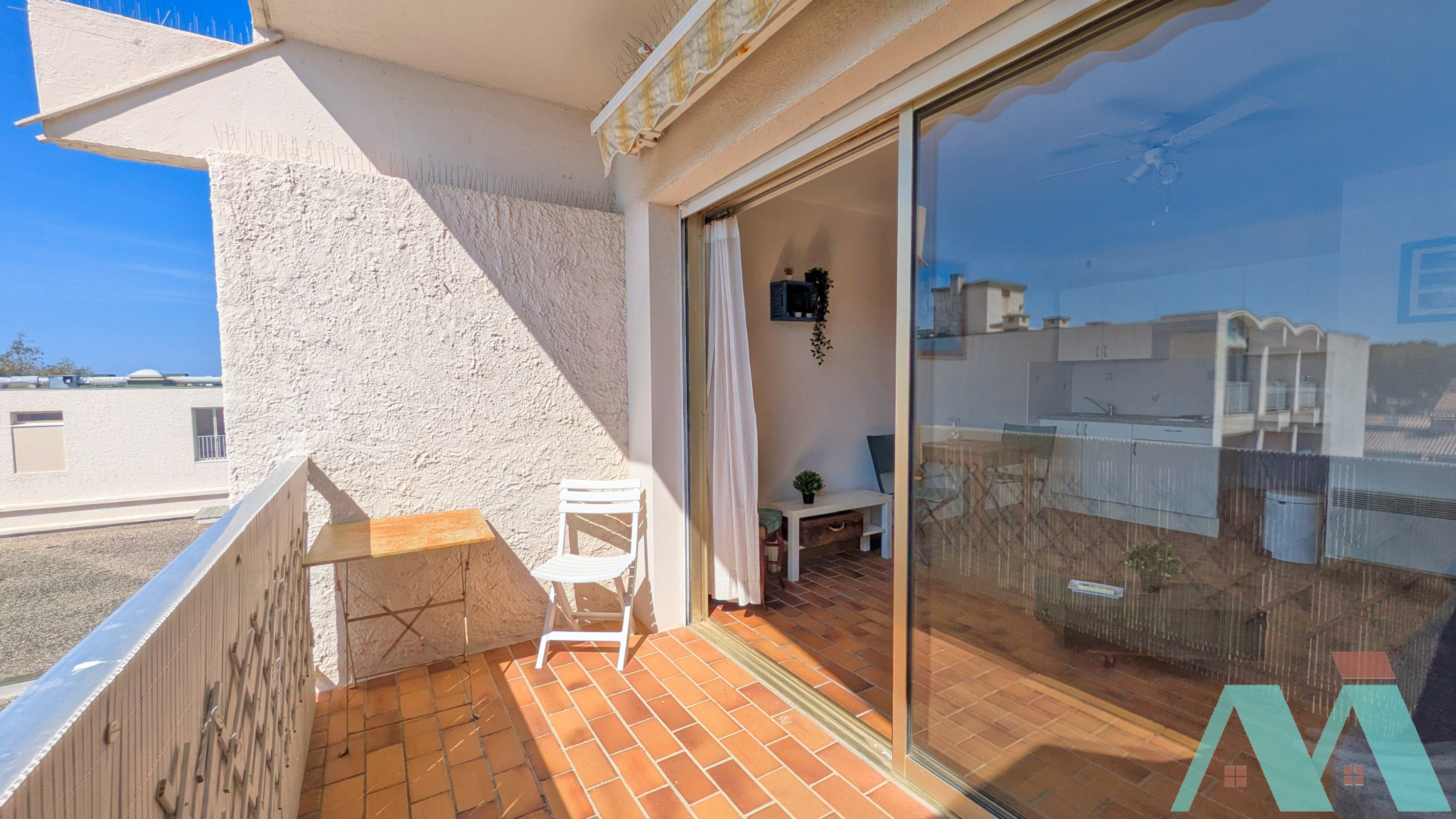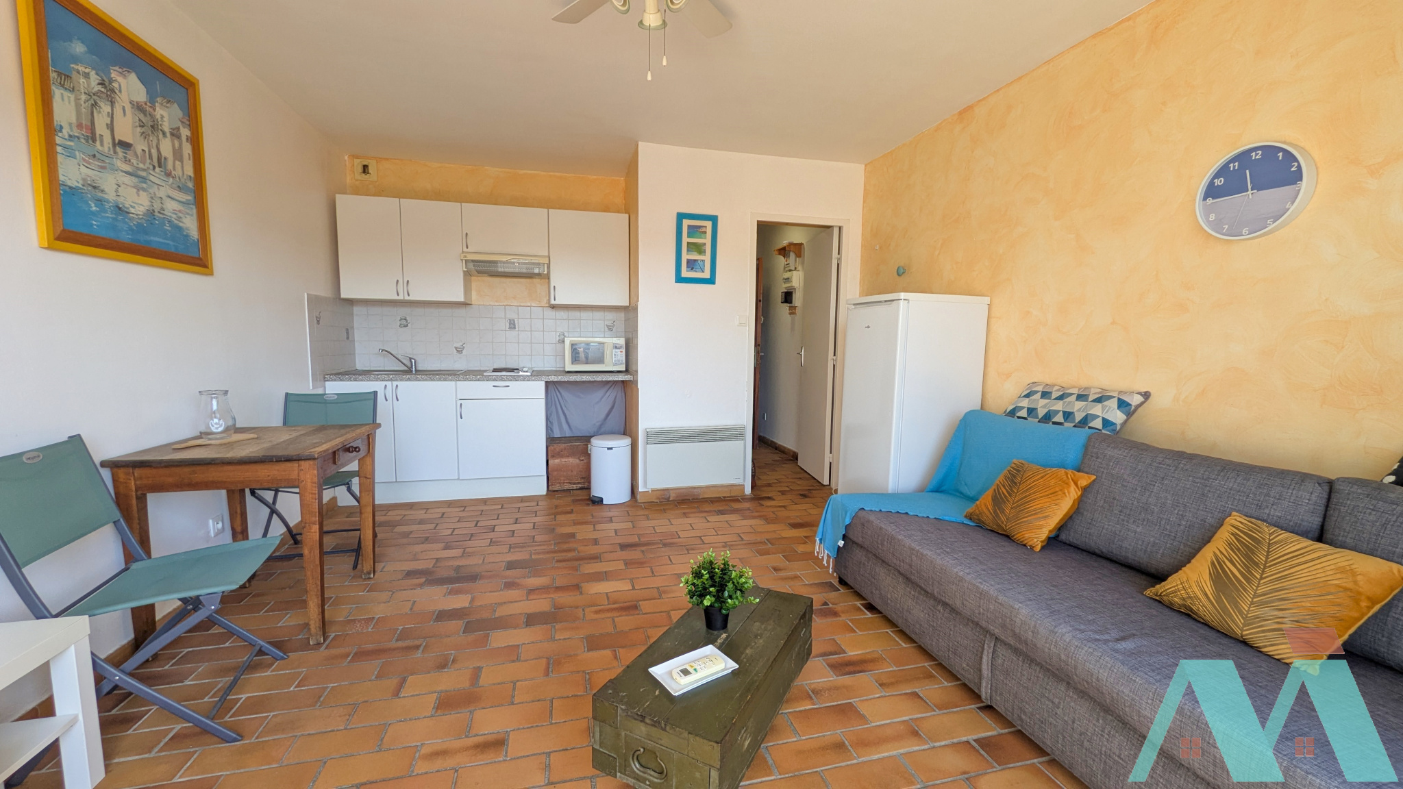 Situé au 2ème et dernier étage d'une résidence fermée, à proximité des commerces, restaurants et de la mer, le studio offre une lumineuse pièce à vivre (plein sud), séjour avec kitchenette équipée, donnant sur le balcon et sa vue dégagée (aperçu mer). L'entrée dispose d'un placard et la salle d'eau avec wc est fonctionnelle, même si elle mériterait une mise au goût du jour.