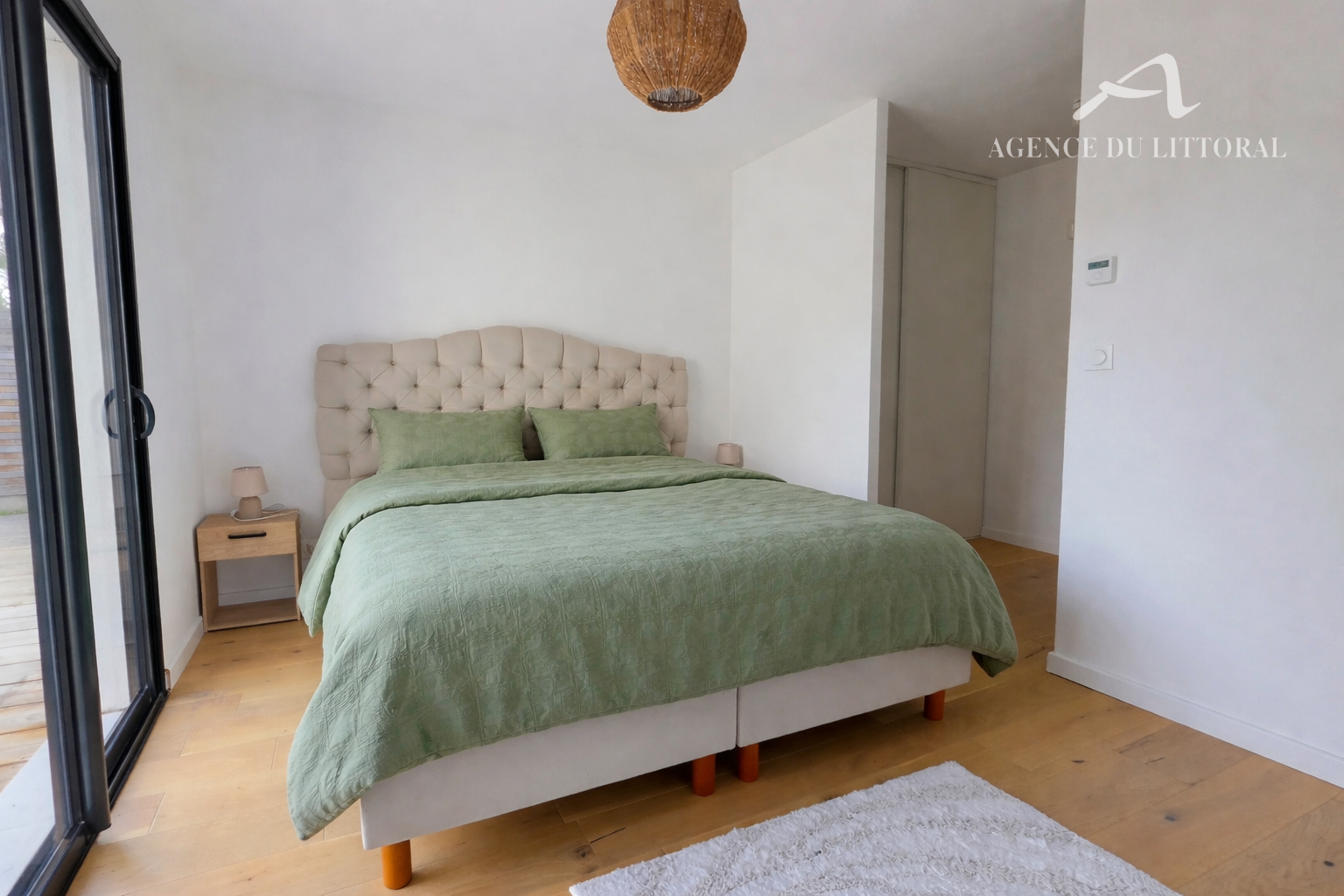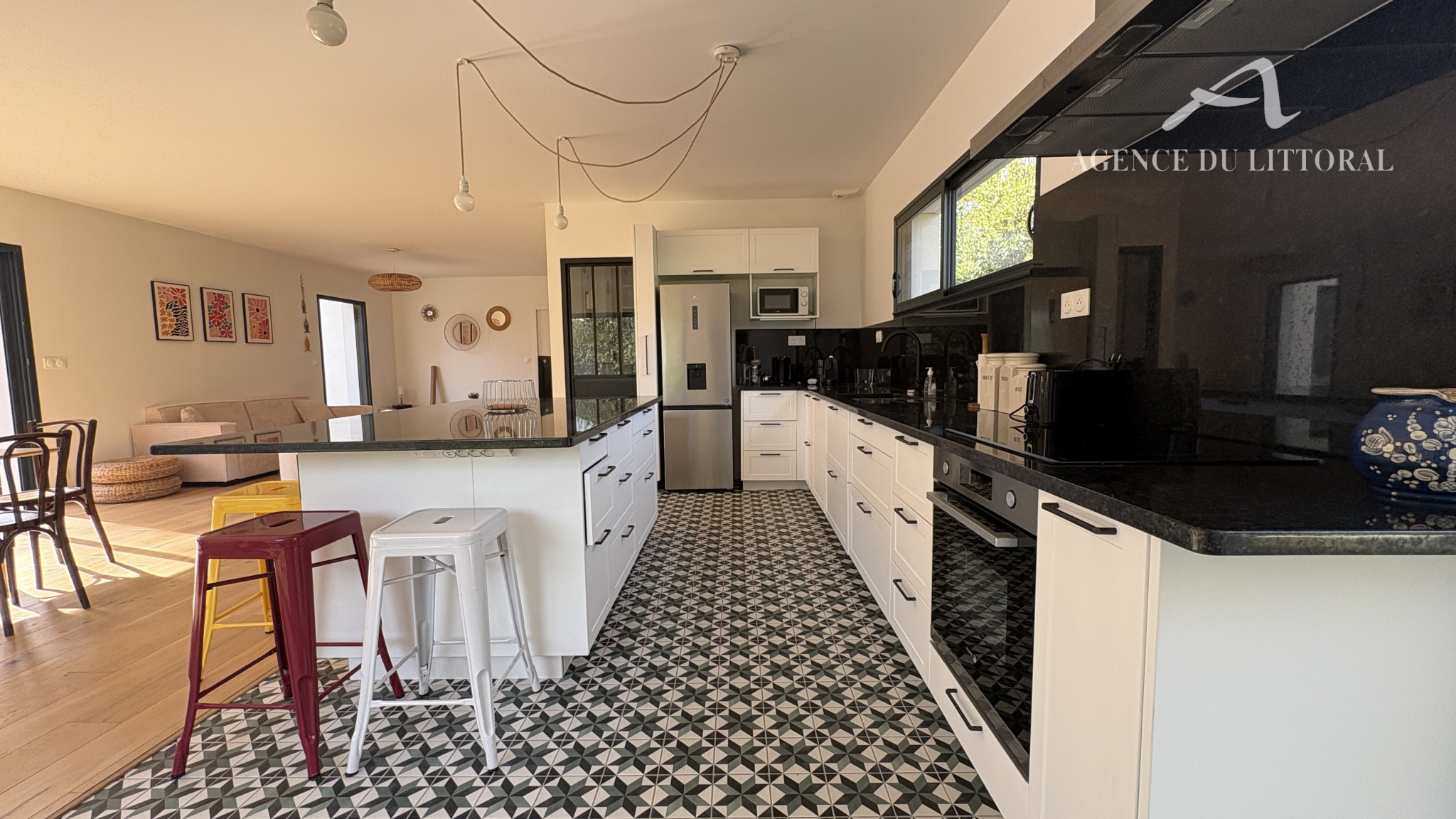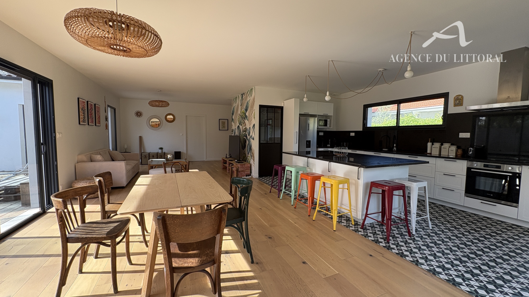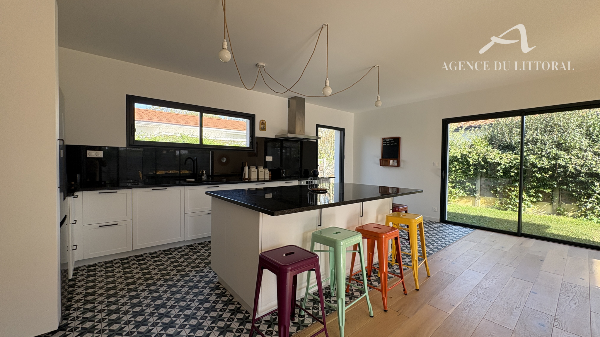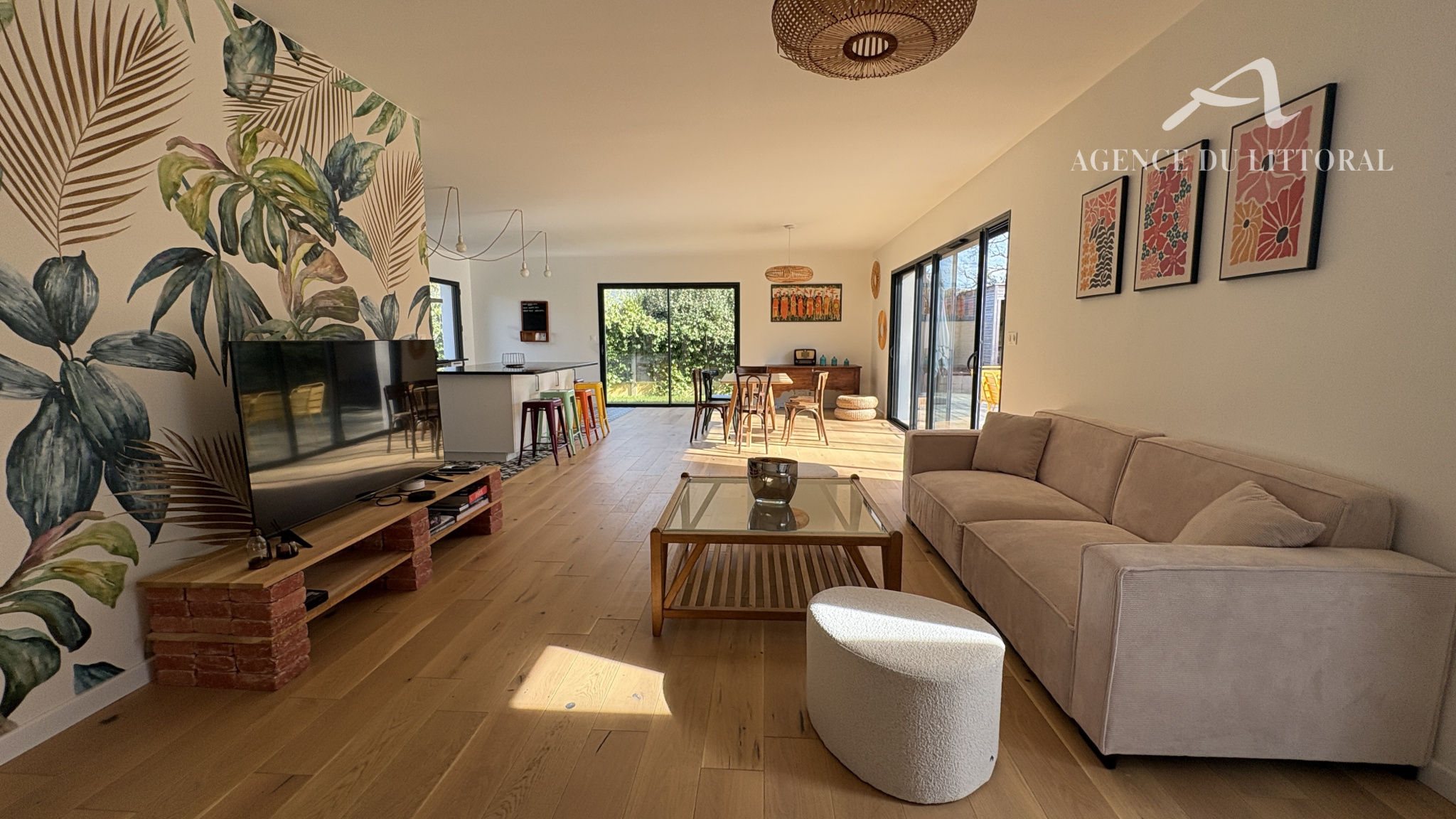 L'agence du Littoral vous propose de découvrir cette superbe maison contemporaine de plain-pied construite en 2021, située sur la commune d'Andernos-Les-Bains, proche plage et commerces, offrant une surface habitable de 131 m2. Elle se compose de trois chambres, dont une magnifique suite parentale avec son dressing, sa salle d'eau privative et ses wc. Les deux autres chambres disposent d'une salle de bain commune et d'un wc séparé, garantissant confort et intimité à toute la famille. Implantée sur un terrain de 600 m2, cette maison séduit par ses prestations modernes : piscine, panneaux photovoltaïques pour une meilleure performance énergétique, et de beaux volumes lumineux. Idéale pour profiter d'un cadre de vie agréable et sans travaux.