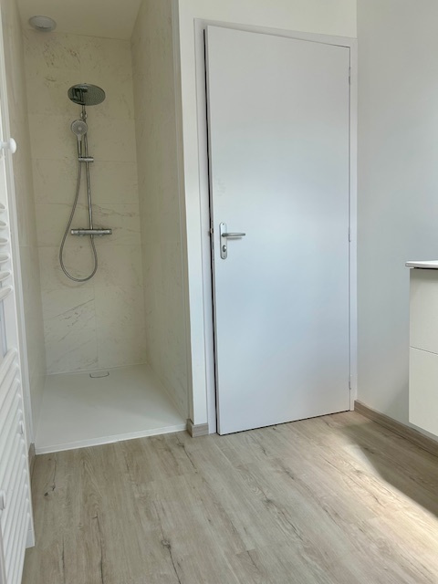Au rez-de-chaussée, vous découvrirez une pièce de vie lumineuse avec cuisine semi-équipée (plaque, hotte et évier), ainsi qu'un dégagement desservant une lingerie, une salle de bains et une chambre.
