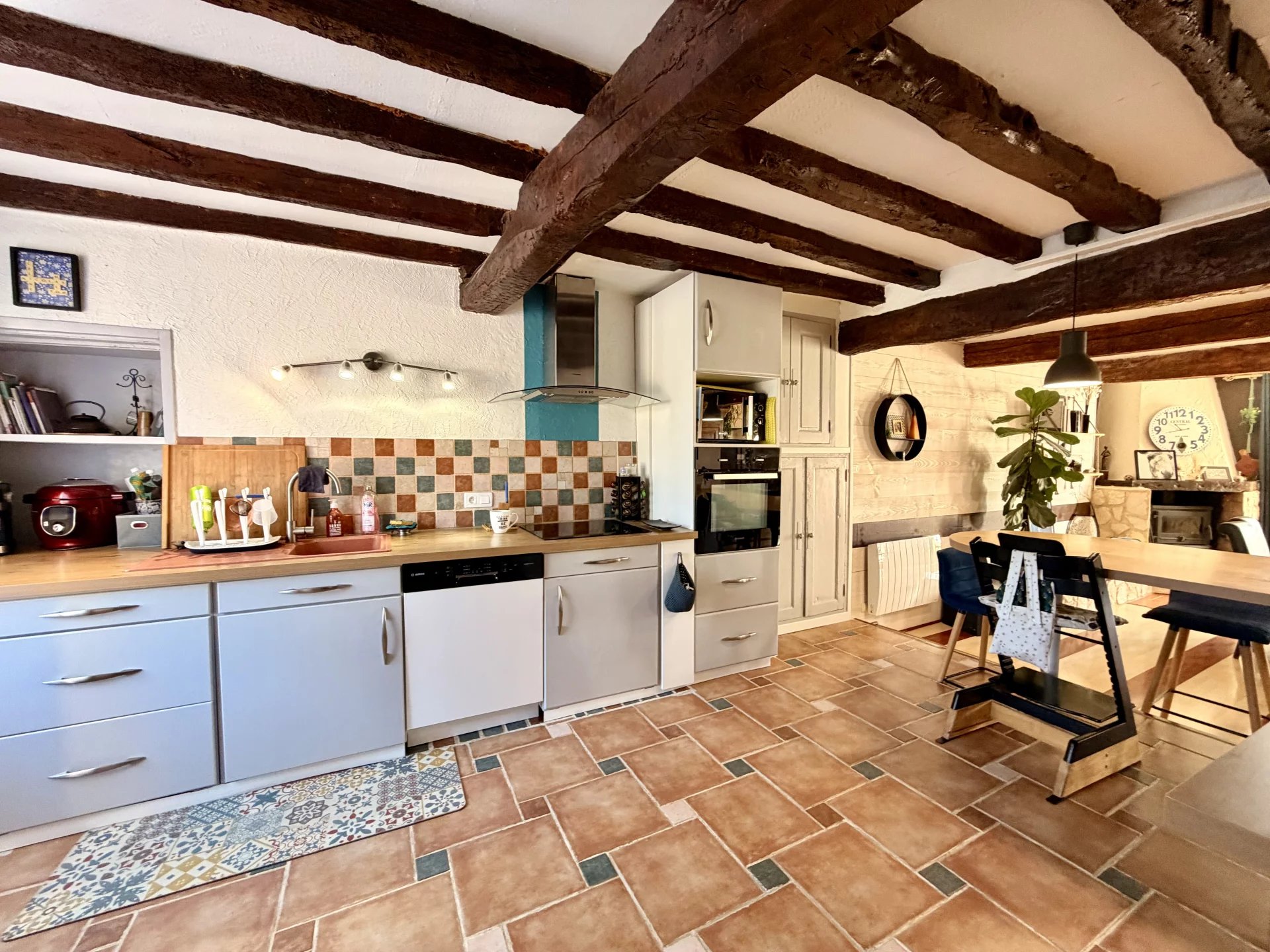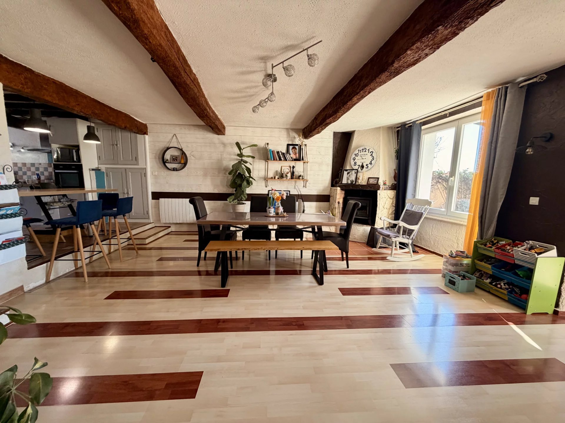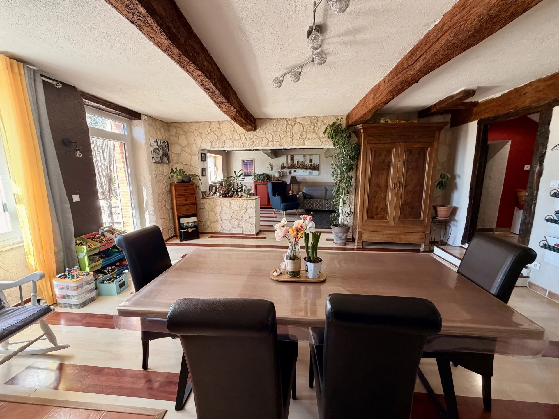 L'espace vie, avec ses généreux 67 m2, ouvre côté sud sur une terrasse pavée en pierres du Lot, avec pergola (store électrique), prolongée par le jardin.