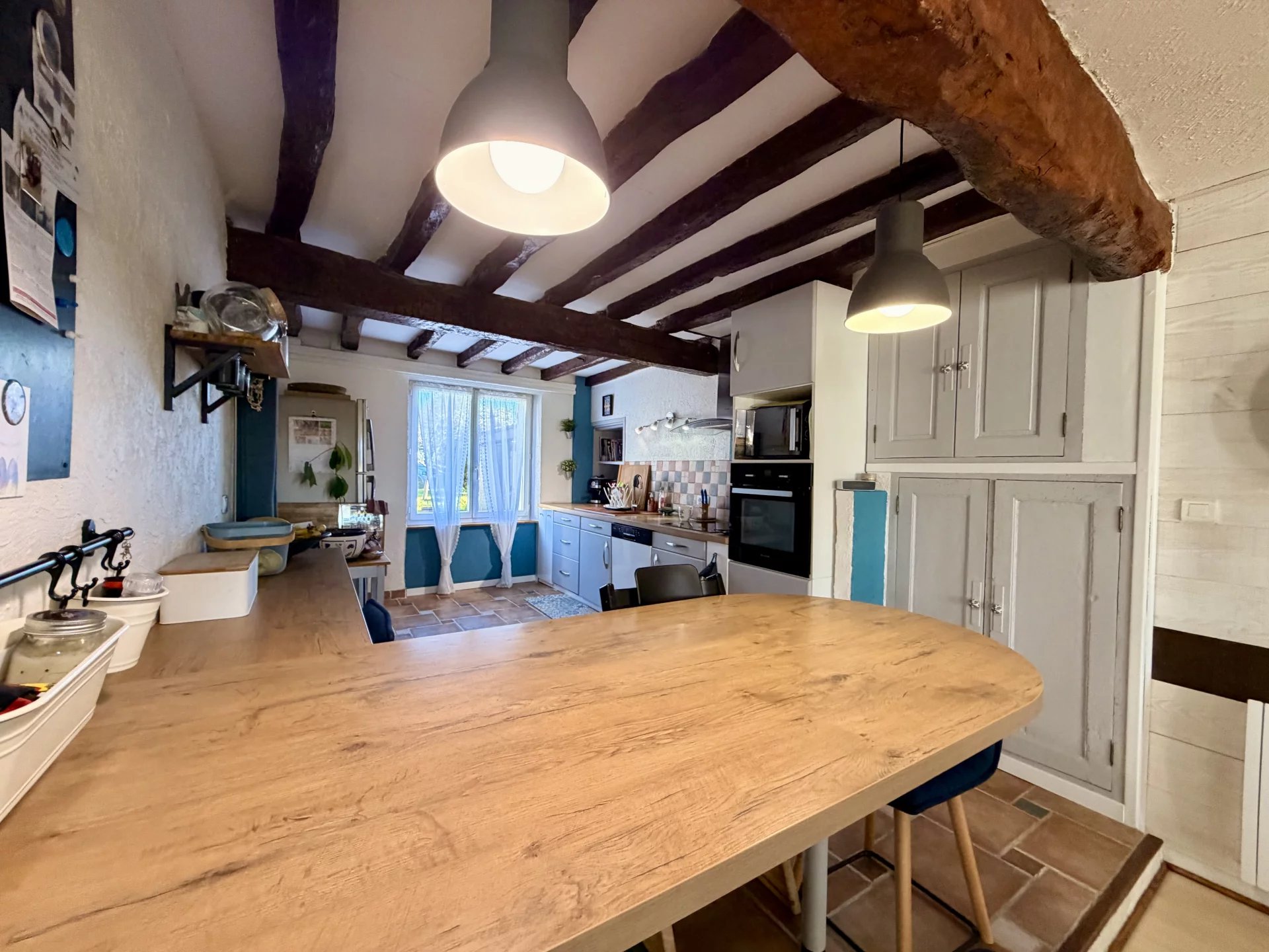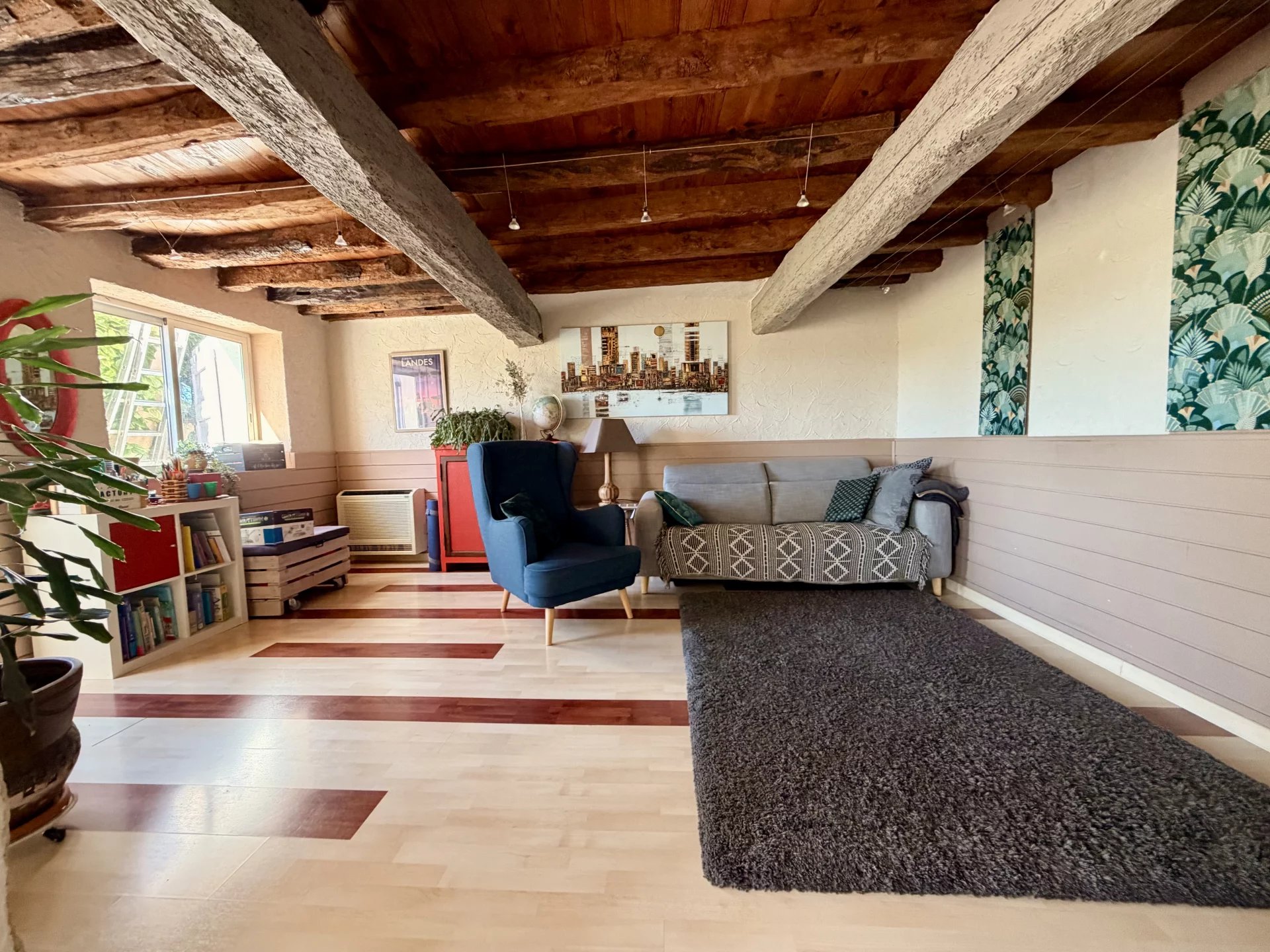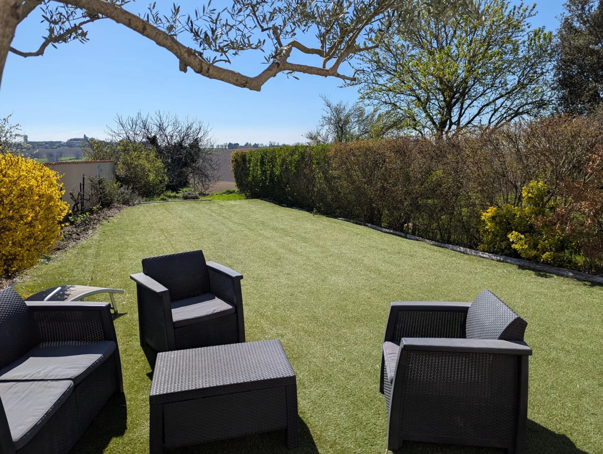 L'espace vie, avec ses généreux 67 m2, ouvre côté sud sur une terrasse pavée en pierres du Lot, avec pergola (store électrique), prolongée par le jardin.