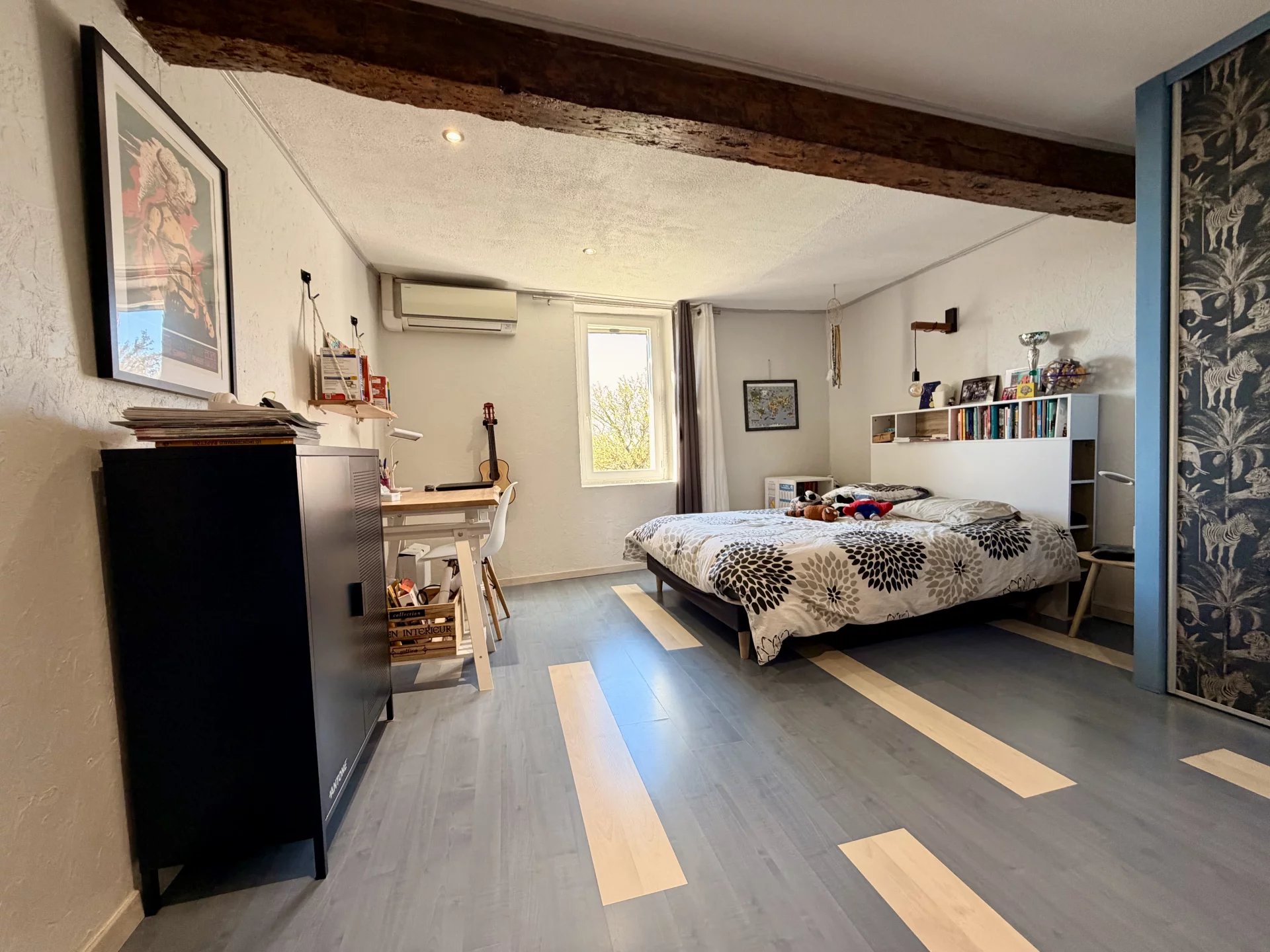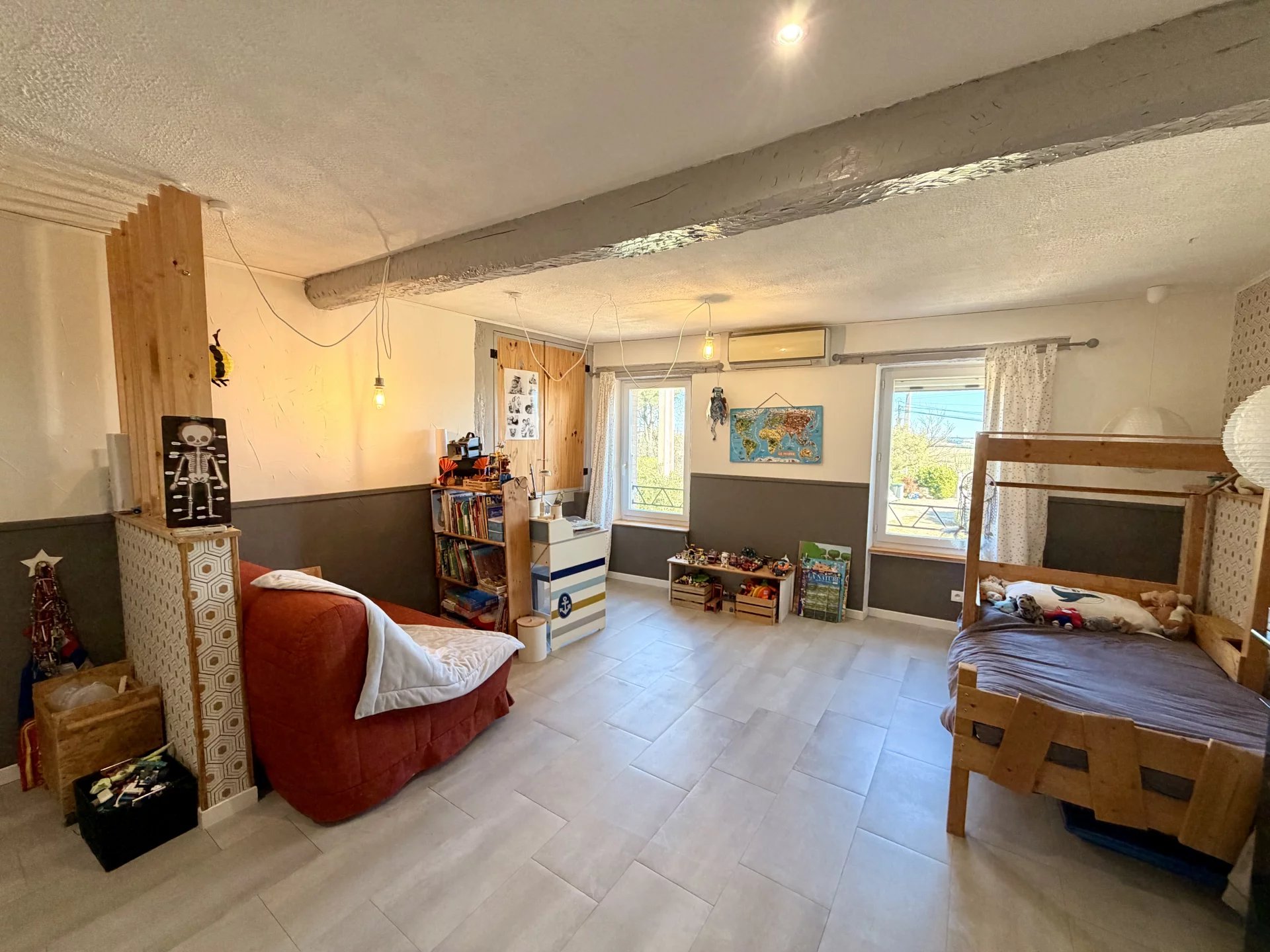 Les menuiseries sont en double vitrage, volets bois, chauffage mixte (climatisation réversible + radiateurs à inertie + poêle à bois), assainissement autonome.