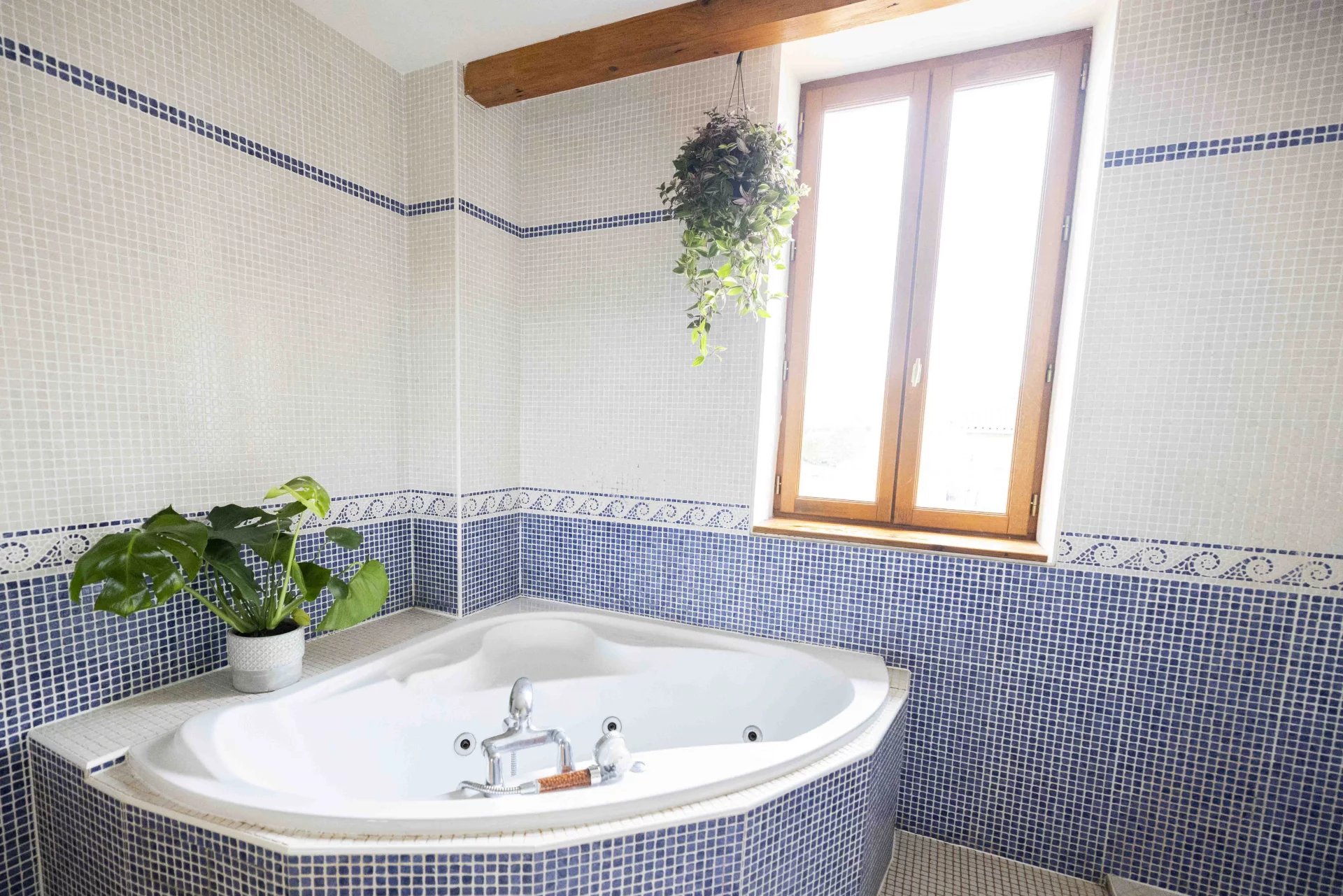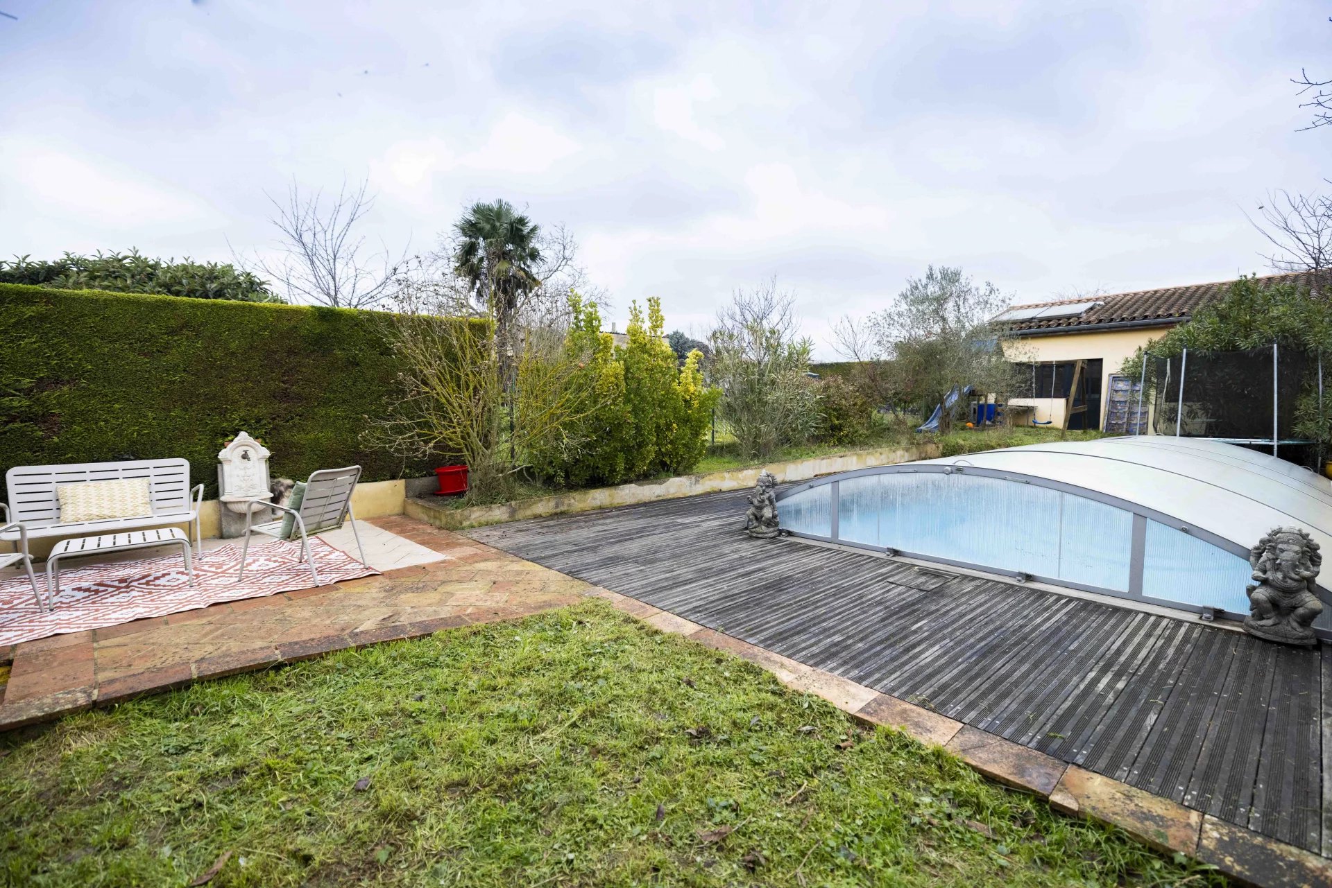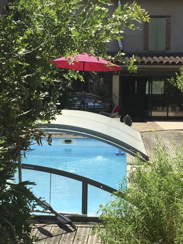 A l'extérieur, un jardin avec terrasses, une piscine (avec bassin couvert 3,50 m x 8,50 m, au sel)et un vaste garage de 60 m2 au sol (doublé, isolé avec belle hauteur sous-plafond), qui offre ainsi un beau potentiel.