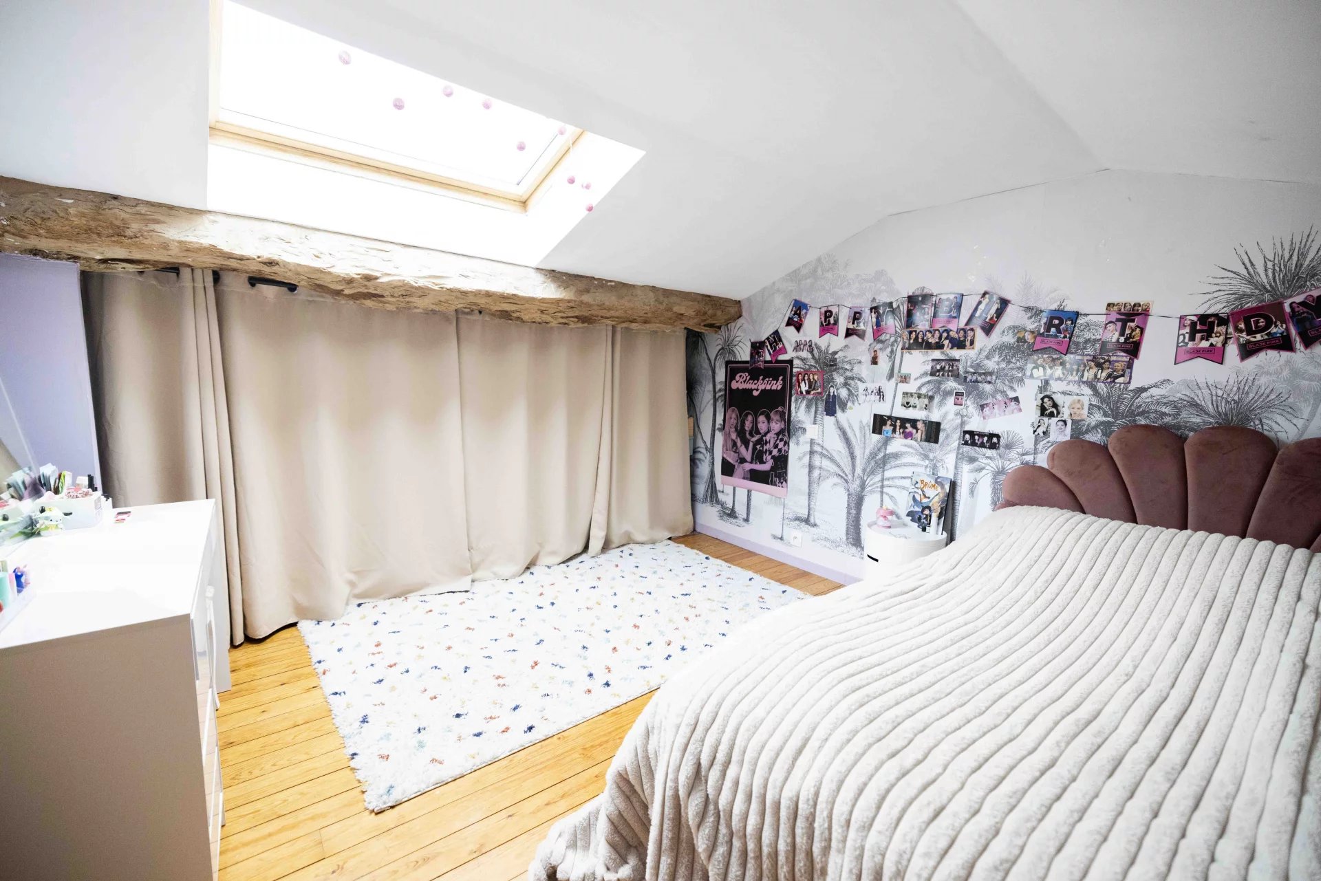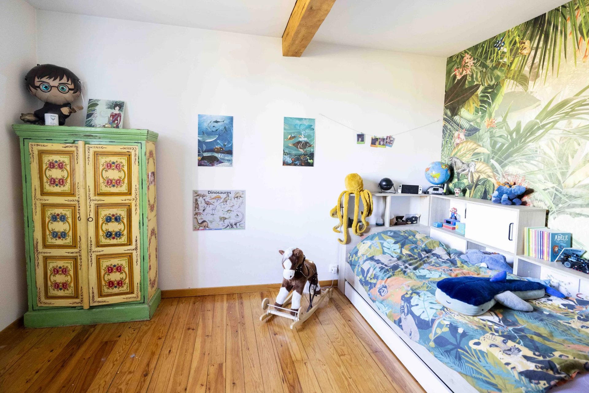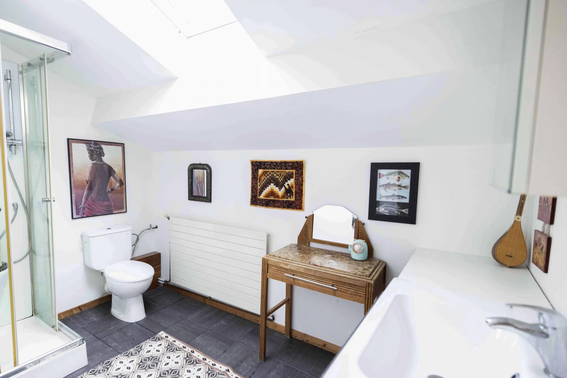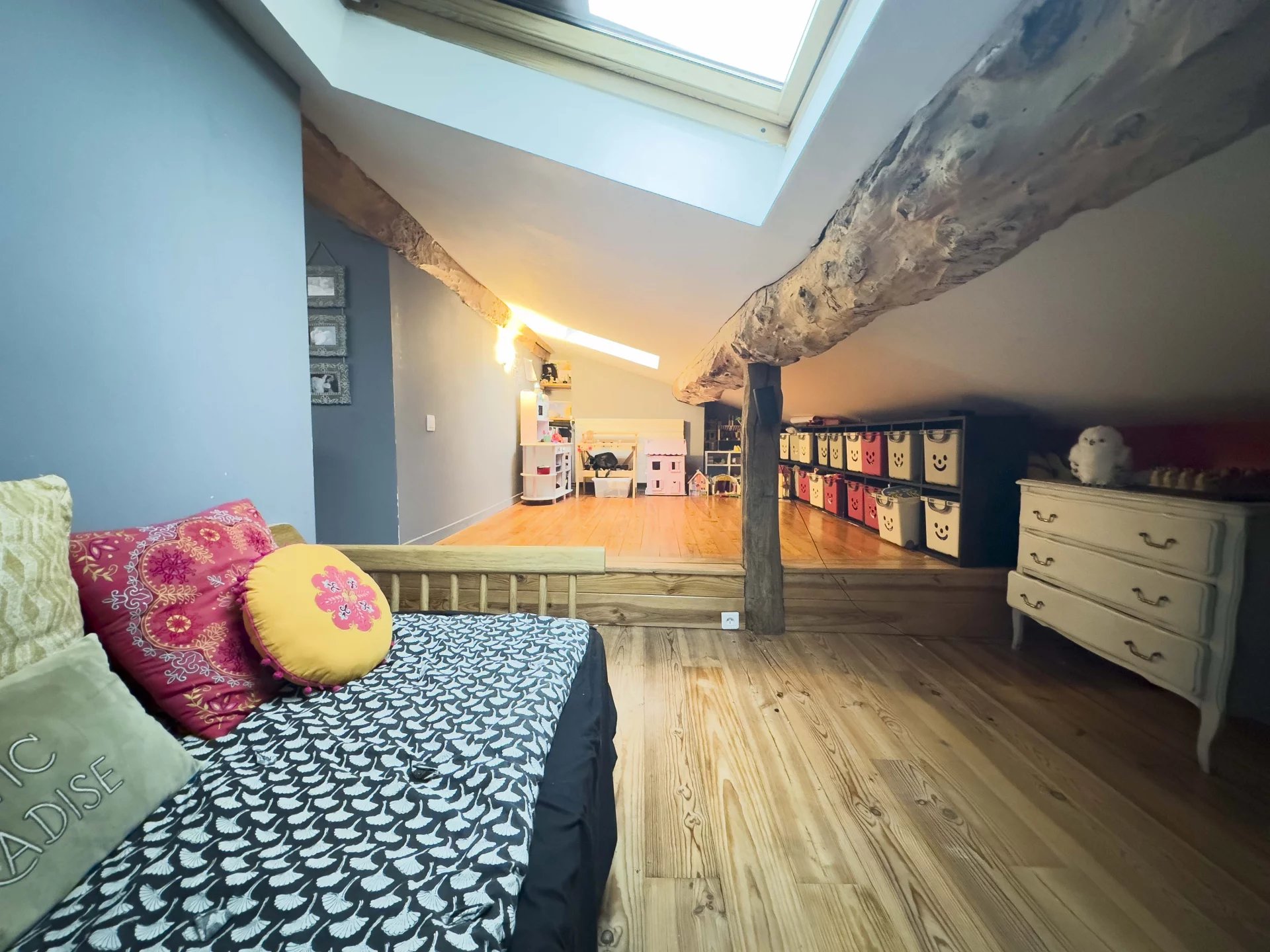 A l'étage supérieur, les combles ont été aménagés en 2 chambres mansardées ainsi qu'une salle d'eau-wc.