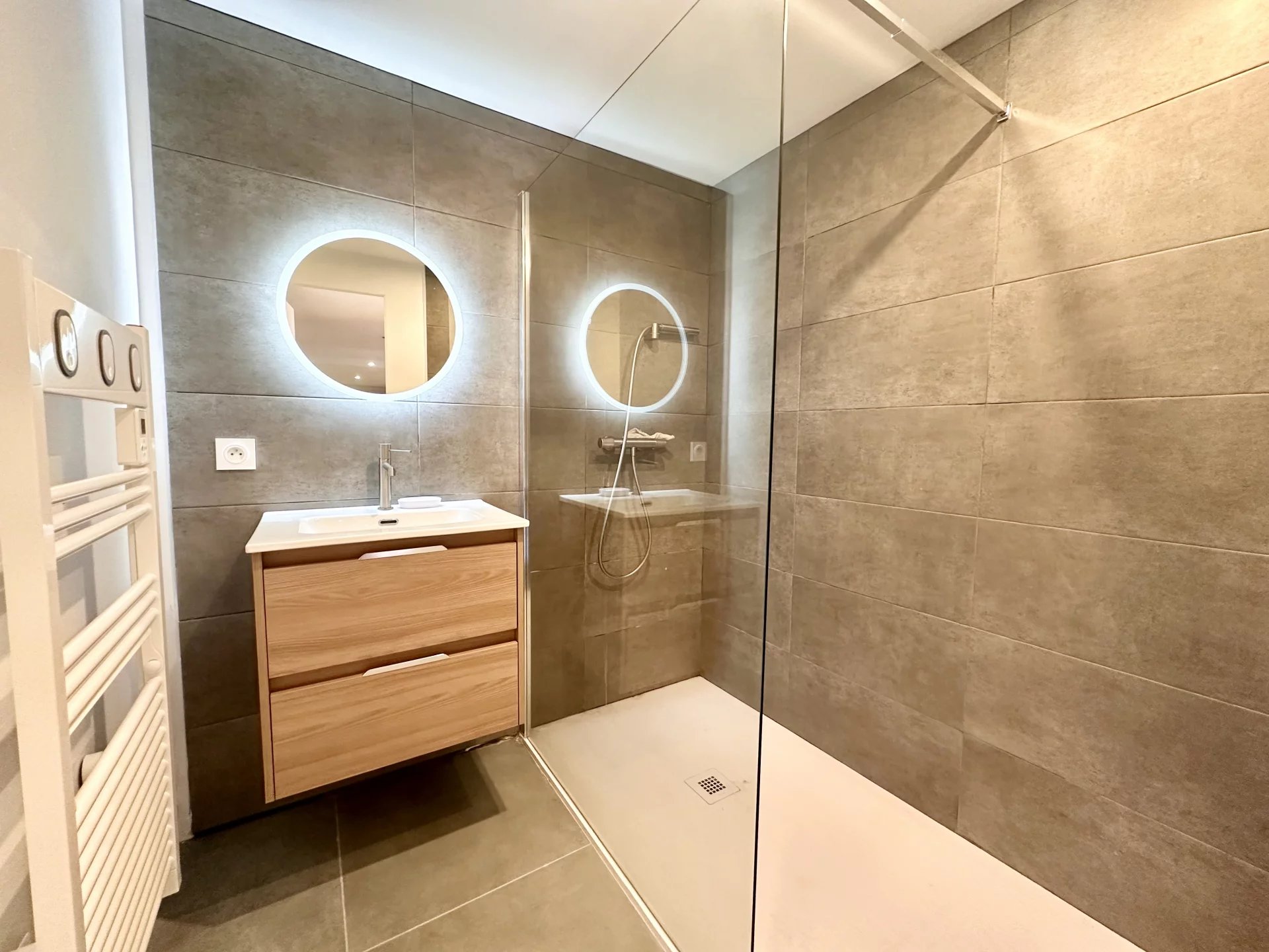Elle est composée au rez-de-chaussée : d'une entrée avec rangements, de 2 chambres de 14m² chacune, d'une salle d'eau avec WC, d'une grande pièce de 21m² avec de grands placards et un espace buanderie intégré, ainsi qu'un garage de 40m² avec une petite cave.