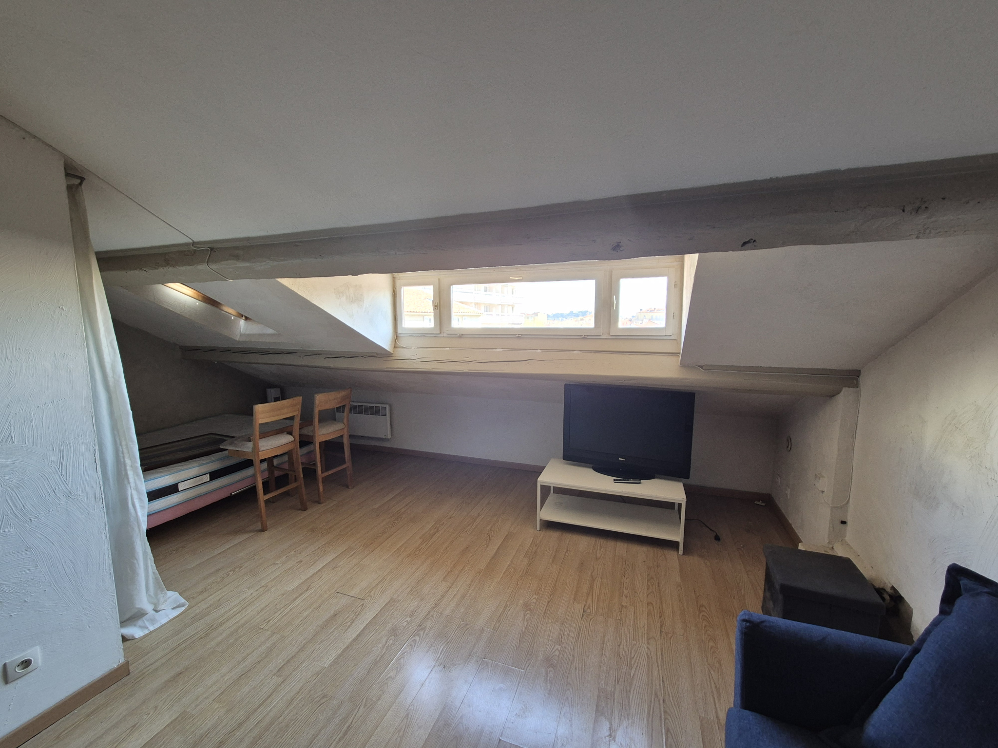 MOURILLON Village, boulevard Pelletan, studio mansardé de 40 m2 au sol (22 m2 loi carrez) loué meublé au troisième et dernier étage d'un petit immeuble. Jolie vue sur les toits du Mourillon.