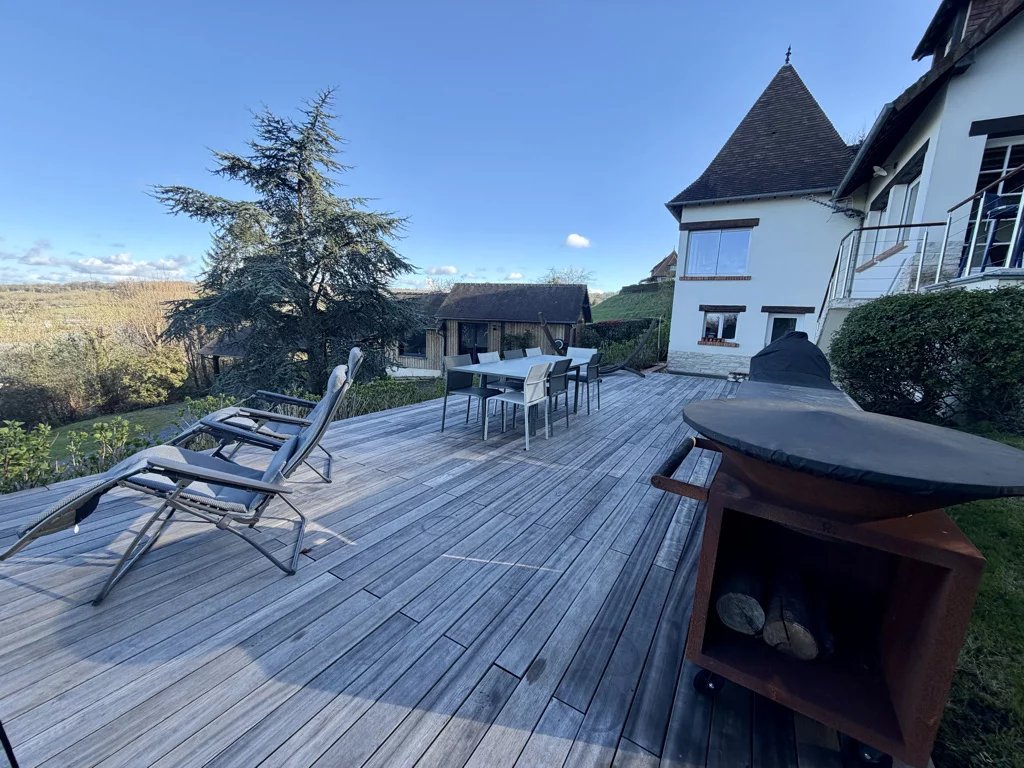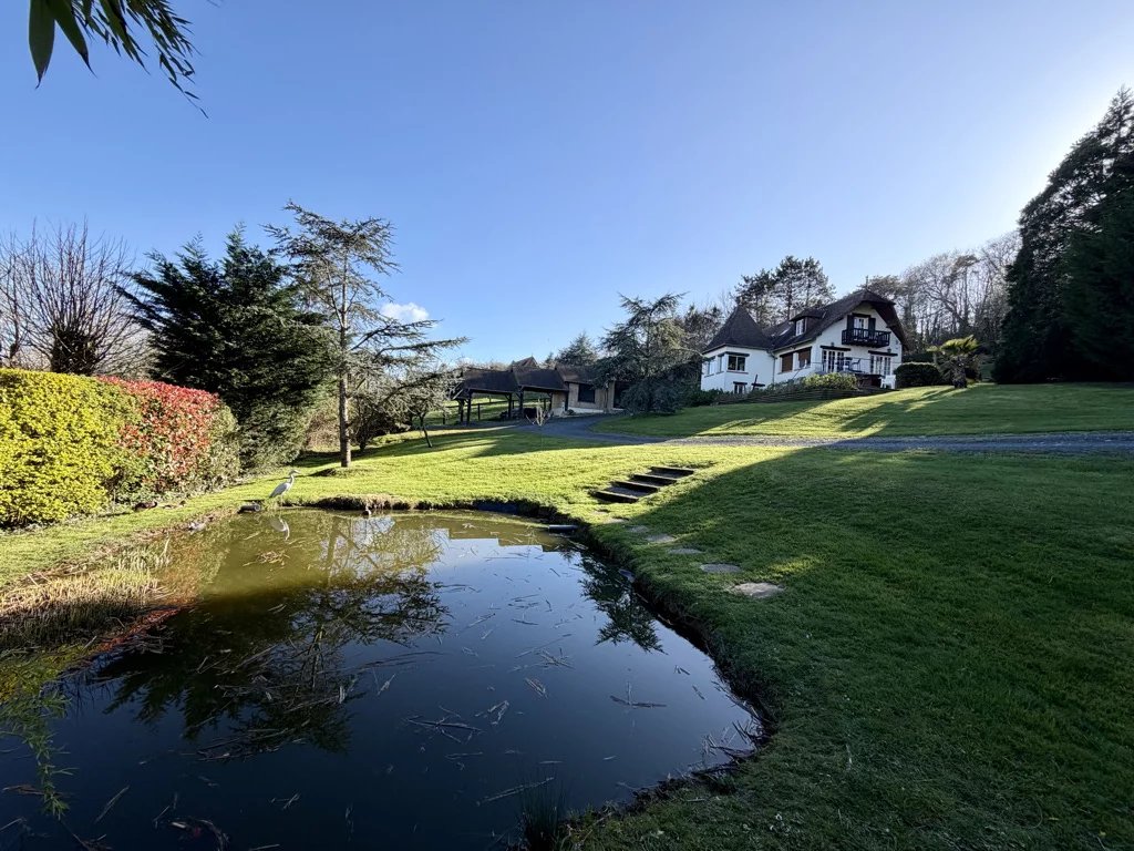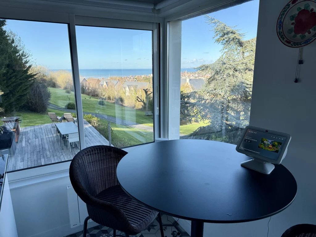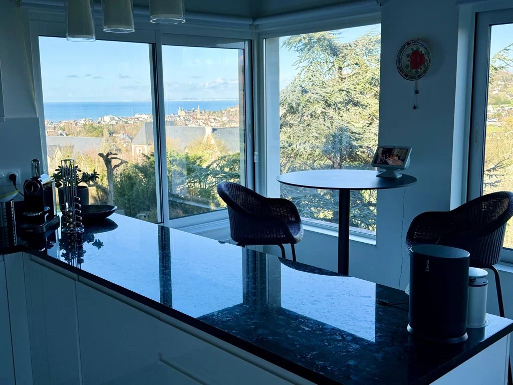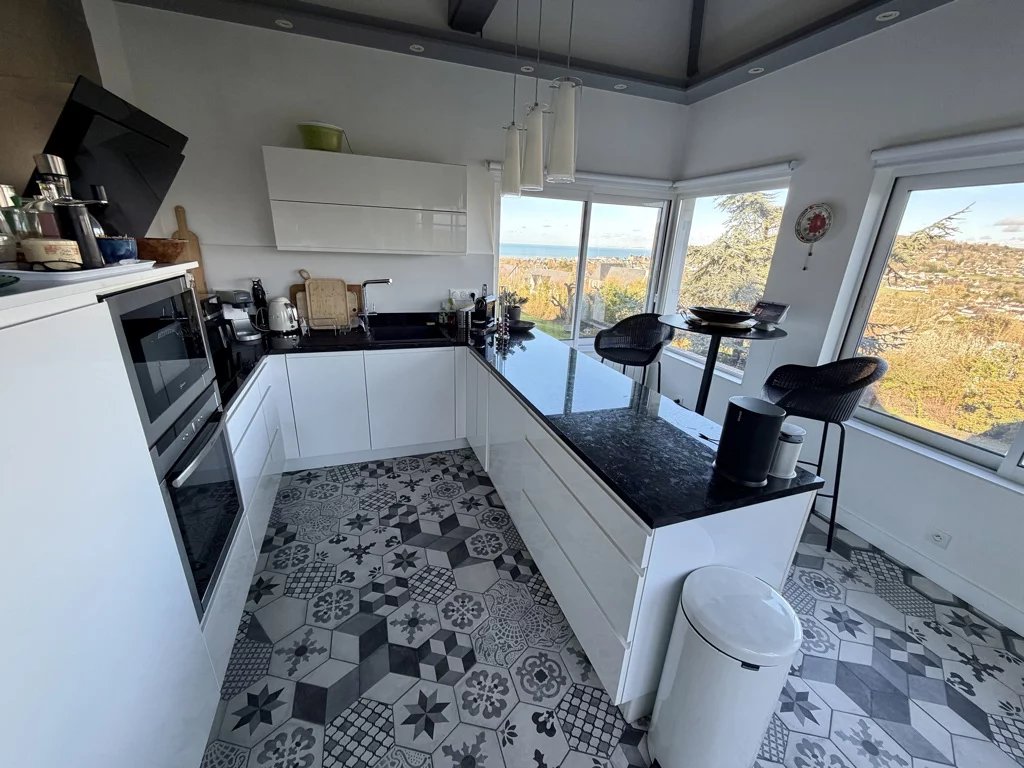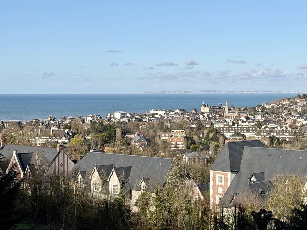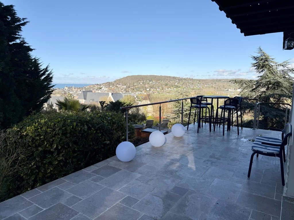À Houlgate, sur les hauteurs au calme avec une magnifique parcelle vue mer de 6898m2 arborée, propriété de 260m2 avec 6 chambres dont deux indépendantes avec salle de douche et w-c, salon avec cheminée et accès terrasse, salle à manger et cuisine entièrement équipée, le tout avec très belle vue mer ! charretterie avec borne de recharge, plan d'eau, portails électrique, buanderie, cellier...propriété alliant charme et confort sans travaux à prévoir. À VOIR.