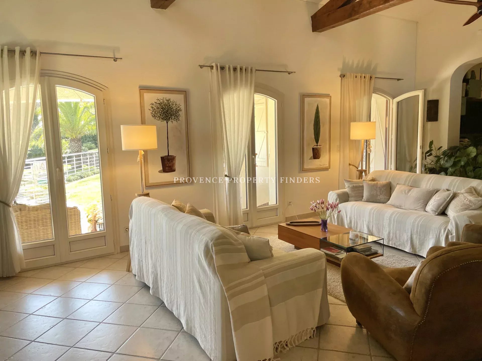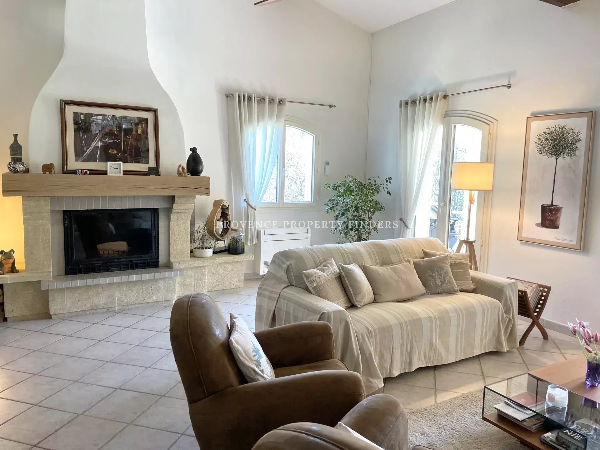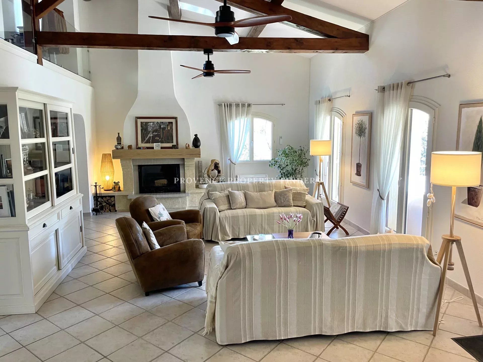 La villa de 220 m² vous offre un séjour ouvert et ensoleillé, donnant sur la terrasse (couverte). Hauts plafonds et cheminée à insert