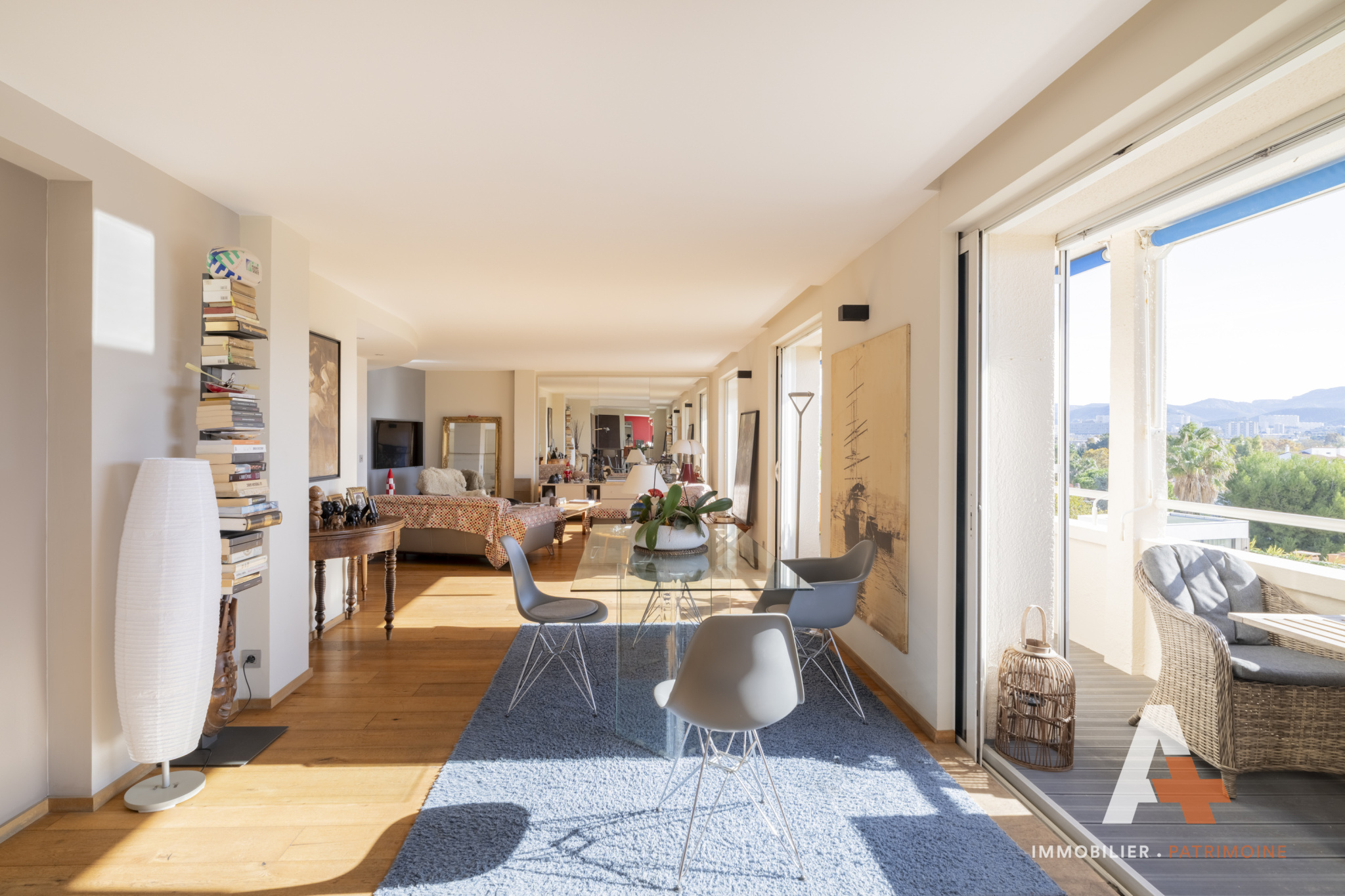 A+ Immobilier-Patrimoine vous propose en exclusivité ce magnifique appartement pensé et rénové par un architecte aux volumes exceptionnels. Situé au 5éme sur 6, l'appartement est né de la fusion des deux logements de l'étage pour n'en faire qu'un et profiter d'une vue magnifique sur la rade sud. Actuellement organisé en type 2/3 ce dernier peut très facilement et à moindre coût se transformer en type 4, son organisation actuellement lui confère un vaste espace de réception supérieur à 60m2 ouvert sur la mer et les extérieurs sans compter la cuisine entièrement aménagée. En complément, une grande suite parentale dressing, un espace bureau et une salle d'eau. Deux caves en sous-sol et possibilité de box fermé dans la résidence. Chauffage pompe à chaleur individuelle, ascenseur et terrasse collective pour étendage. Charges Annuelles 2180EUR. Honnaires à charge vendeur. Cabinet Laurent ALPHONSE 04 91 90 51 77 ou 06 76 07 96 78.