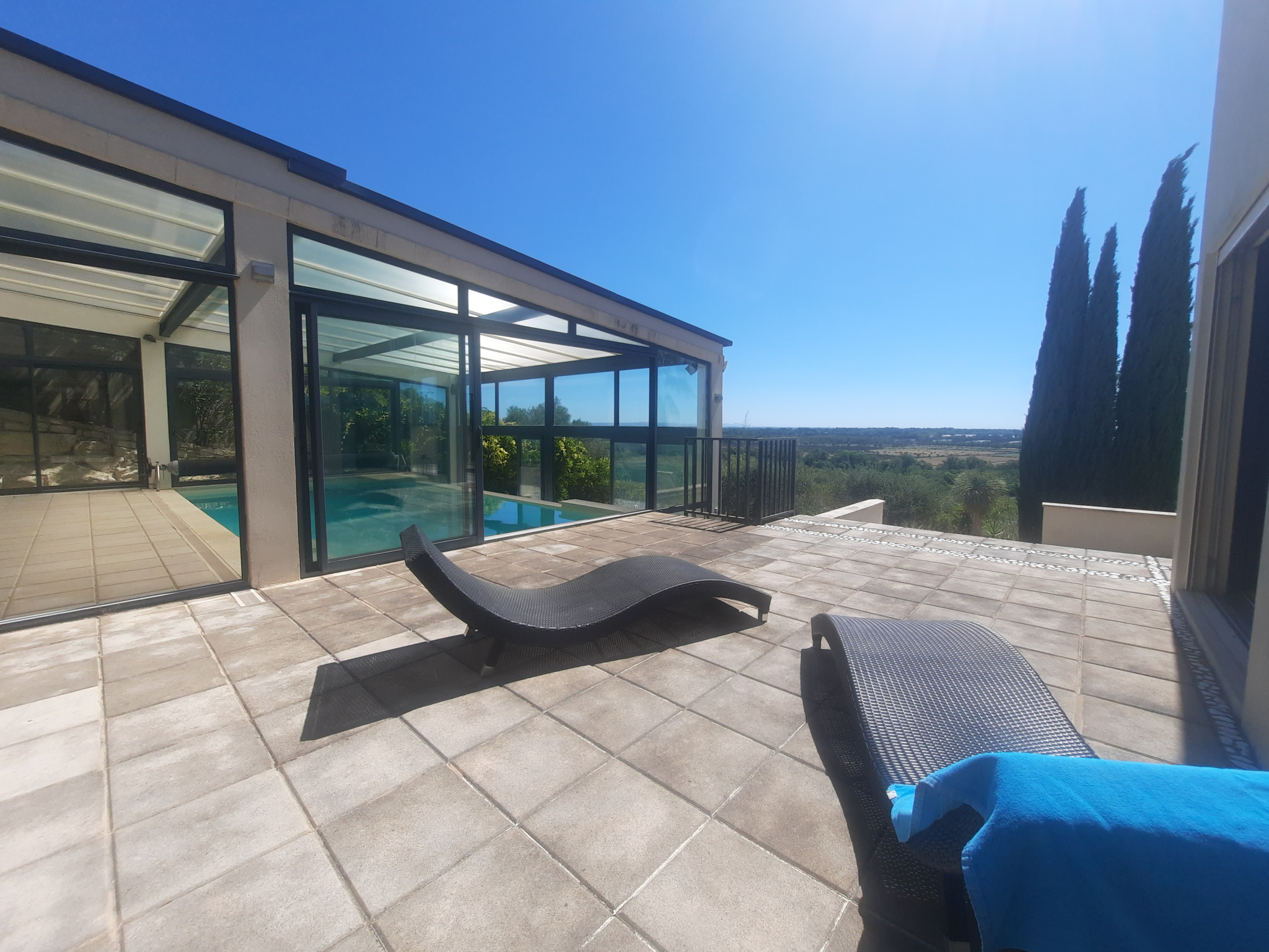 La villa d architecte de 190 m2 habitables offre un espace fonctionnel climatisé avec une circulation optimisée , une pièce de réception de 57 m2 avec poele a bois ouvrant par des baies a galandages sur différentes terrasses aux points de vue exceptionnels , une vaste suite parentale d environ 30 m2 , ( avec sa salle d eau ) , 4 chambres , une salle d eau, une salle de bains, 2 wc , et 110 m2 de dépendances ( garage , caves , remise etc ... ). Implantée sur 3136 m2 de terrain au total , avec vaste piscine ( pompe a chaleur ) , la propriété beneficie d une belle parcelle arborée de 1640 m2 constructible. Cet avantage offre diverses possibilités d évolution vers des projets personnels divers . Nous consulter .