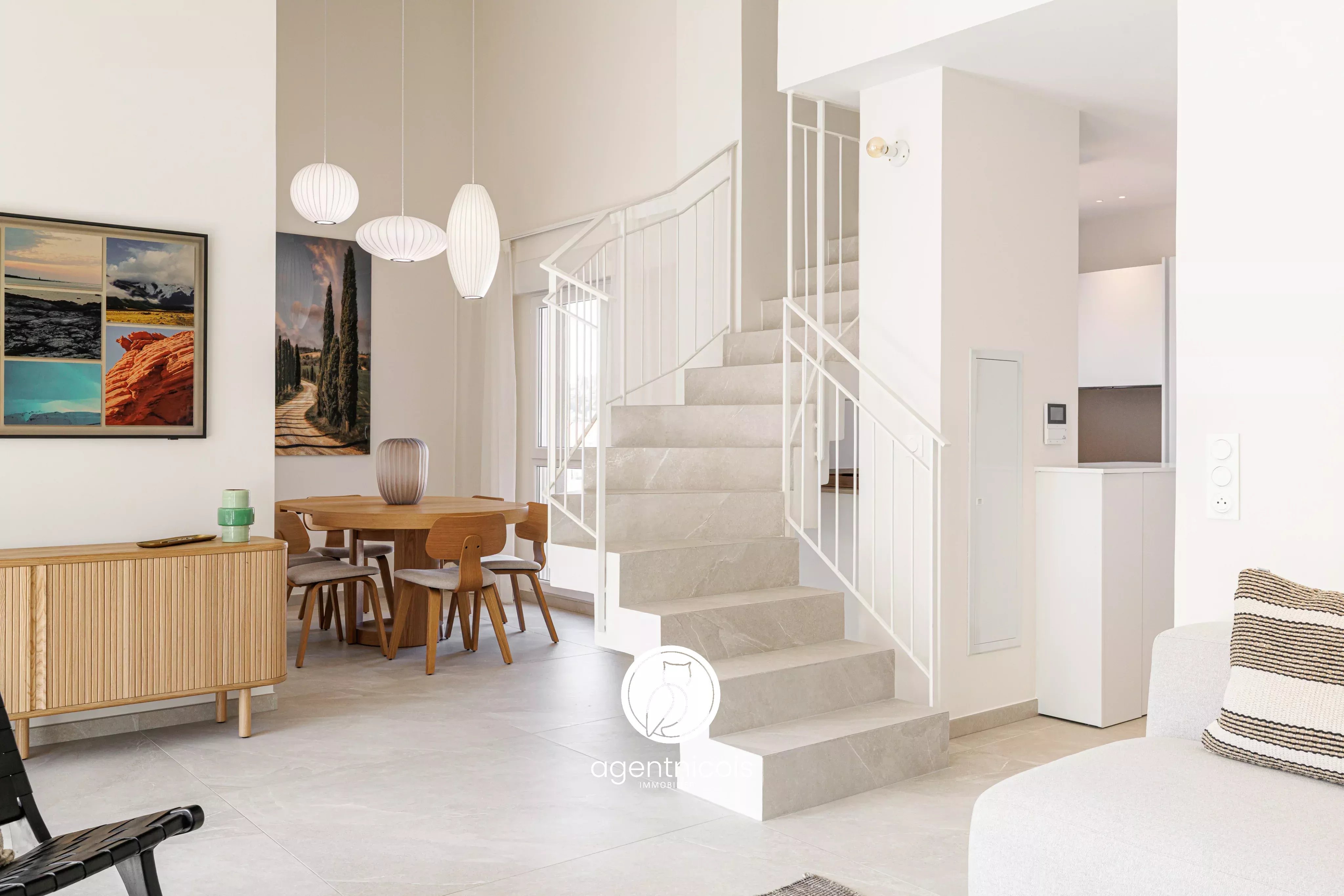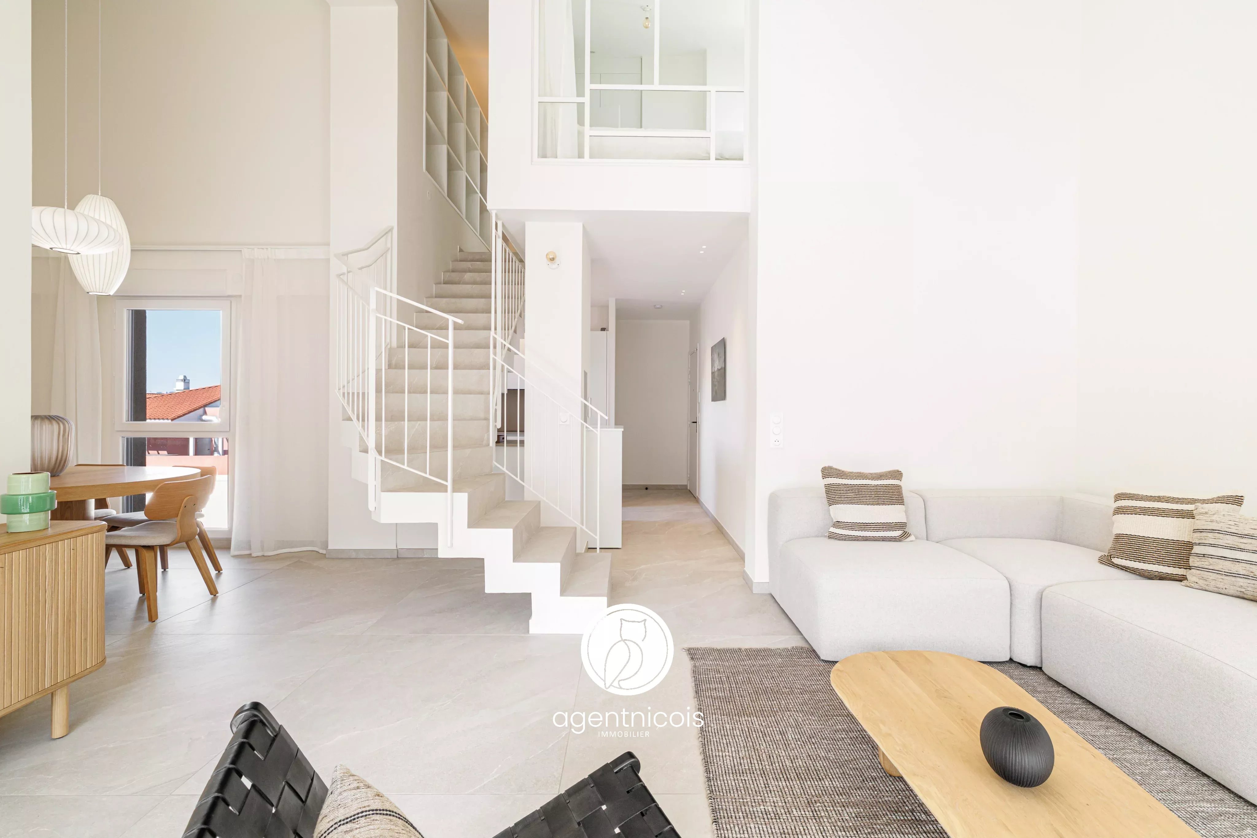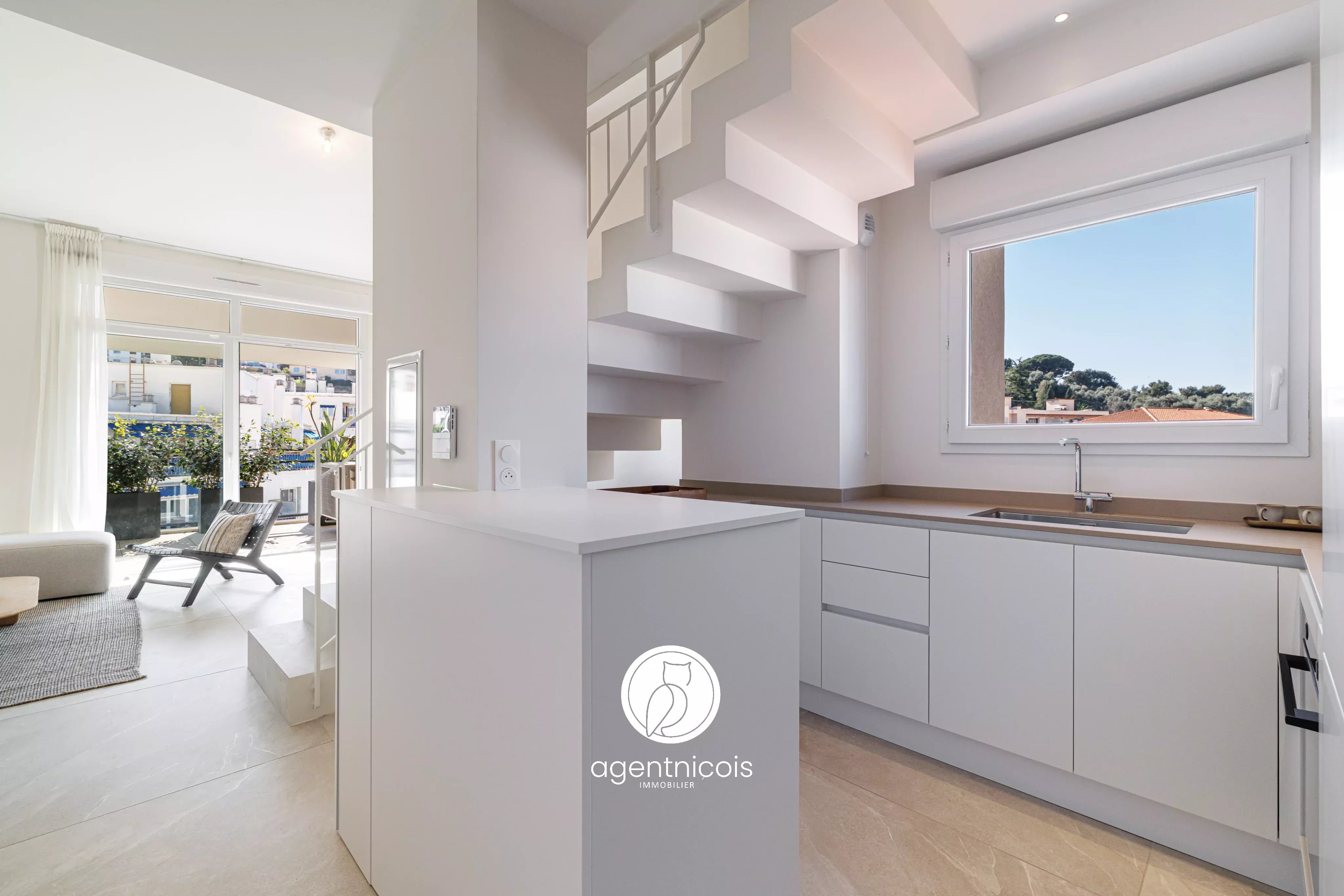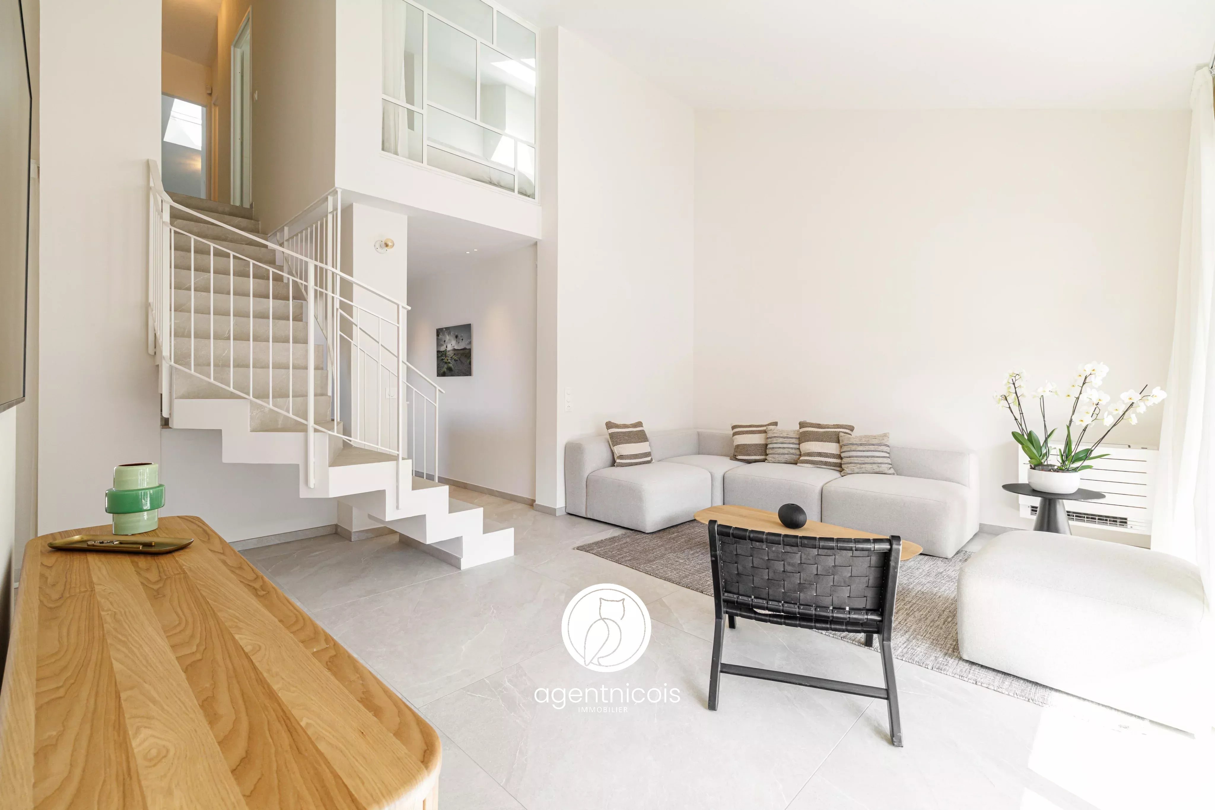 Une entrée ouvrant sur un séjour cathédrale avec cuisine ouverte entièrement équipée, donnant accès à une terrasse de 12m².