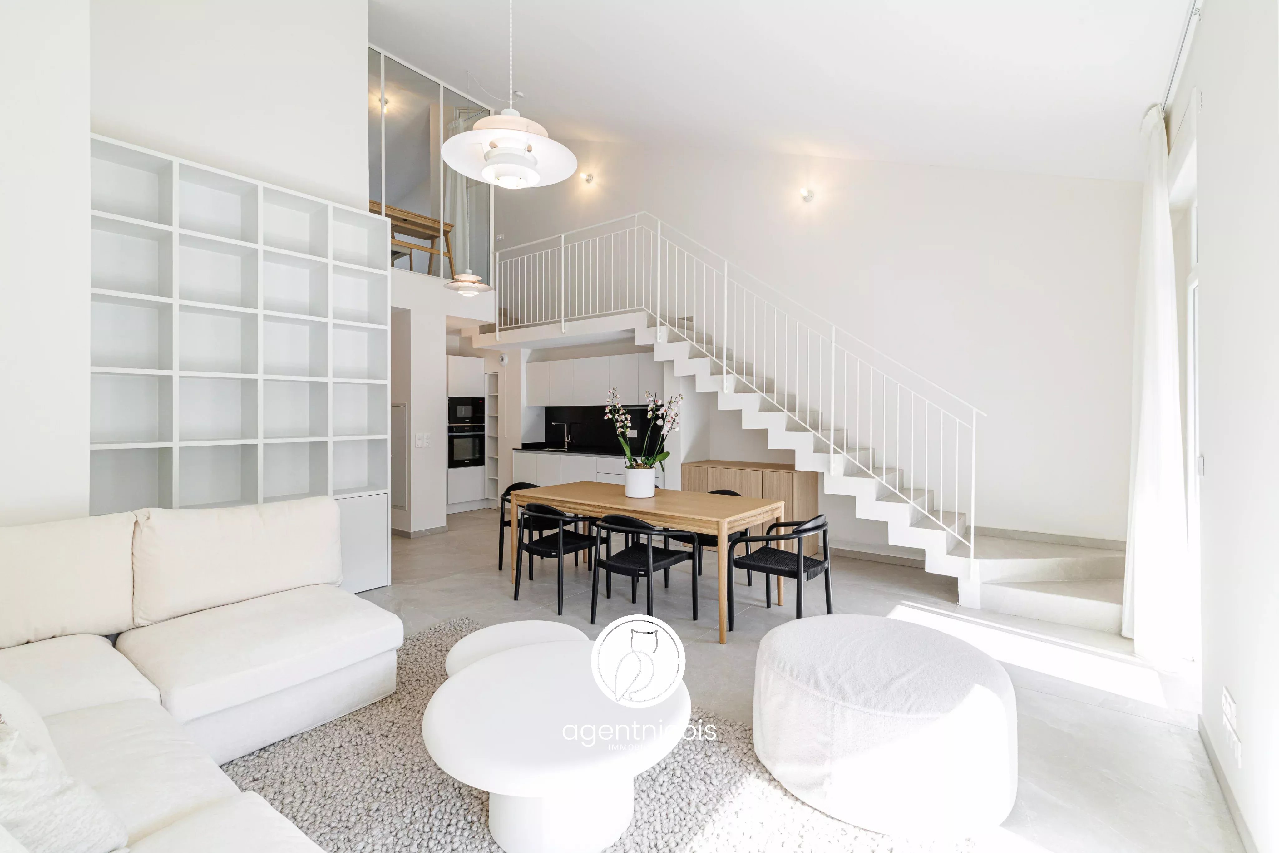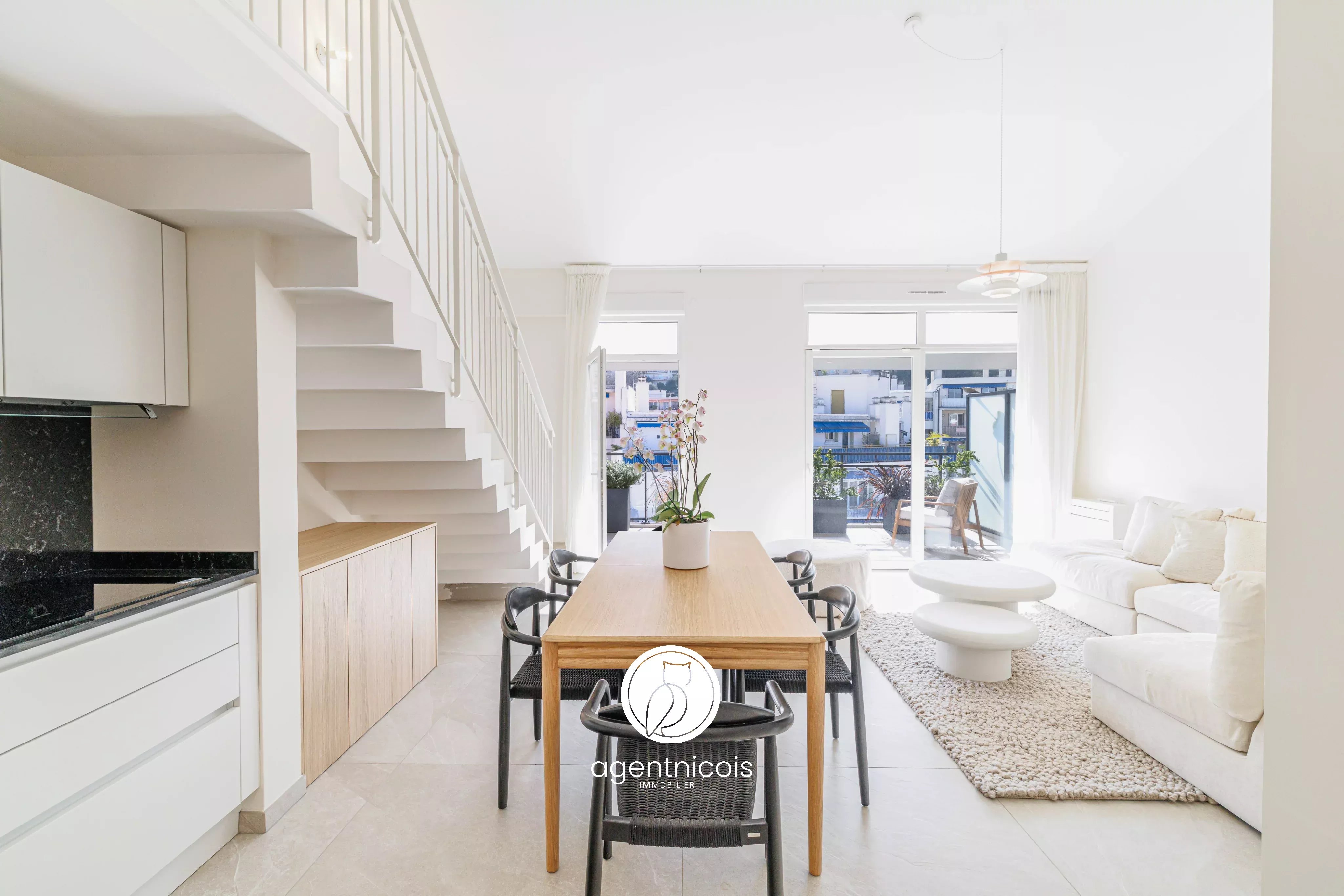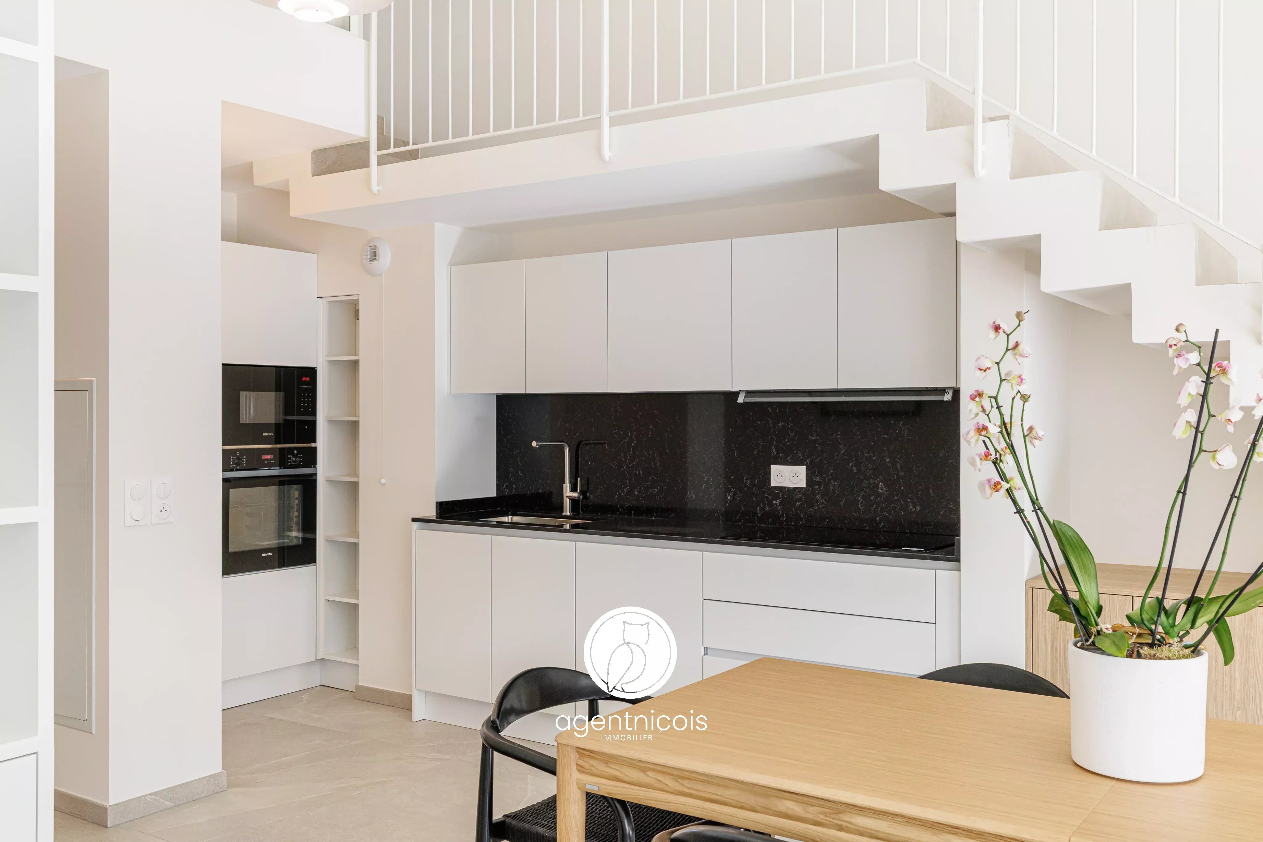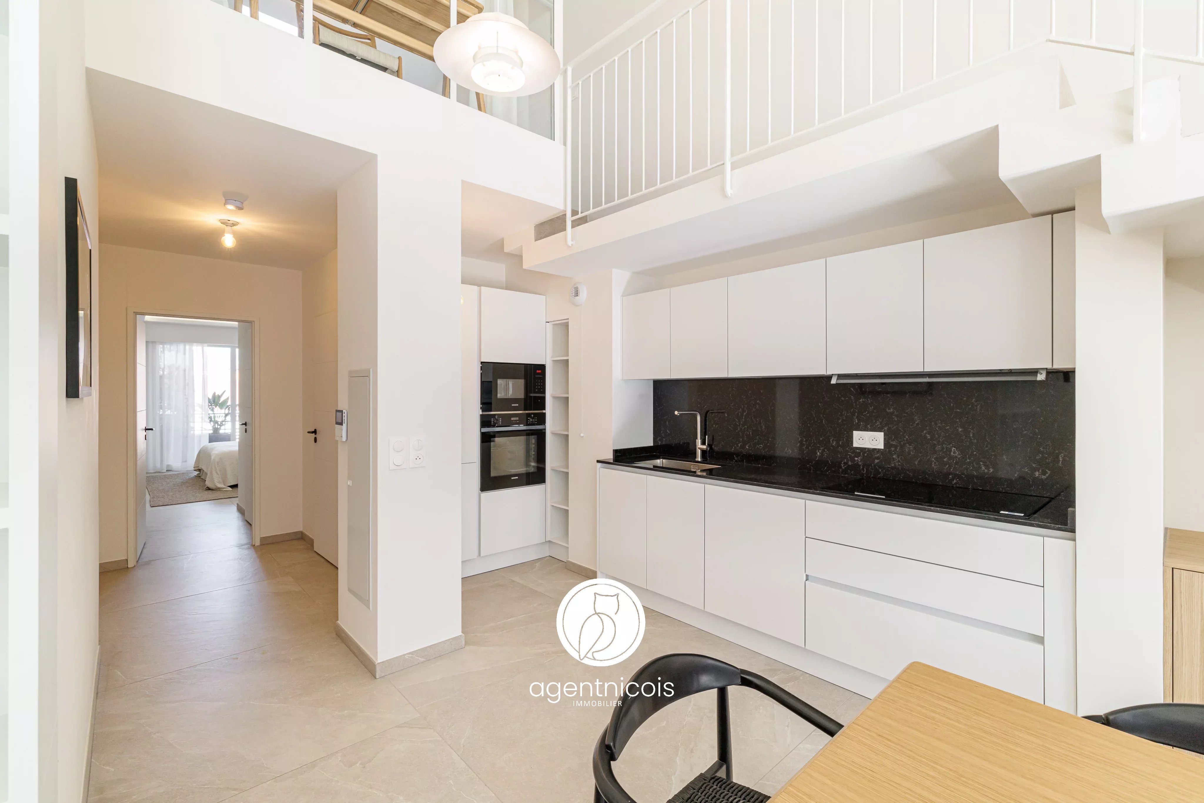 Une entrée ouvrant sur un séjour cathédrale avec cuisine ouverte entièrement équipée, donnant accès à une terrasse de 12m².