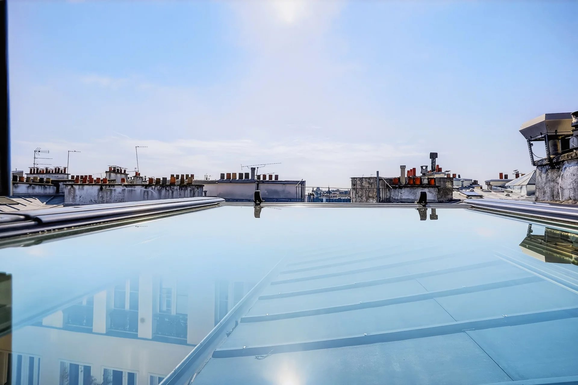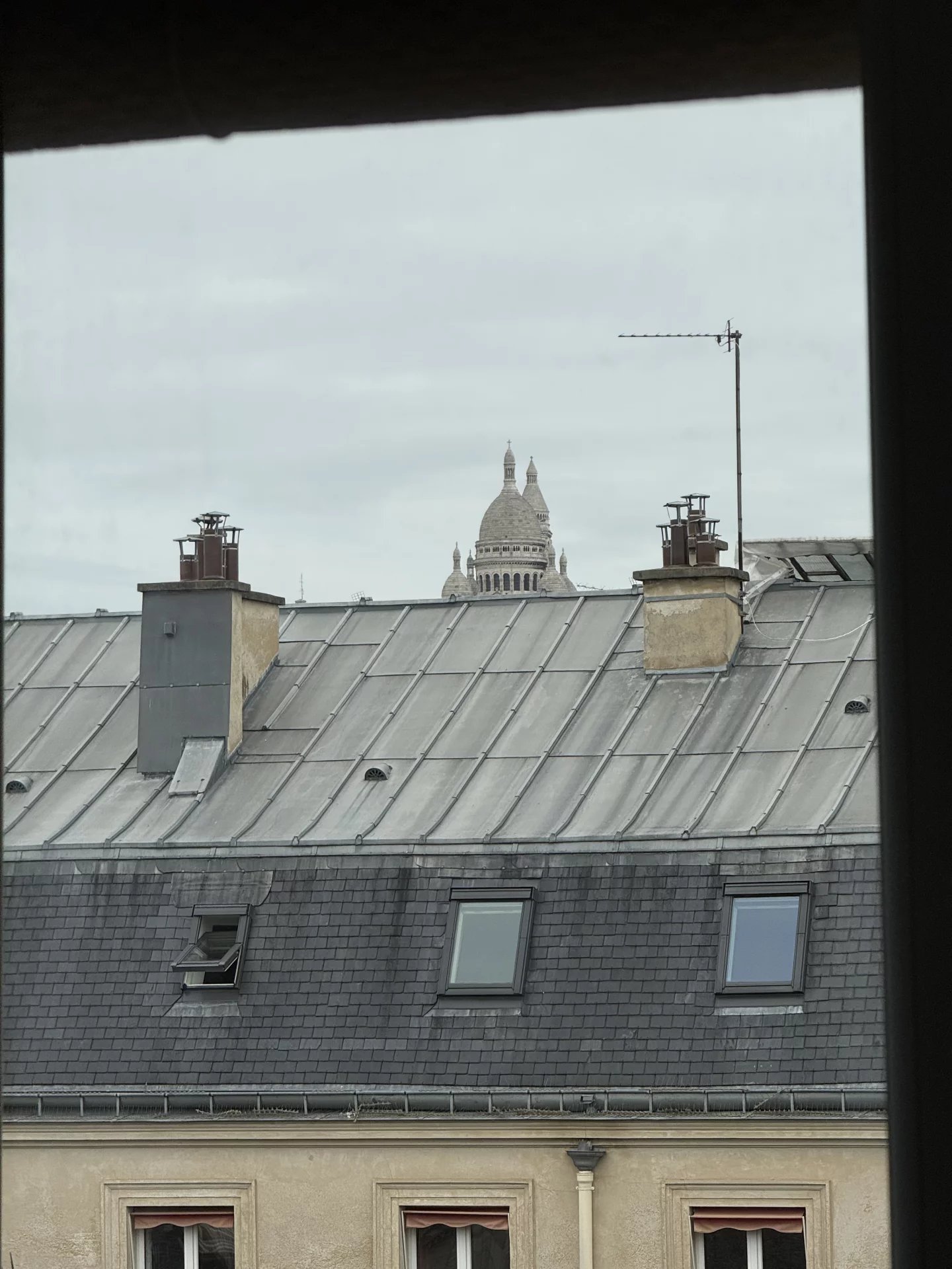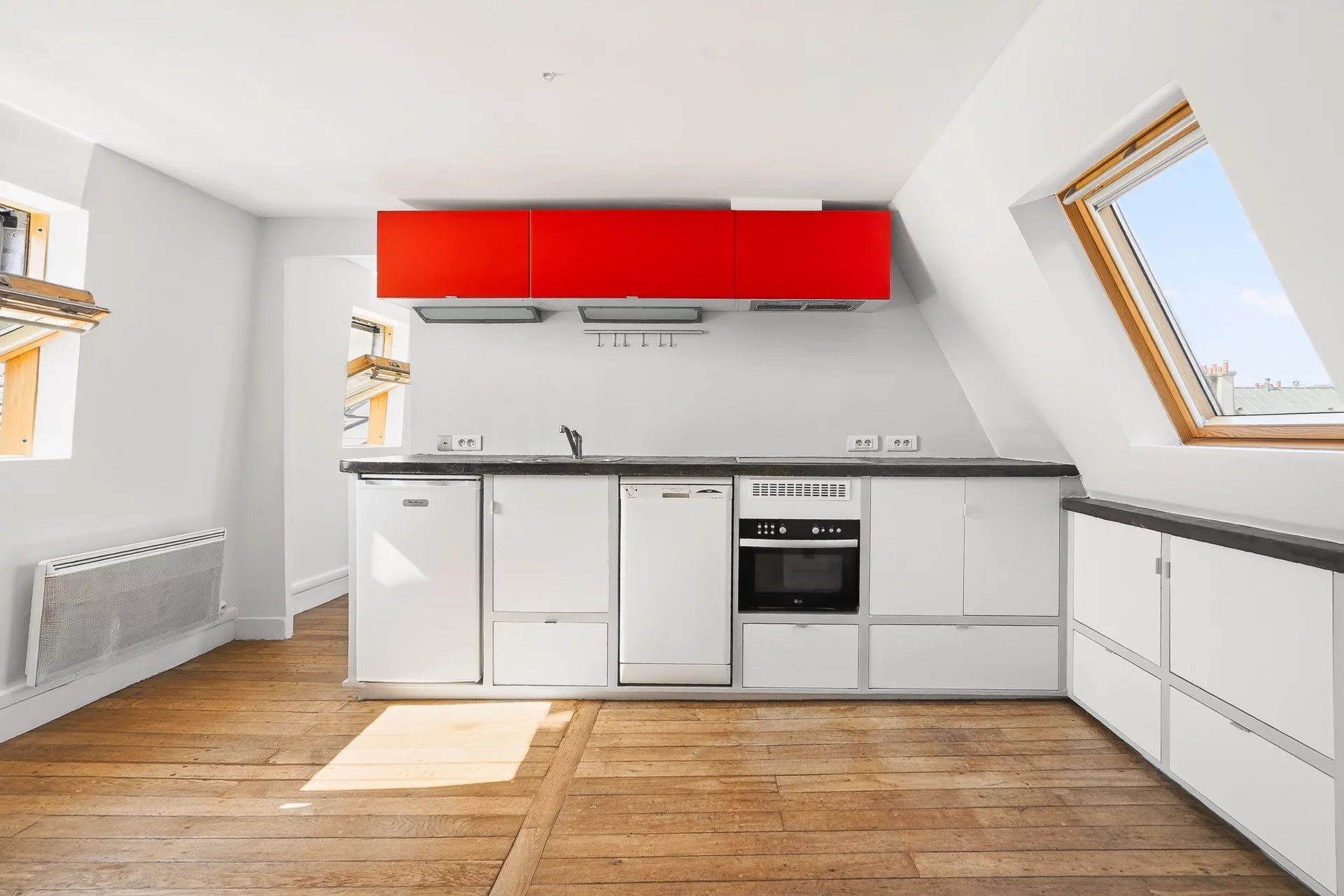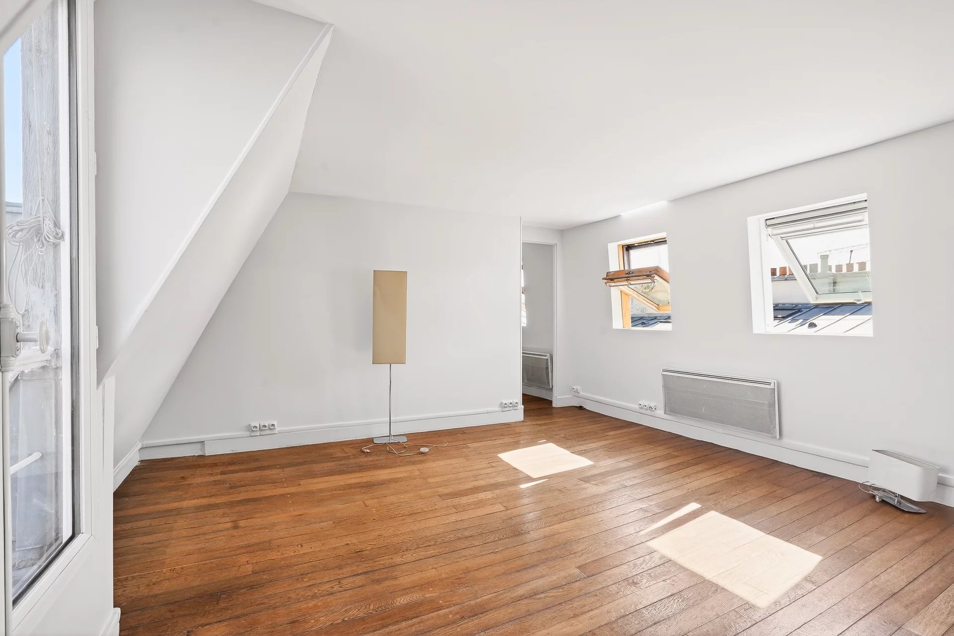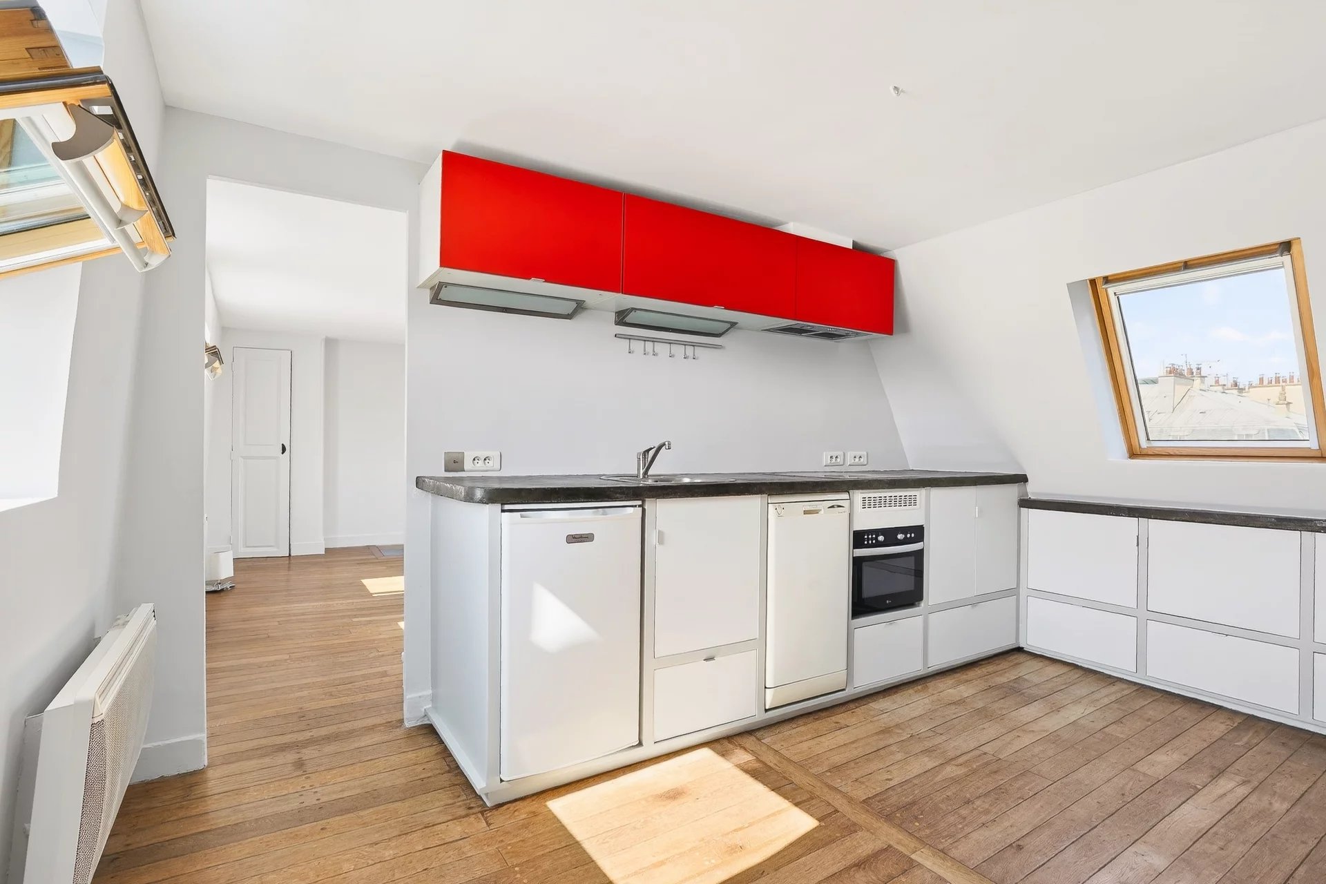 Le salon est agrémenté de deux fenêtres donnant sur la Cité de Trévise et de deux grands velux neufs s'ouvrant quasi intégralement sur la toiture en zinc récemment refaite de la copropriété.