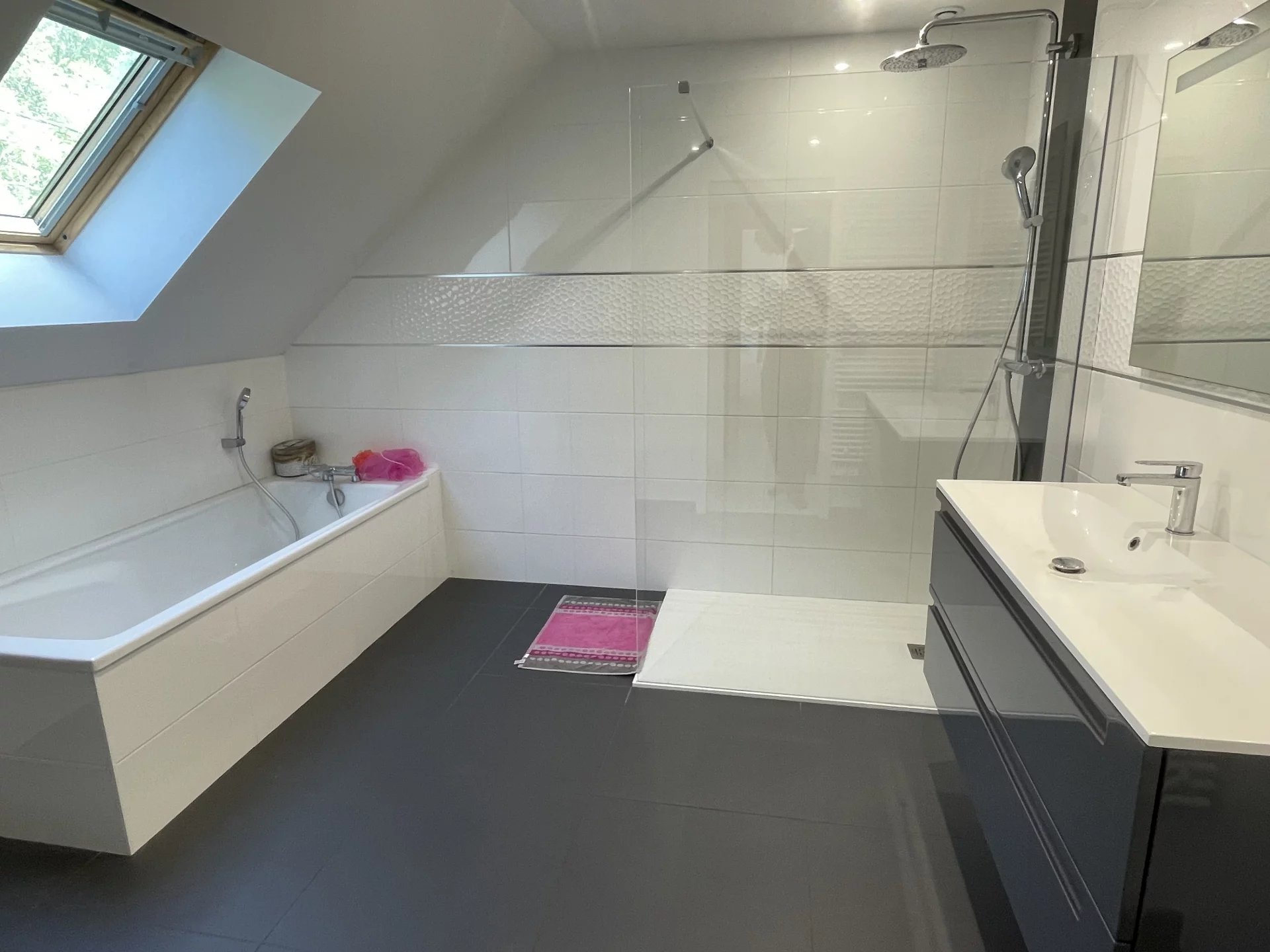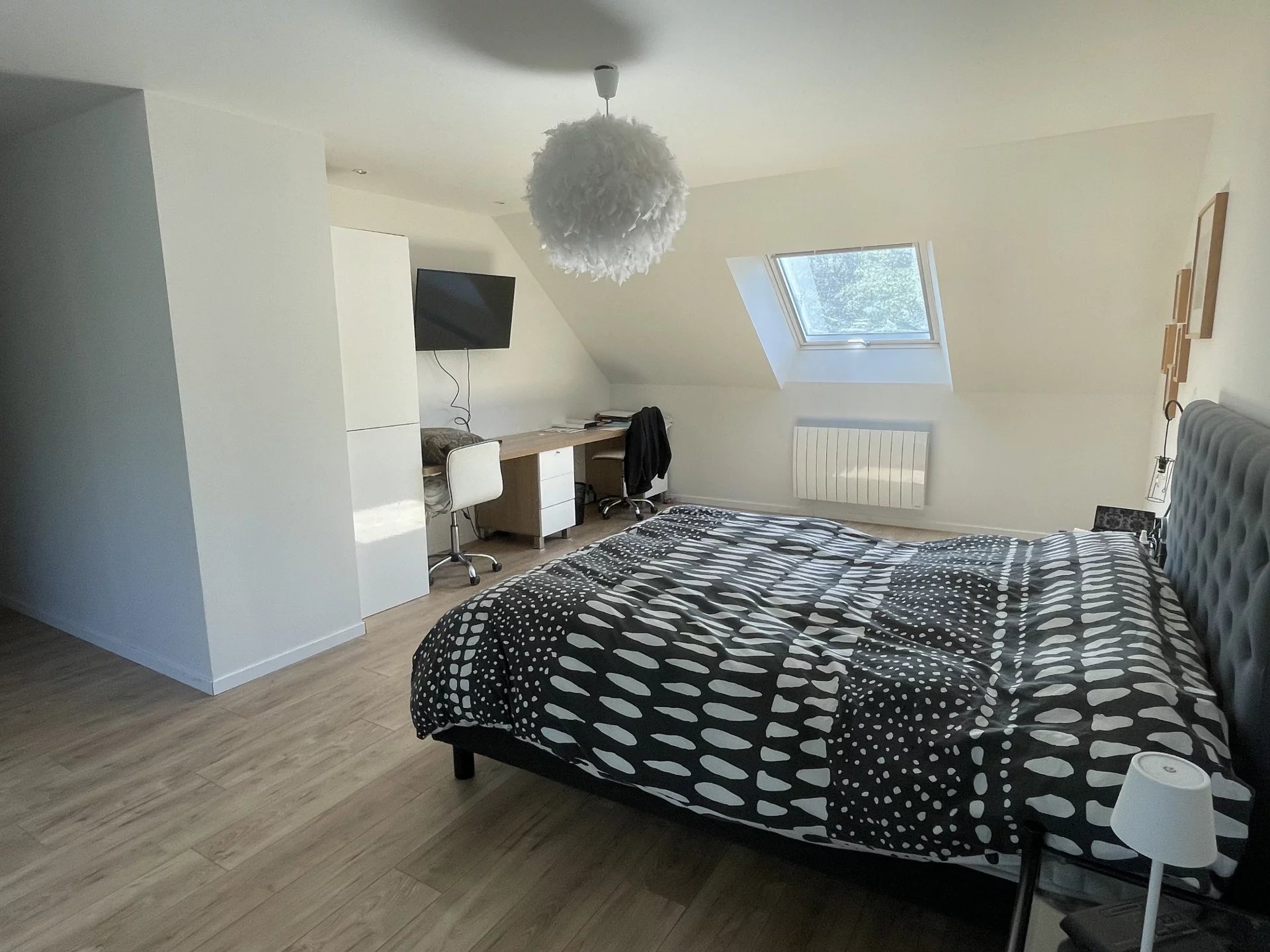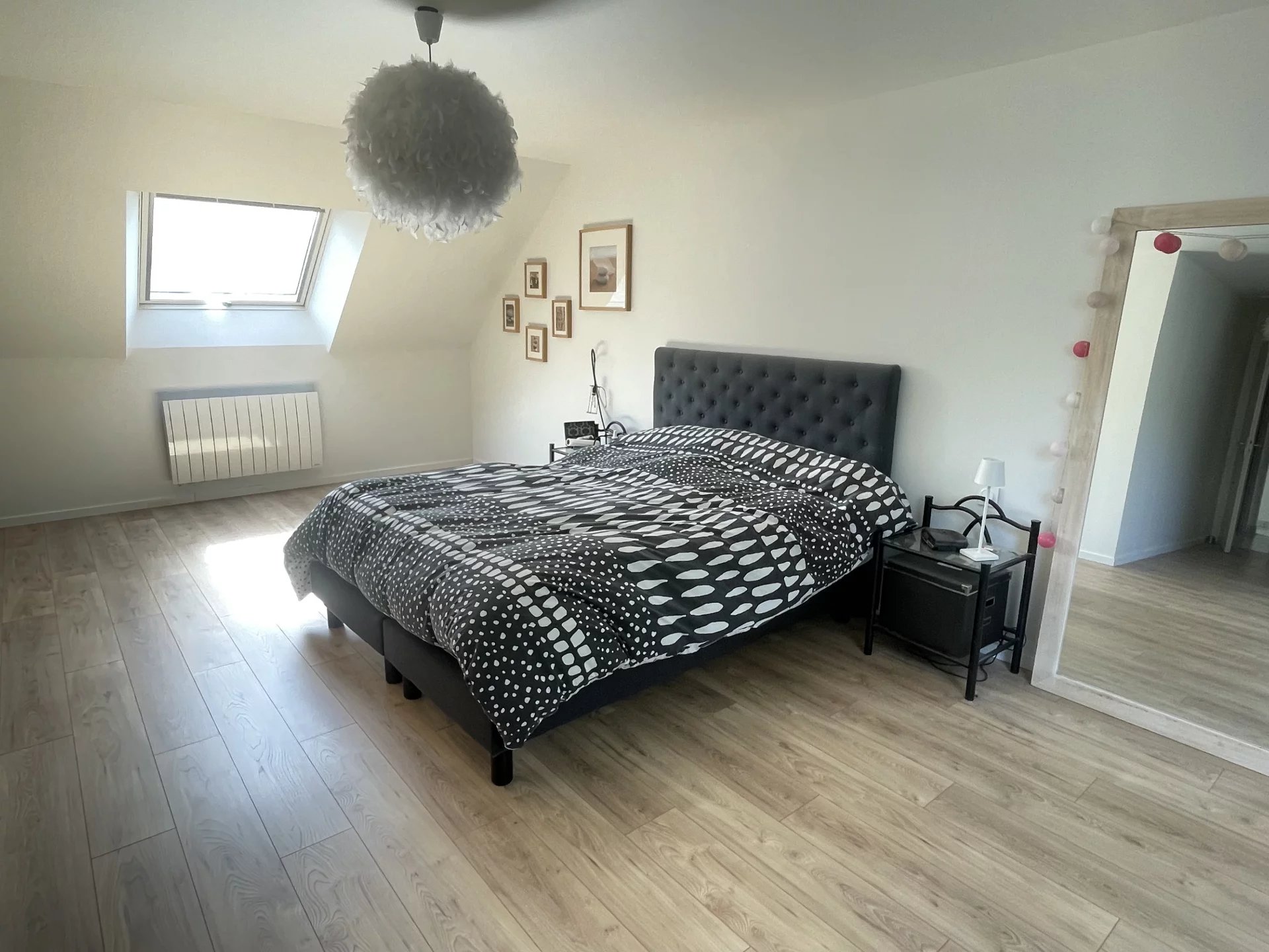 A l'étage, le palier dessert trois chambres dont une suite parentale avec sa salle de bains complète et son dressing.