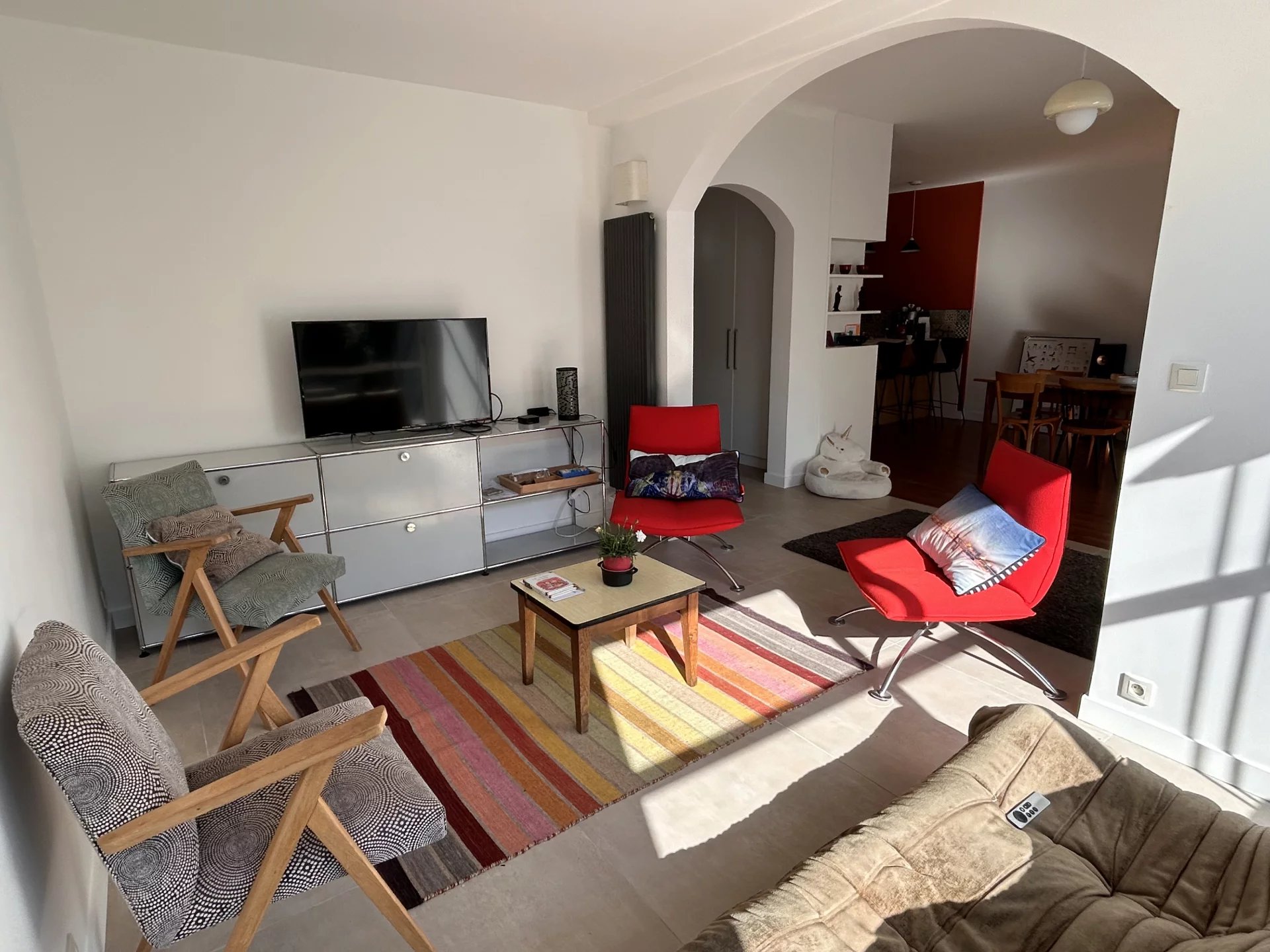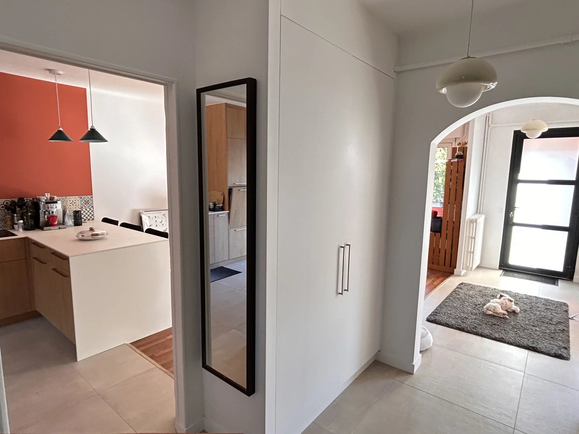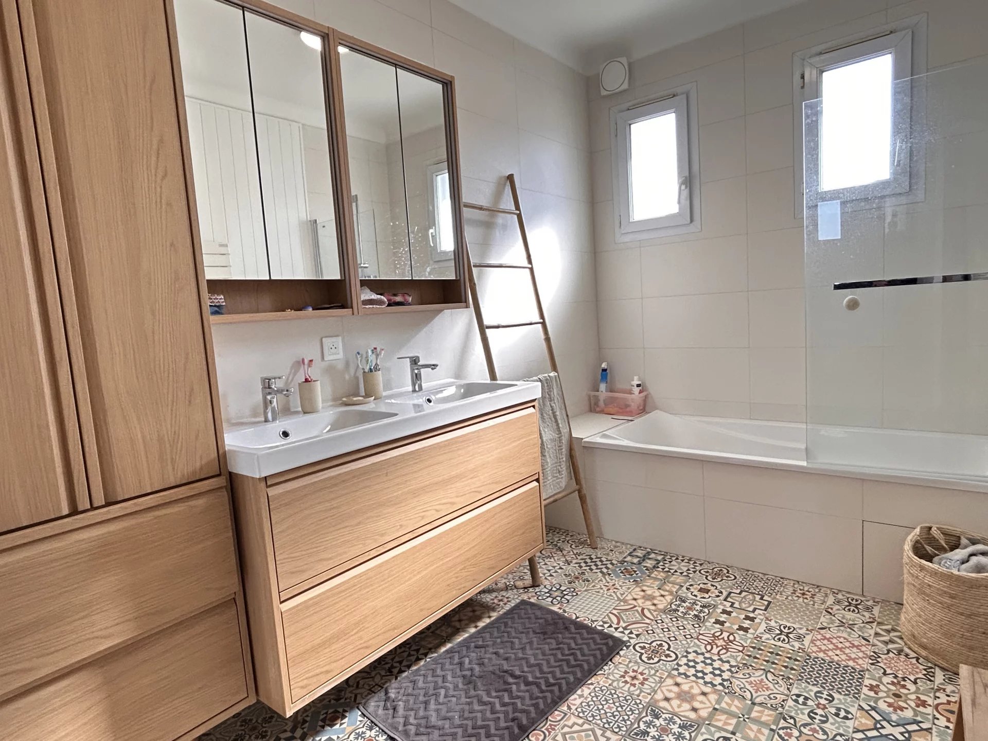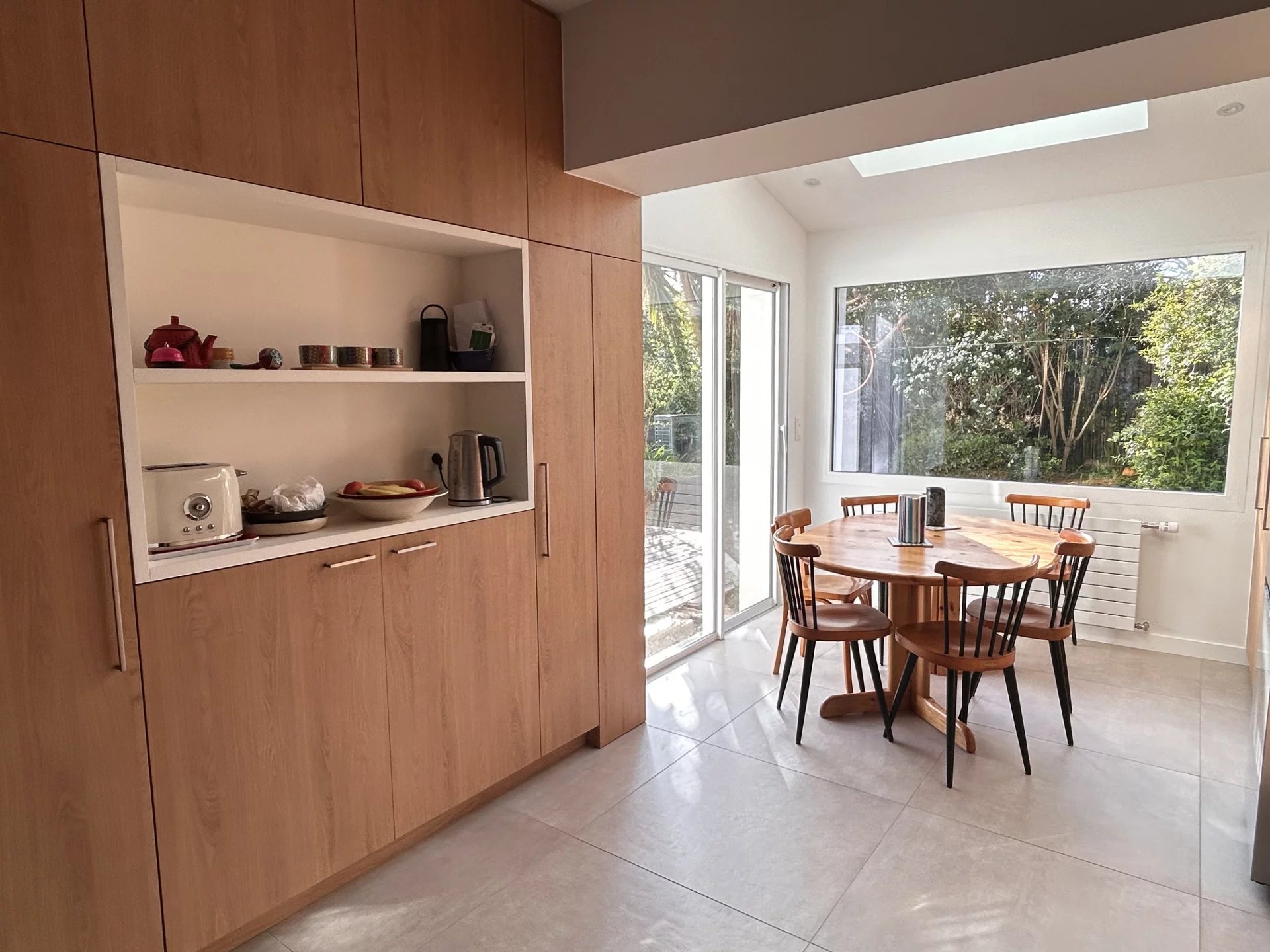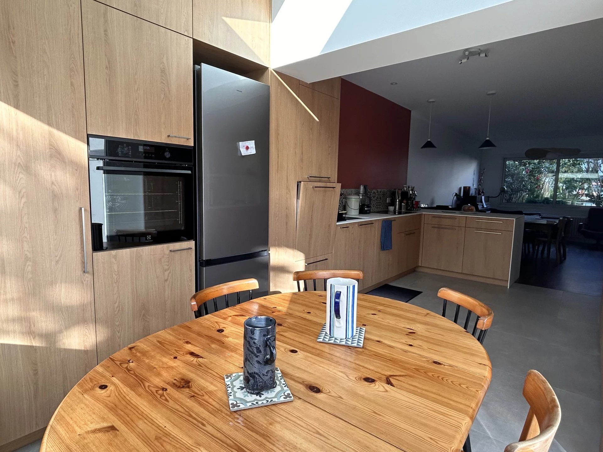 - au RDC : entrée avec placard, cuisine de menuisier aménagée et équipée donnant sur le jardin, salle à manger, salon, w-c, espace buanderie avec accès au jardin.