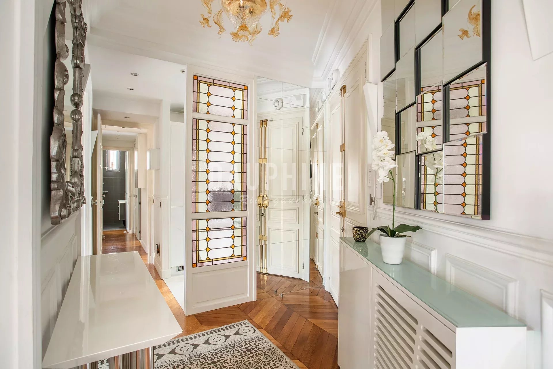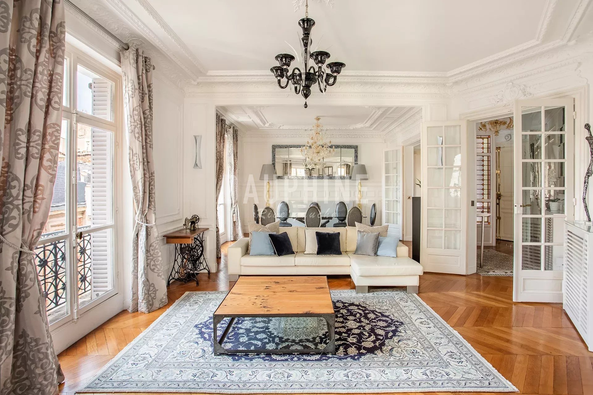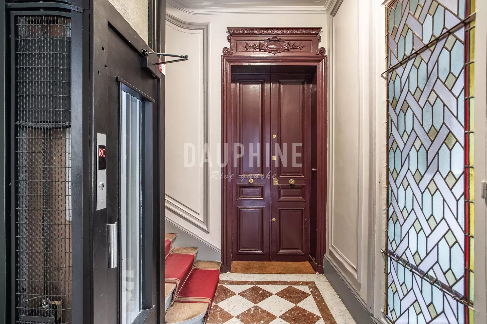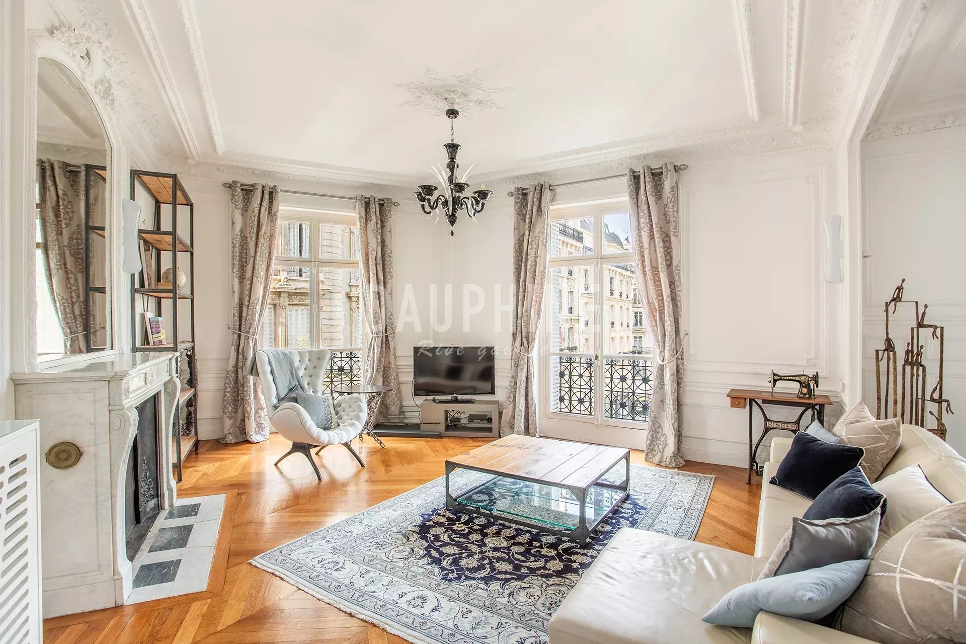 Situé au 2ᵉ étage surélevé d'un immeuble haussmanien, il séduit par ses volumes remarquables et sa hauteur sous plafond de près de 3 mètres. La double réception de 45 m², baignée de lumière grâce à trois portes-fenêtres, met en valeur tout le prestige de l’haussmannien : parquet en point de Hongrie, moulures élégantes et cheminée en marbre.