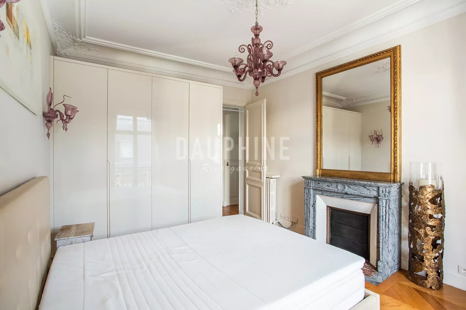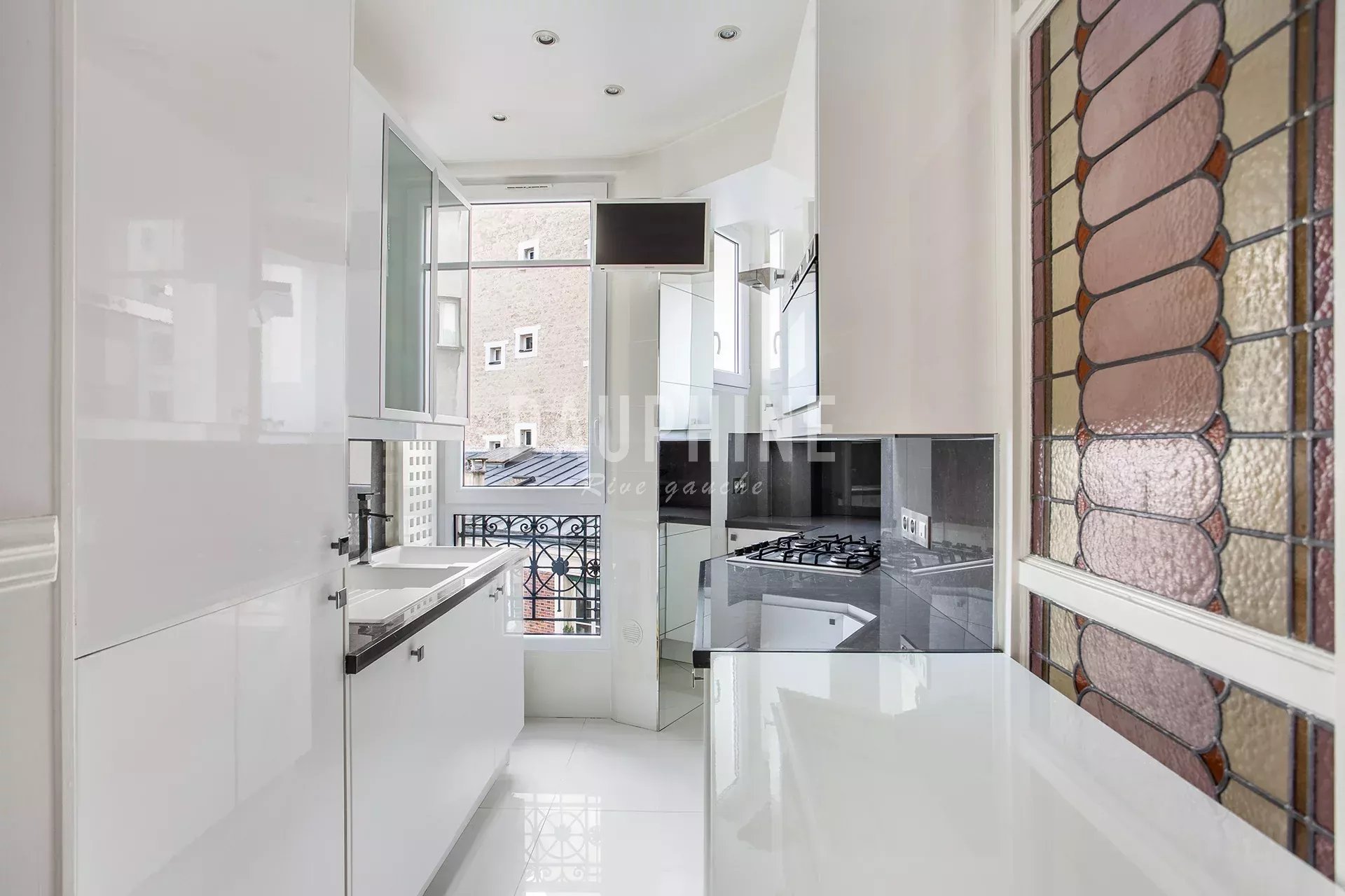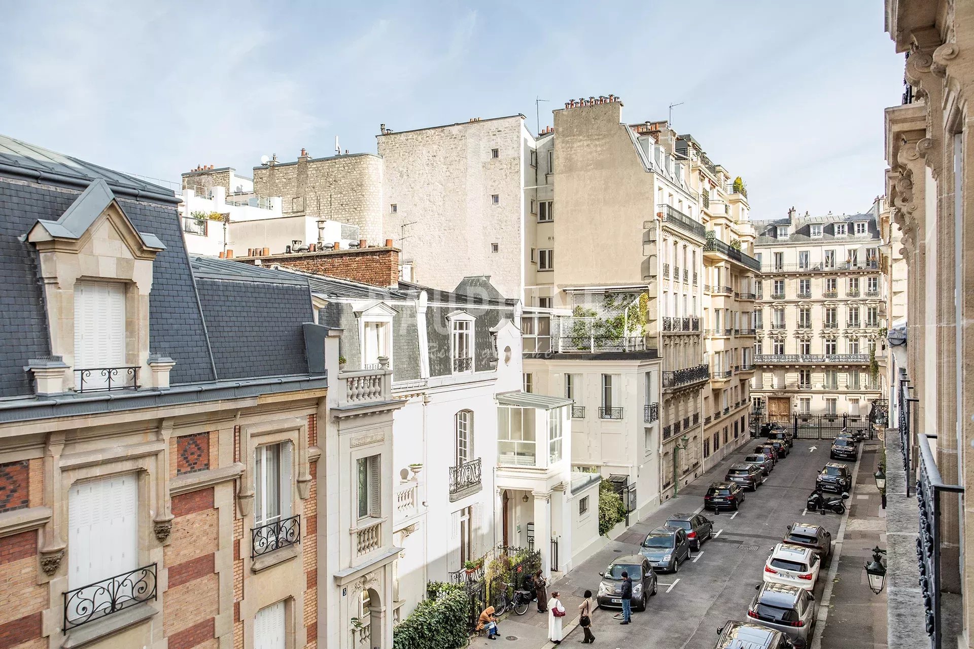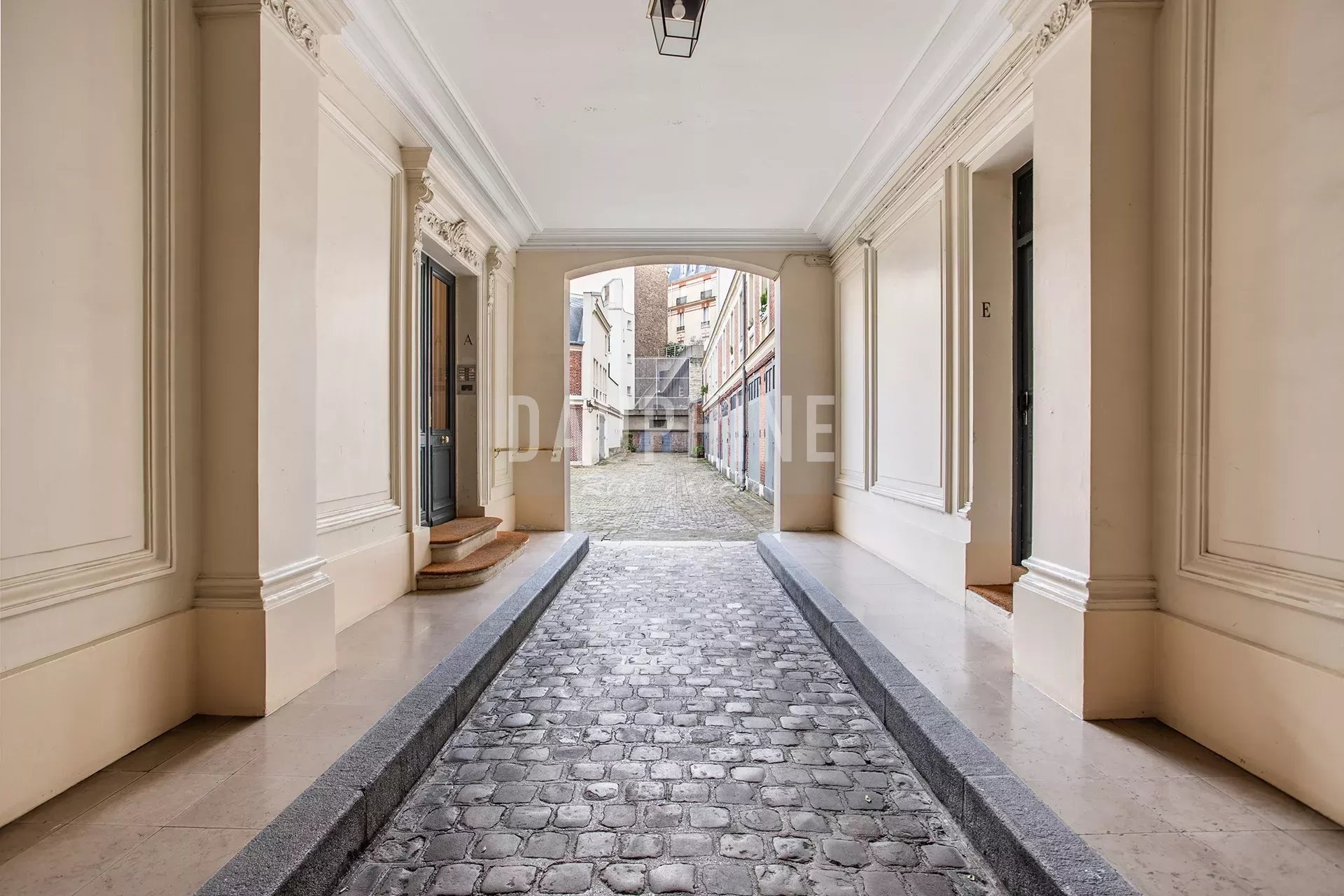 Situé au 2ᵉ étage surélevé d'un immeuble haussmanien, il séduit par ses volumes remarquables et sa hauteur sous plafond de près de 3 mètres. La double réception de 45 m², baignée de lumière grâce à trois portes-fenêtres, met en valeur tout le prestige de l’haussmannien : parquet en point de Hongrie, moulures élégantes et cheminée en marbre.