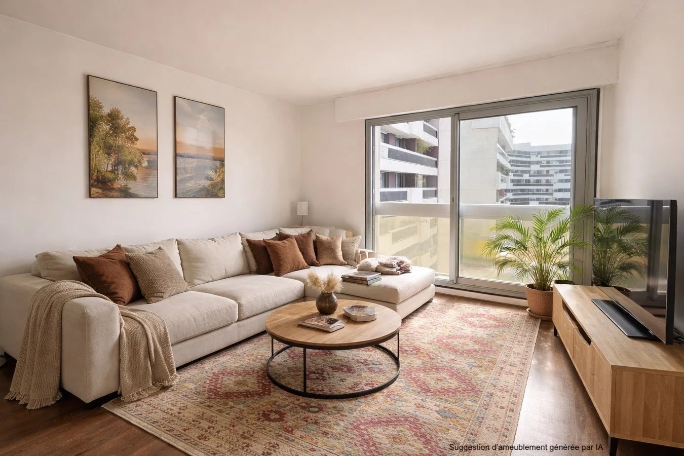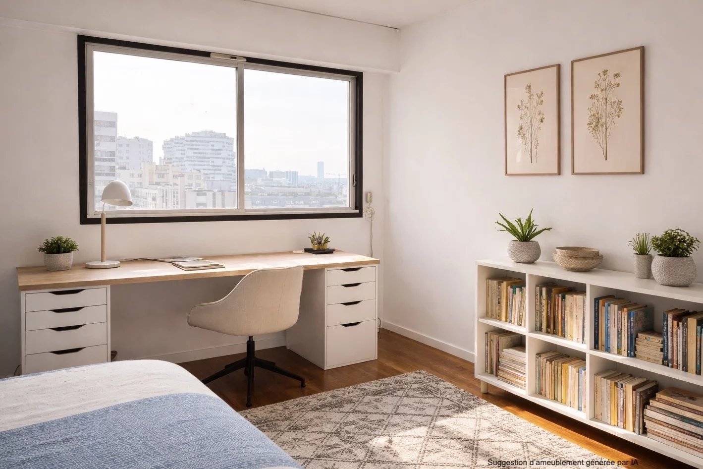 Le bien se compose d'une entrée ouvrant sur un séjour orienté sud-ouest baigné de lumière, avec vue panoramique sur le Panthéon et la Tour Eiffel. Il comprend également une cuisine séparée, un couloir avec rangements menant à deux chambres et une salle de bain, et des WC séparés.