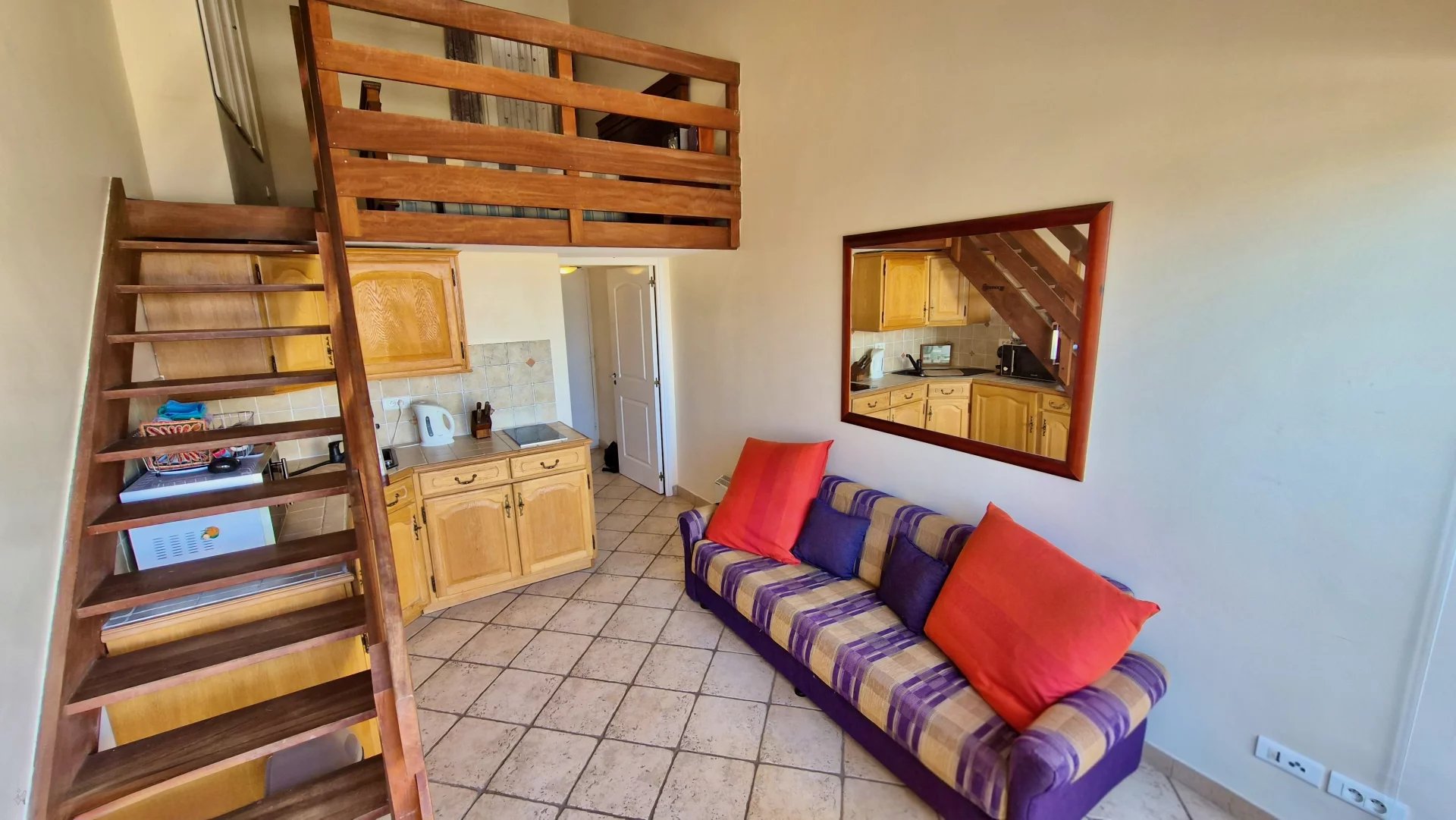 L’intérieur se compose d’une pièce de vie lumineuse avec cuisine aménagée, d’une salle d’eau et d’un espace nuit en mezzanine permettant une séparation agréable des espaces. L’appartement est équipé de la climatisation, assurant un confort en toutes saisons. Il se situe dans une résidence bien entretenue construite à la fin des années 1970 et n’a connu que deux propriétaires depuis l’origine.