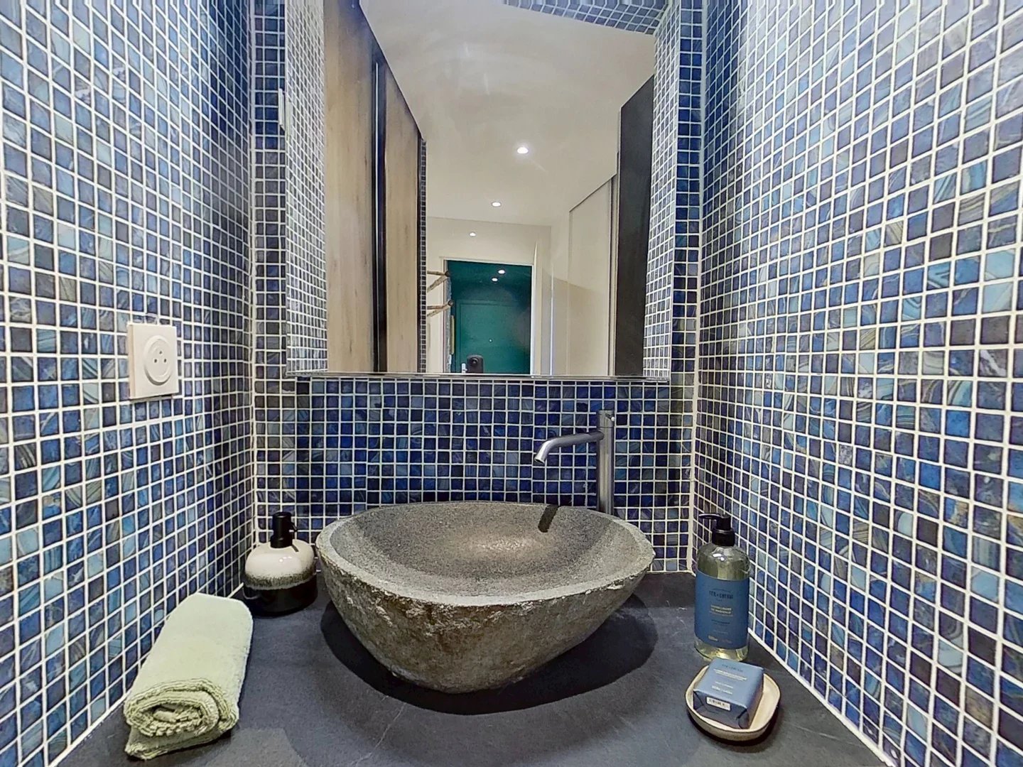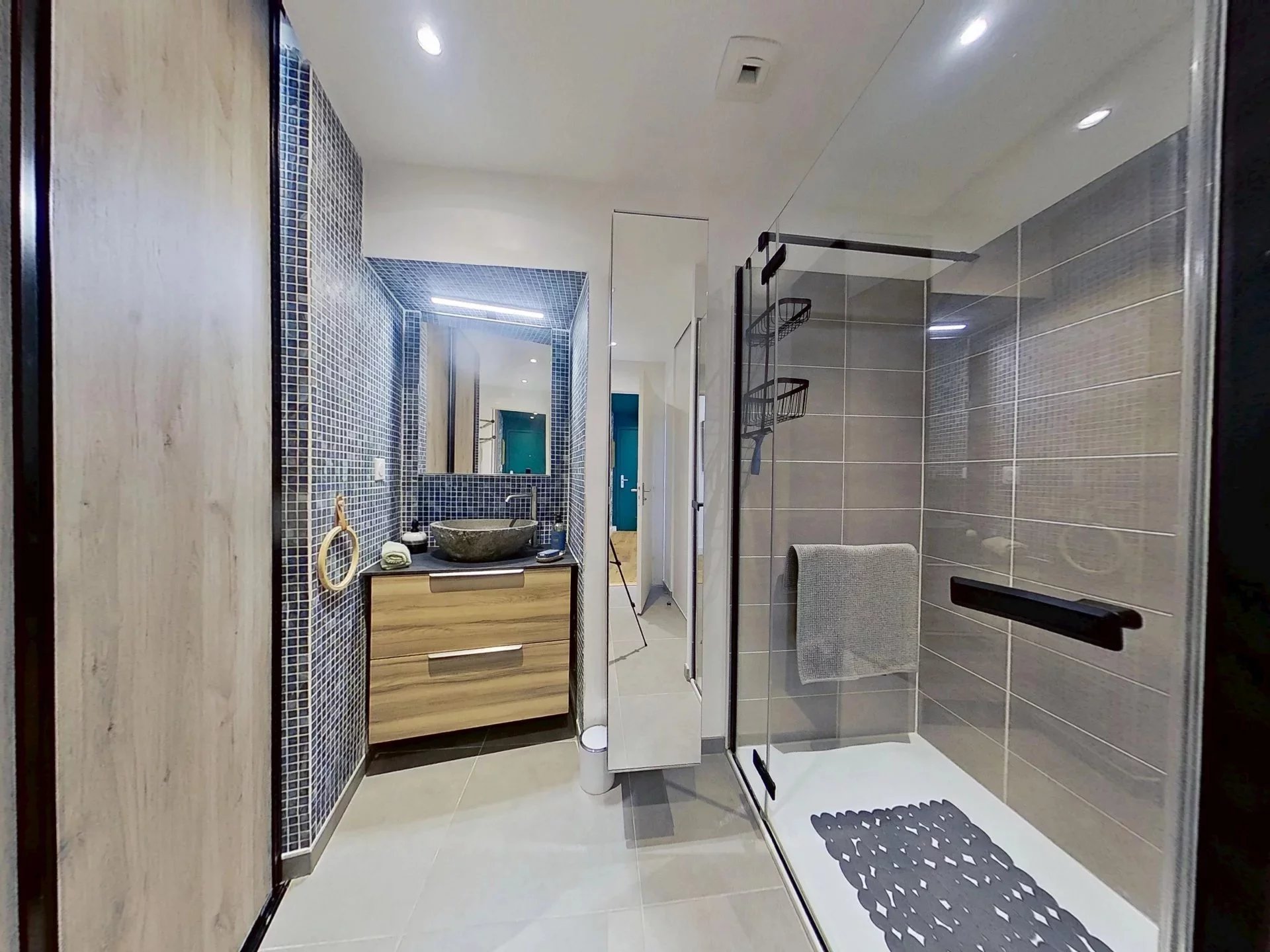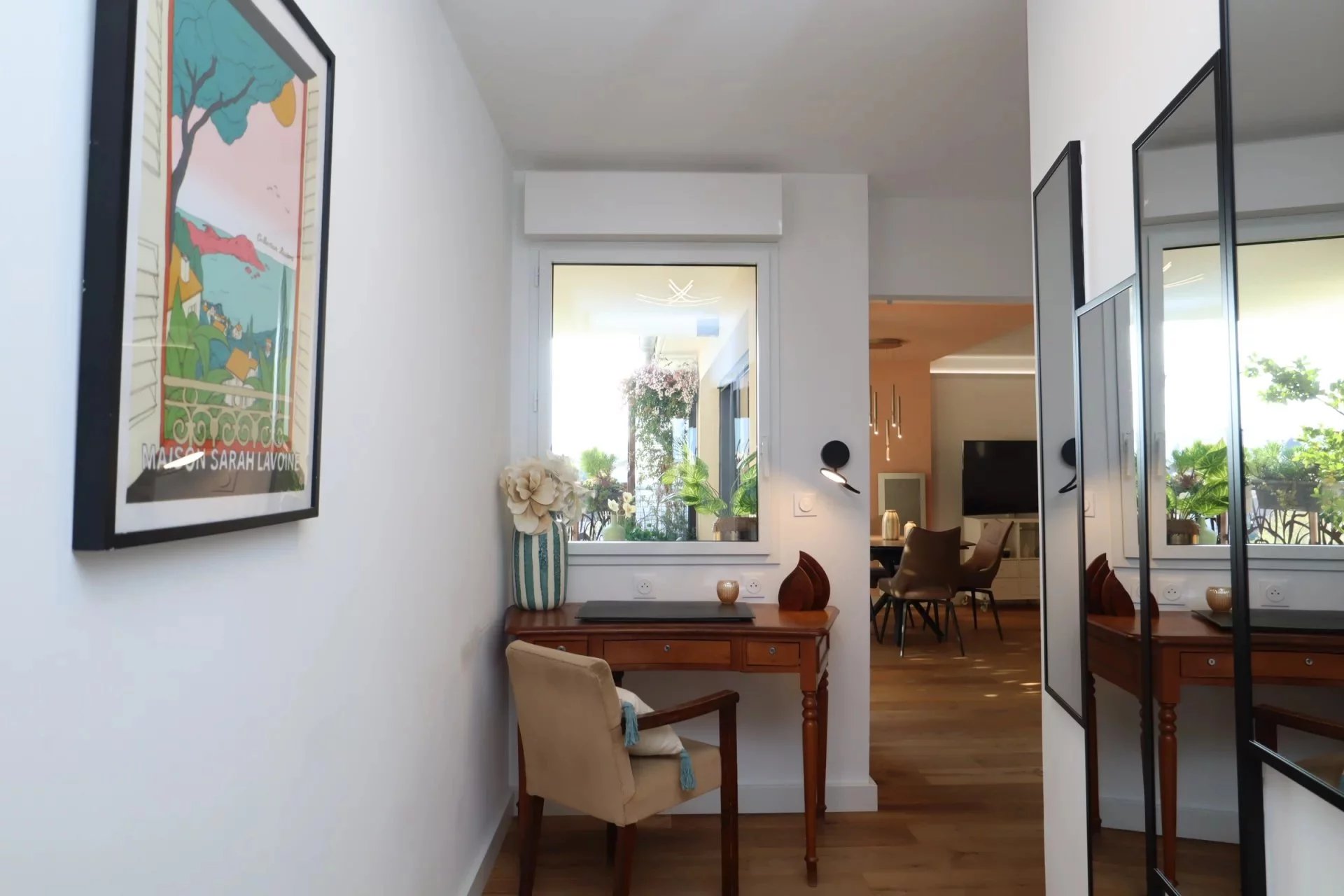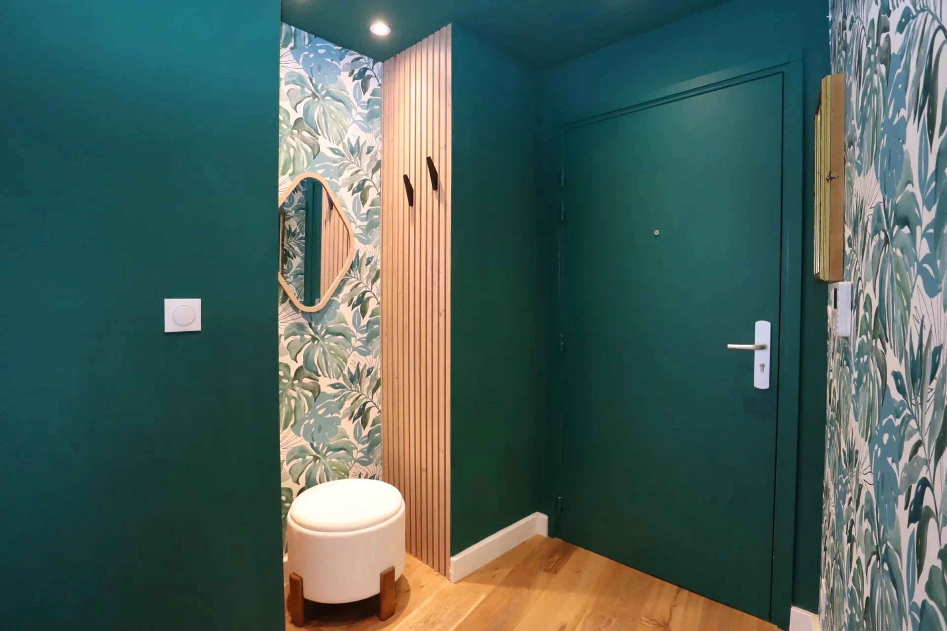 Entrée élégante à la décoration contemporaine, sublimée par un superbe parquet bois, avec WC indépendant et lave-mains.