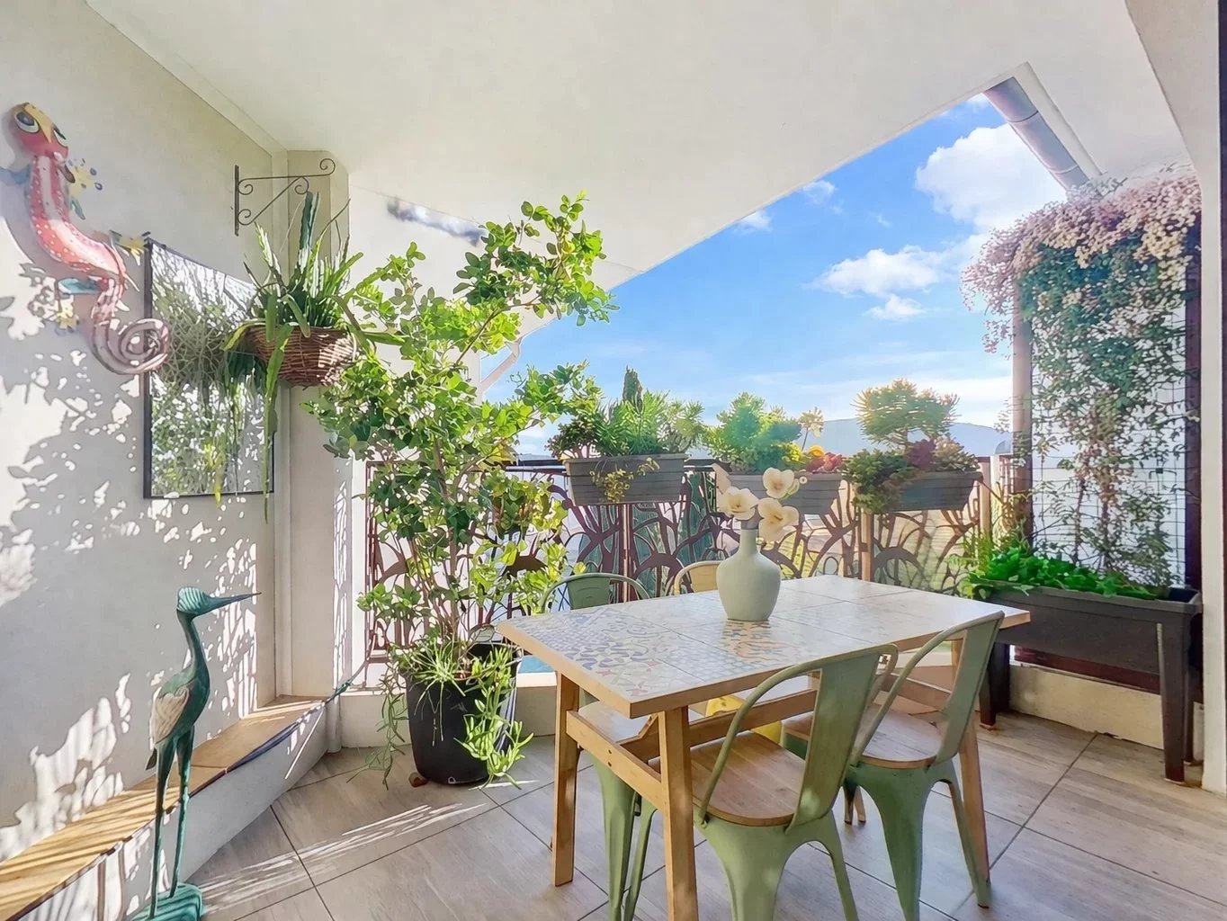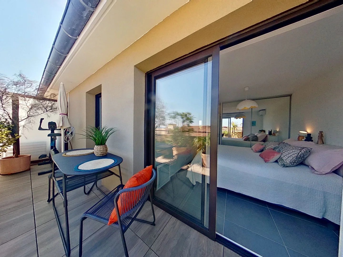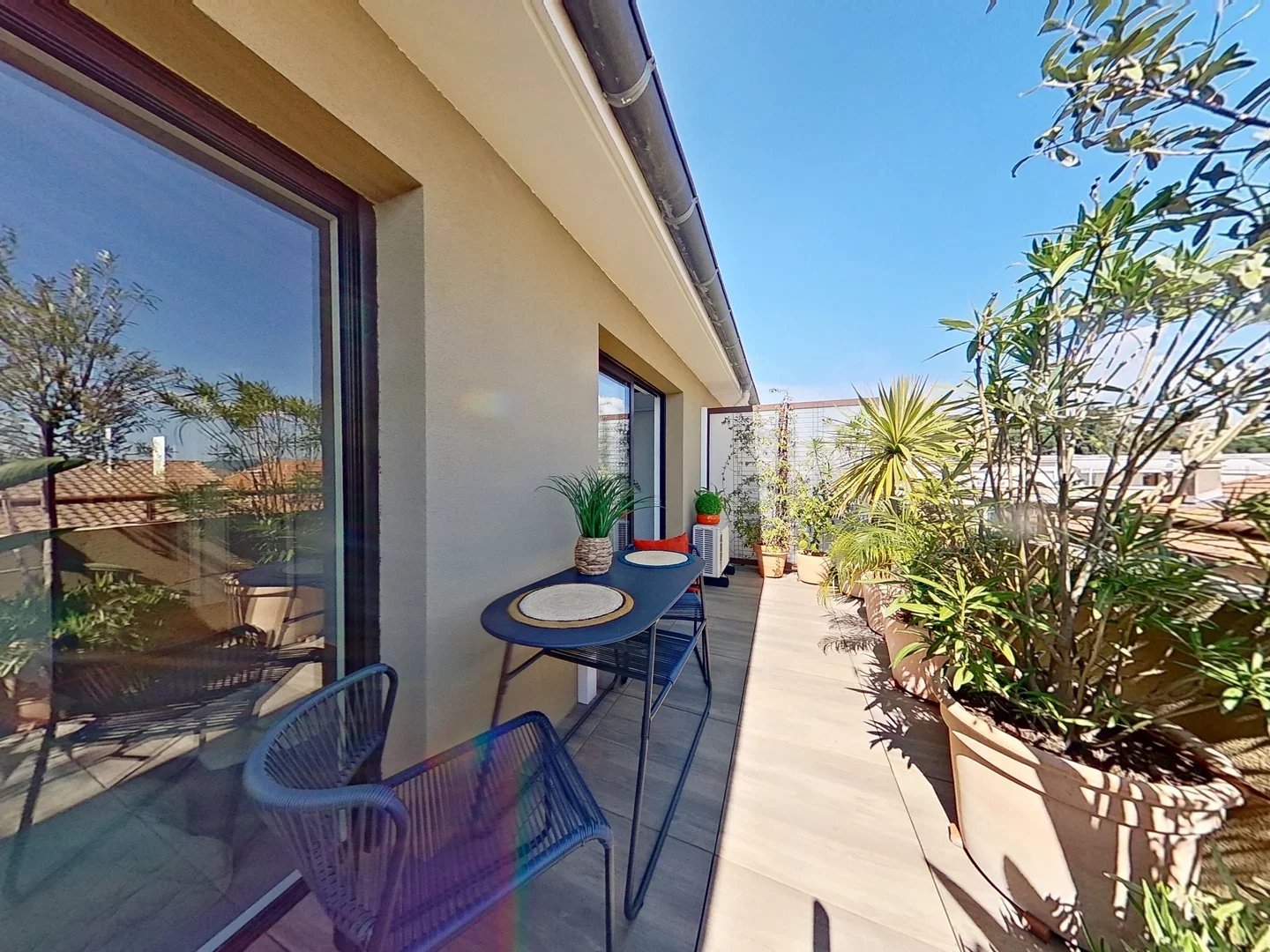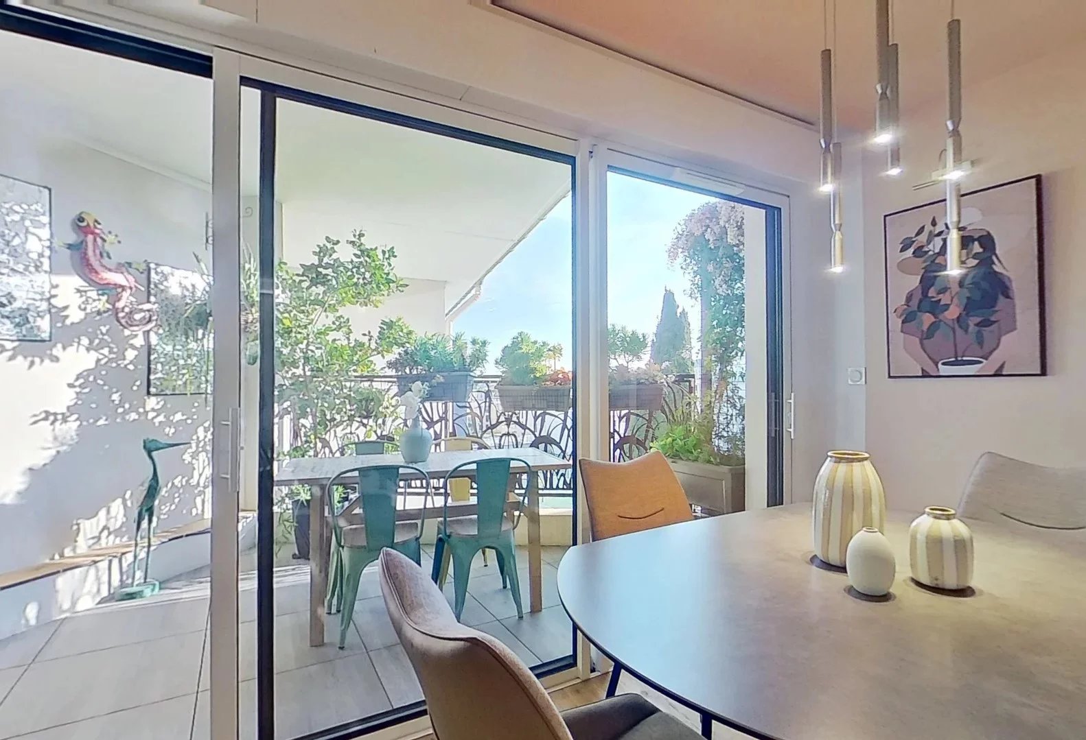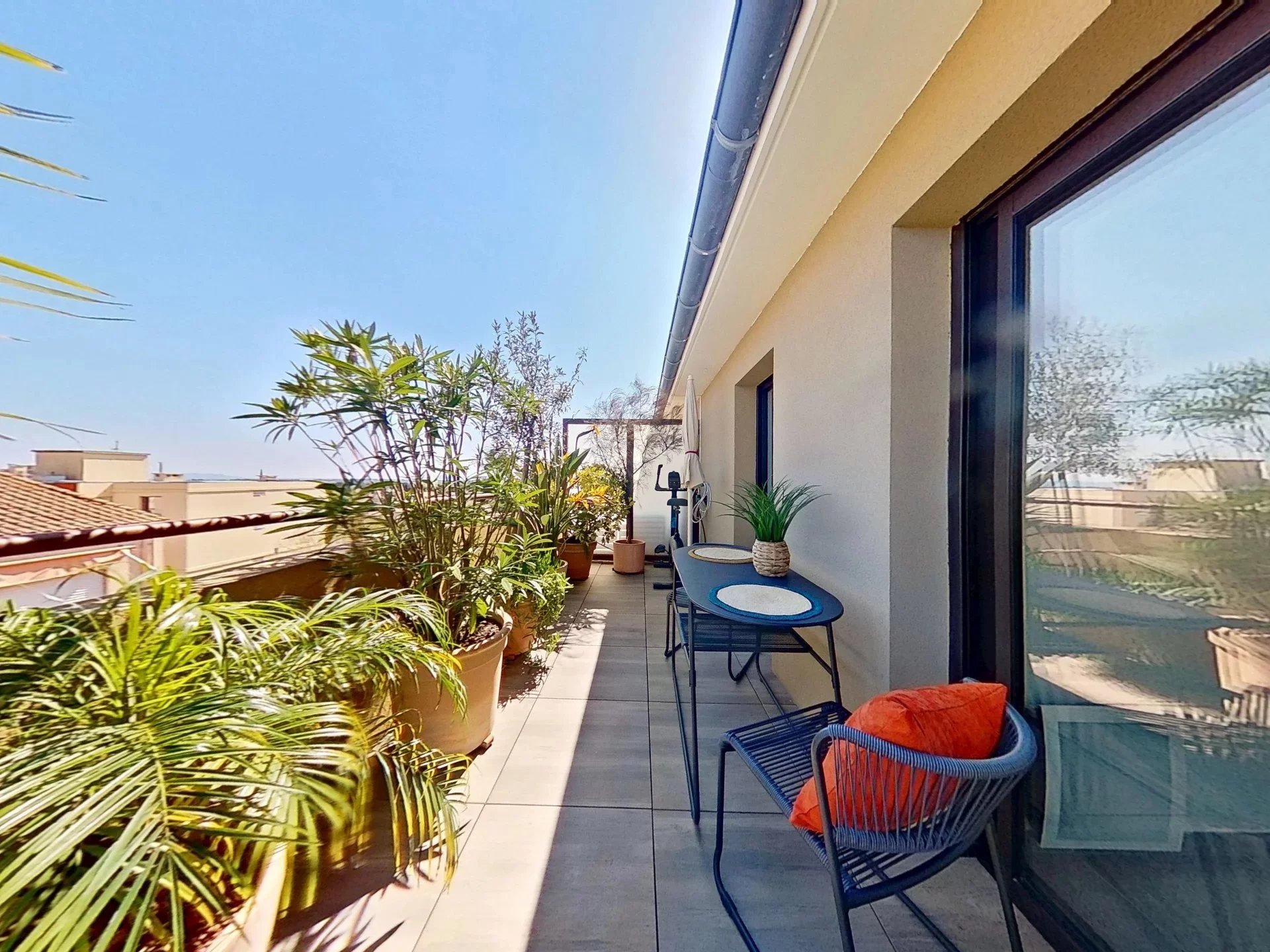 Grandes baies aluminium ouvrant sur une terrasse couverte intimiste de 9 m², sans vis-à-vis, avec vue dégagée et aperçu mer.