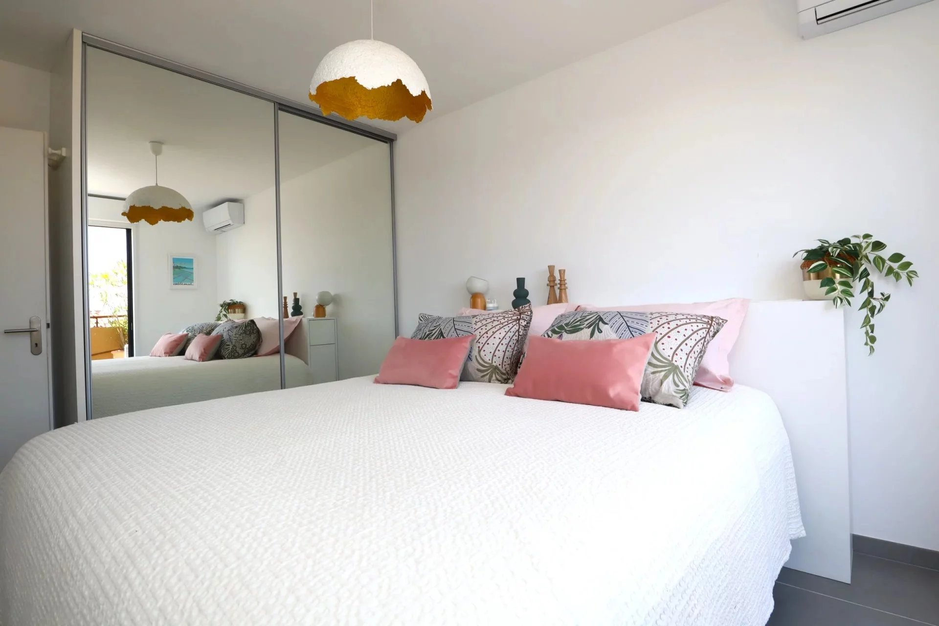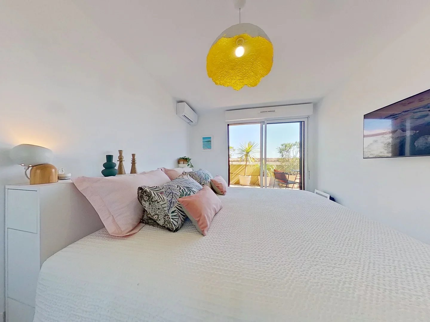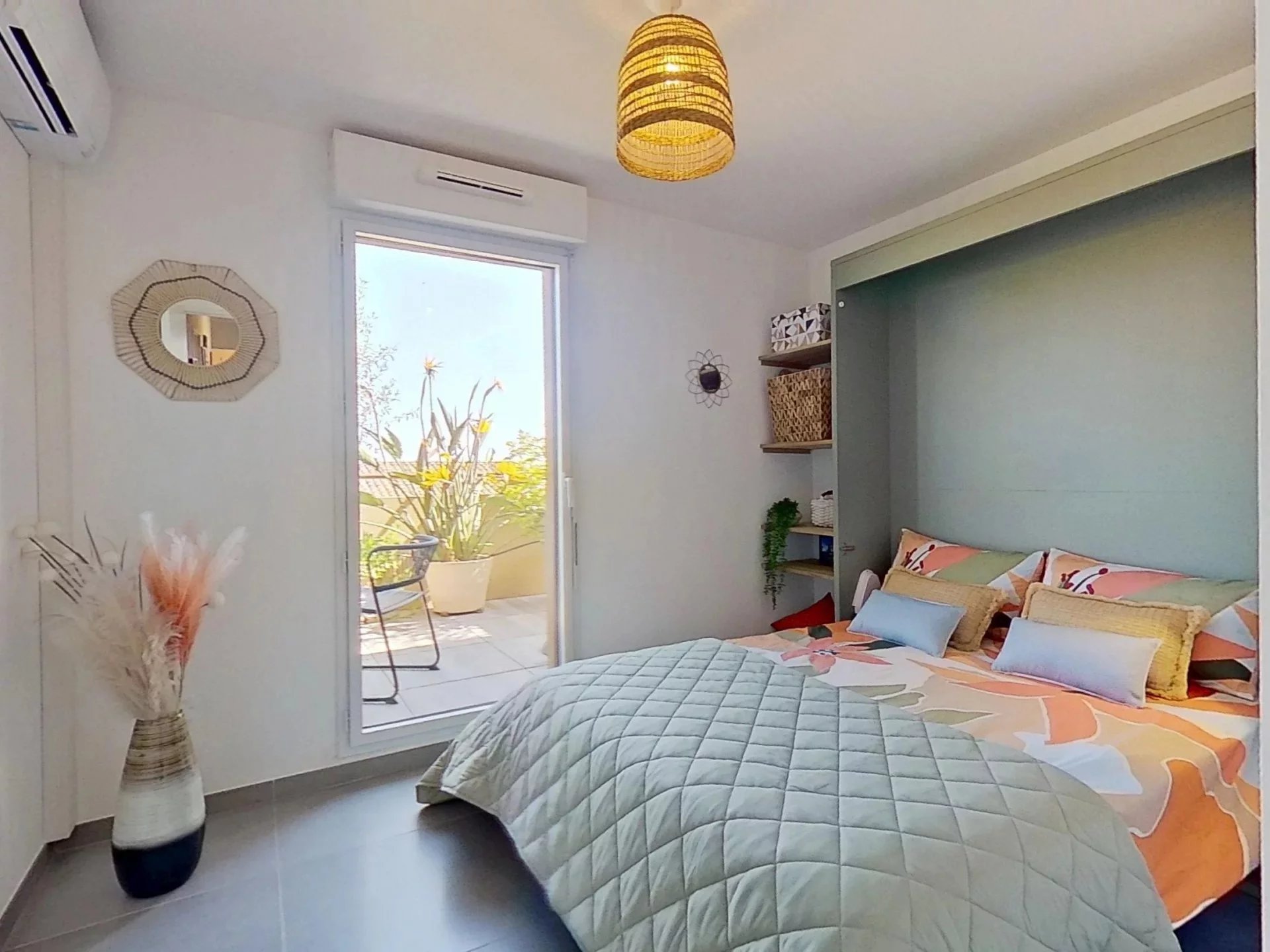 Côté nuit : une chambre de 9 m² et une chambre de 13,29 m² avec grands placards miroirs. Toutes deux s'ouvrent sur une belle terrasse spacieuse de 13 m², ensoleillée le matin, sans vis-à-vis et avec aperçu mer.