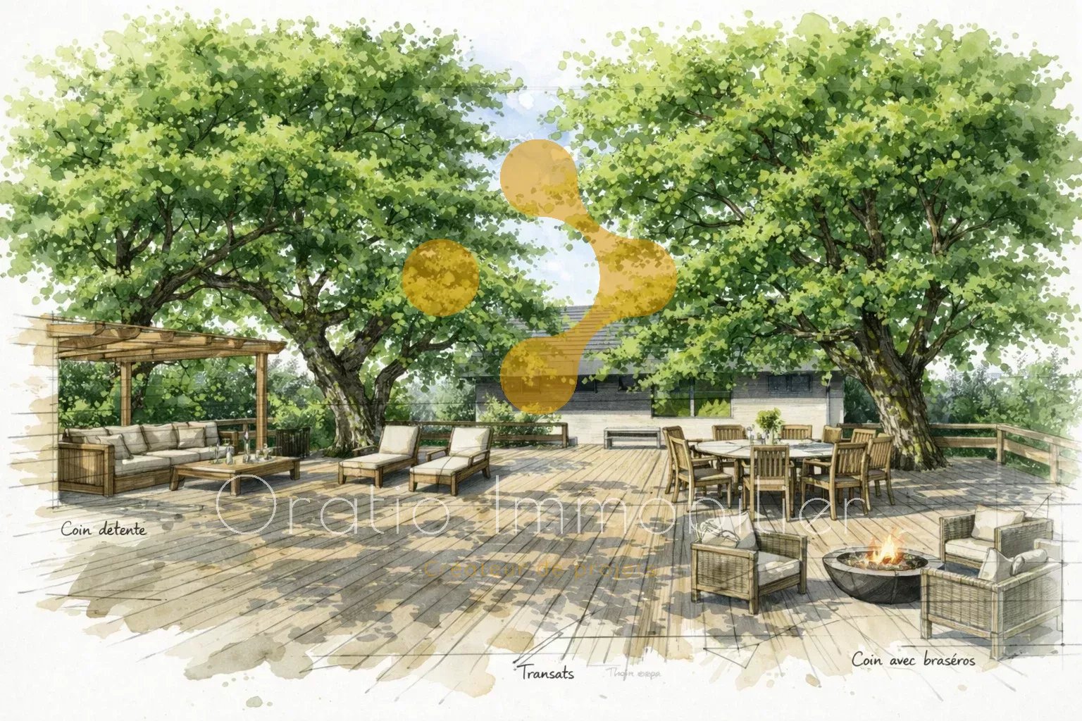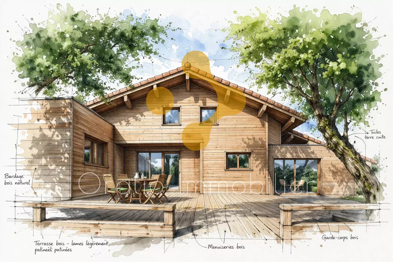 À l’extérieur, une vaste terrasse en bois de plus de 40 m² constitue un véritable espace de réception, parfaitement intégré à son environnement naturel, invitant à la détente dans un cadre paisible et préservé.
