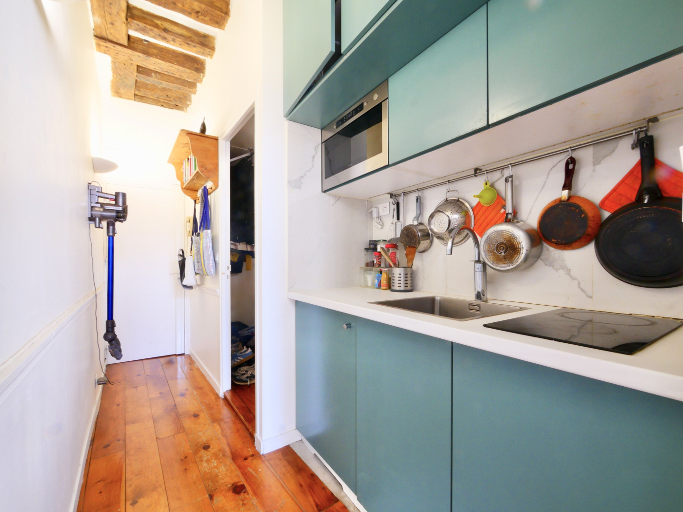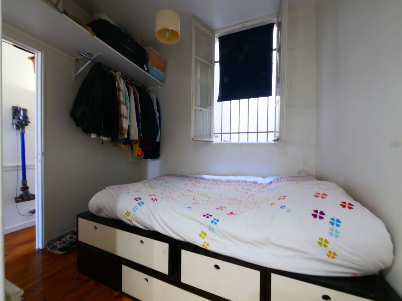 Ce bien d'environ 24m2 se compose d'une entrée, une chambre séparée avec salle de bain attenante, une cuisine toute équipée, un séjour très lumineux avec une belle hauteur sous plafond et deux fenêtres donnant sur la rue et une vue agréable sur le ciel et les toits de Paris.