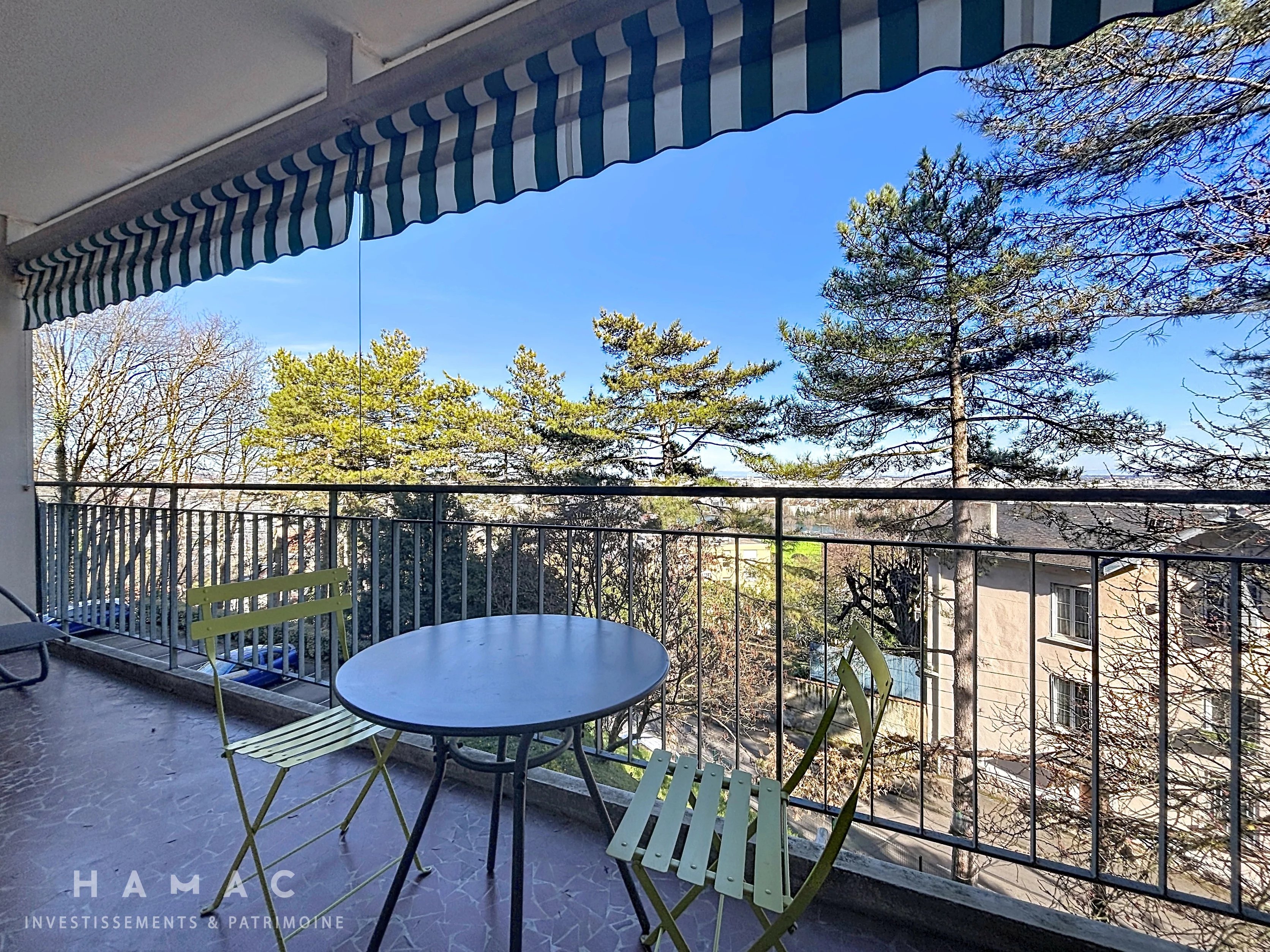 L’appartement se compose d’un double séjour lumineux de 25 m² exposé Est, ouvrant sur un balcon offrant une vue sur la ville, d’une cuisine entièrement équipée de 13 m², ainsi que de deux chambres de 13,5 m² chacune avec rangements.