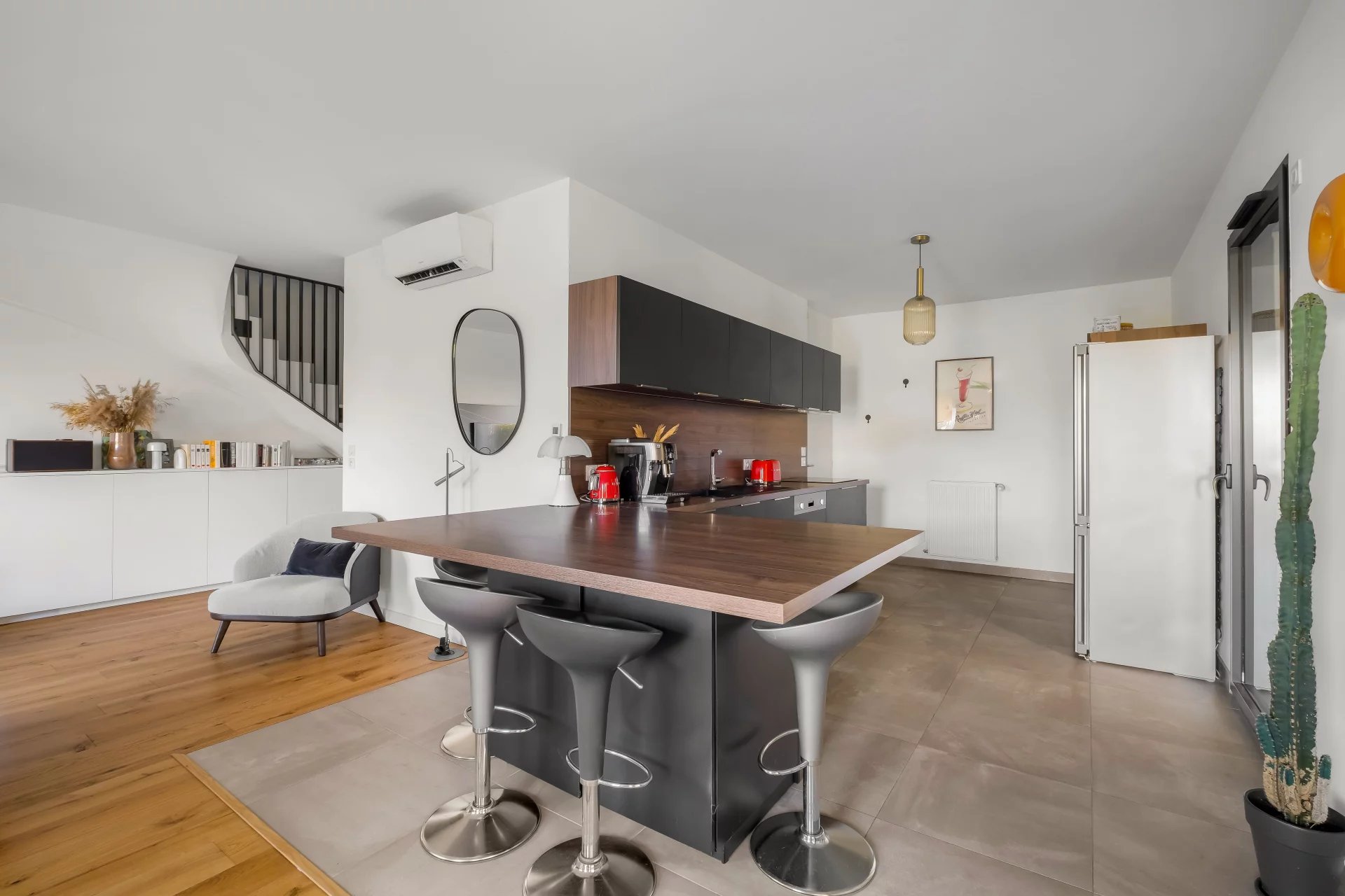 HAMAC IMMOBILIER vous propose en exclusivité ce duplex à seulement cinq minutes du village de Saint-Cyr-au-Mont-d’Or, d'une superficie de 120 m², situé dans une copropriété intimiste de cinq lots, construite en 2022. L’appartement bénéficie d’un environnement calme et verdoyant, à proximité immédiate du village et de ses commodités. Au rez-de-chaussée, une grande pièce de vie de 50m2 lumineuse s’ouvre sur un jardin privatif de 180 m², sans aucun vis-à-vis. La cuisine ouverte, entièrement équipée et aménagée, se prolonge naturellement sur l’espace salon. Un coin TV, réalisé sur mesure par un architecte, vient structurer la pièce et offre des rangements pratiques sous l’escalier. L’ensemble est climatisé, et les volets roulants électriques sont des BSO. Une buanderie et un WC complètent ce niveau. À l’étage, on retrouve trois chambres dont deux avec accès à une terrasse de 15m2, une salle d’eau, un coin bureau et un WC indépendant. Les ouvertures offrent une belle luminosité et une vue dégagée sur la verdure. Le chauffage est individuel au gaz avec une pompe à chaleur réversible. L’appartement dispose également de deux places de stationnement privatives et d’une cave. Un cadre de vie privilégié, rare à seulement quelques minutes de Lyon. Pour plus d’informations ou organiser une visite, contactez nous dès maintenant. La présente annonce immobilière a été rédigée sous la responsabilité éditoriale de Victor BONAZZA conseiller en immobilier indépendant (sans détention de fonds), agent commercial de la SAS Hamac Investissement & Patrimoine immatriculé au RSAC de LYON sous le numéro 853572154