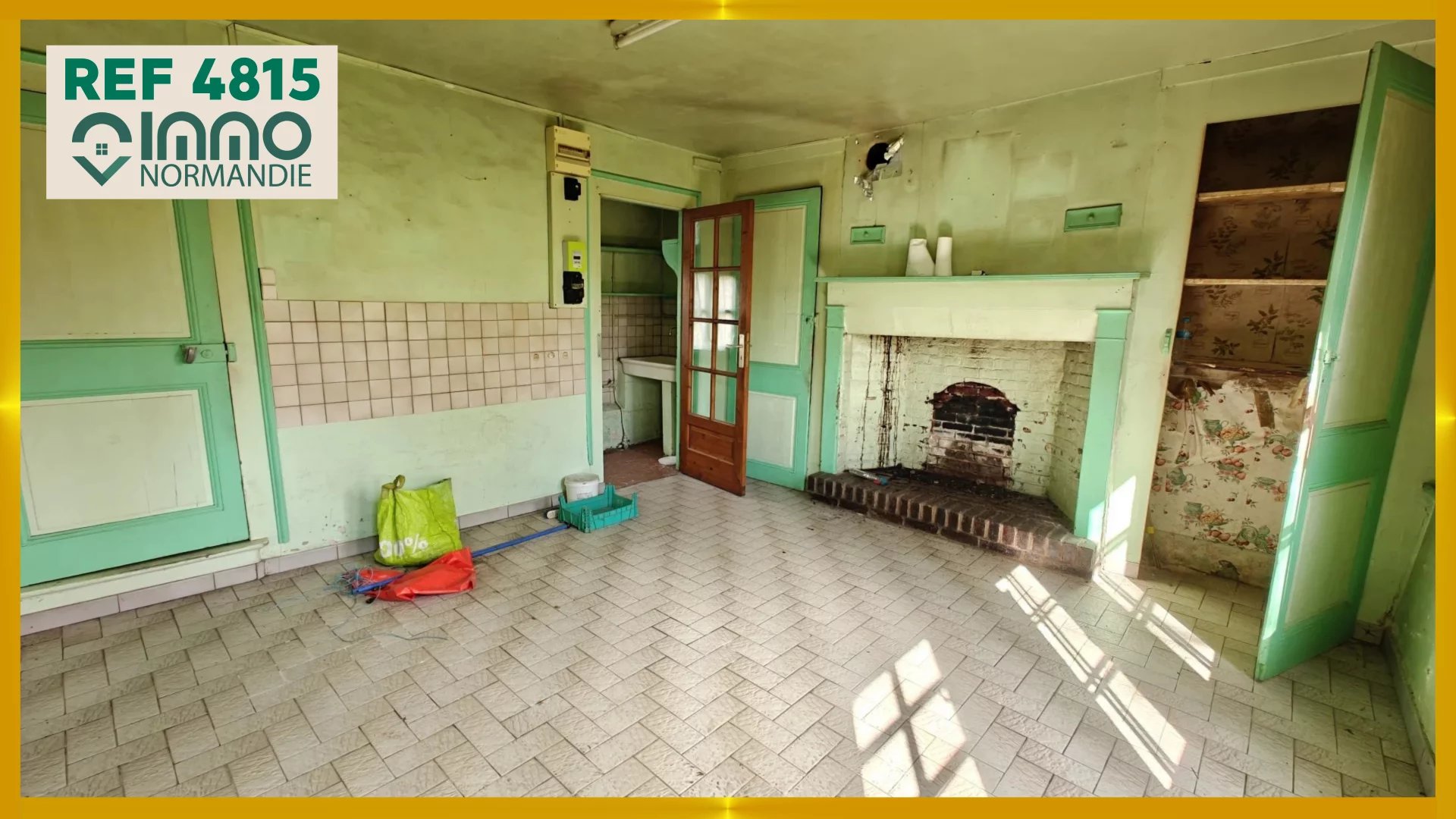Cuisine avec cheminée, arrière cuisine avec évier, dégagement, salle de douche, WC, séjour avec cheminée et placard.