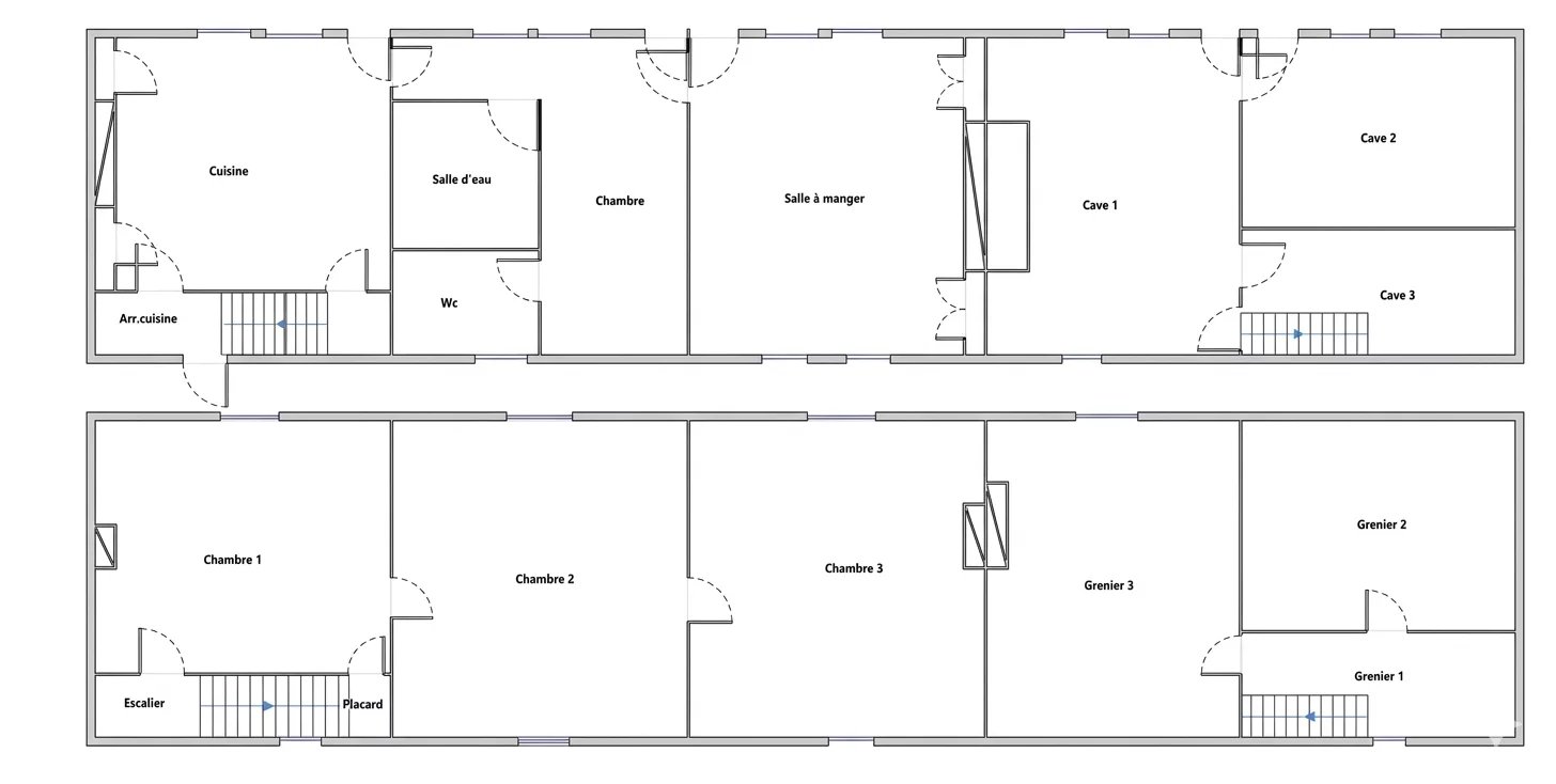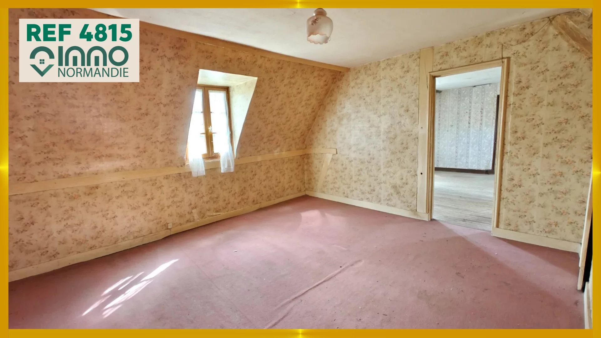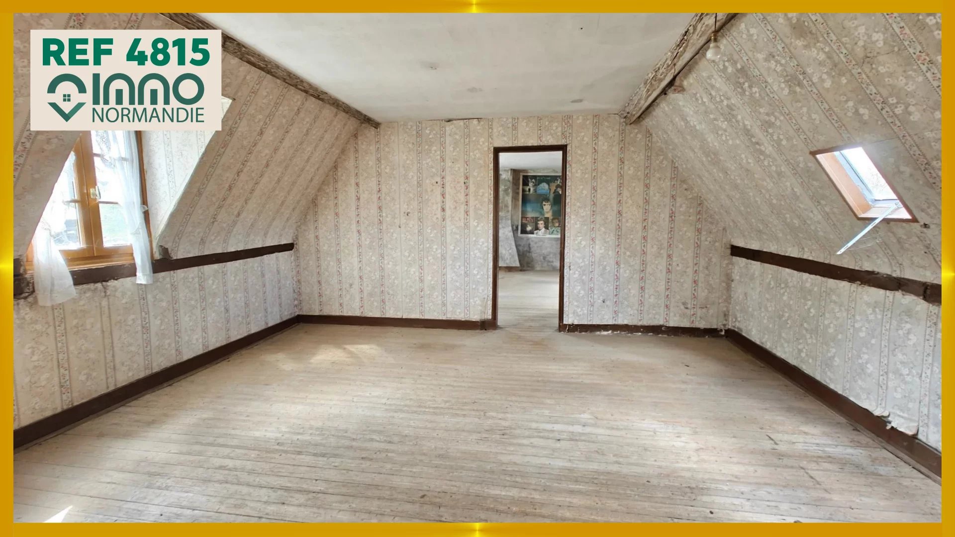 A l'étage : palier, chambre passante, chambre via la 1ere entrée.
