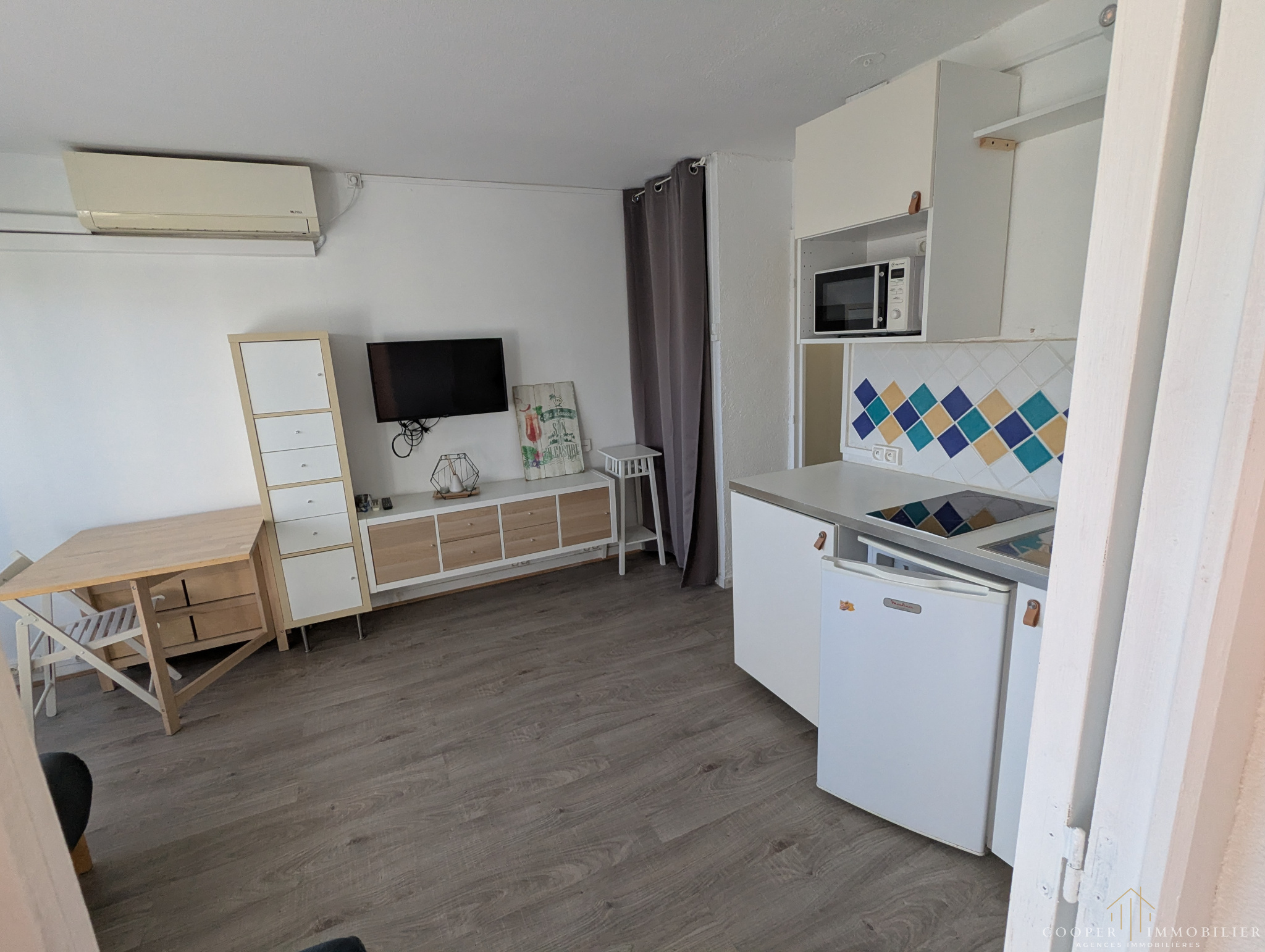 A Port Camargue au quai d'honneur, à découvrir ce studio cabine aménagé avec une pièce à coucher indépendante. Situé au 1er étage avec ascenseur dans une résidence soignée, l'appartement se compose d'une pièce de vie avec son coin cuisine et une chambre, les deux pièces s'ouvrant sur un balcon de 8 m2 exposé Est; A l'entrée vous trouverez la salle de bains, WC indépendant et coin cabine; place de parking privative (devant l'appartement) et cellier complètent le tout. L'appartement est très bien équipé (climatisation) et rénové il y a quelques années; changement des baies vitrées début 2026 (DPE en cours de modification). Depuis la résidence Le Grand Pavois vous accédez directement aux quais avec ses nombreux commerces et aux plages Sud par voie cyclable.