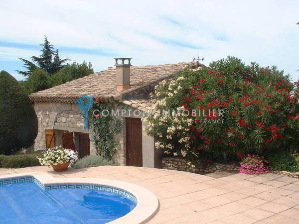En périphérie d'Uzès : Situé dans village très prisé, ce bel ensemble exposé plein sud bénéficie d'un environnement paisible sans vis-à-vis, avec une vue dégagée imprenable. Le village offre d'excellentes commodités et offre de multiples sentiers pédestres et cyclables pittoresques. La superbe ville d'Uzès est directement accessible et Le Pont du Gard, classé au patrimoine mondial de l'UNESCO à seulement 9 kms tandis que les liaisons TGV et aéroports sont faciles via NIMES (25 kms) ou AVIGNON (35 kms). L'autoroute A9 n'est qu'à 15 kms. Que ce soit pour une résidence principale, une résidence secondaire ou un investissement locatif, ce petit domaine est une opportunité rare à proximité d'UZES. Les magnifiques gorges du Gardon vous offriront lieux de baignade ou descente en canöe. MAISON PRINCIPALE (140 m2 de plain pied, construite en 1990) : Un portail ouvre sur cette première partie du terrain, avec un accès direct au garage comportant une mezzanine de rangement et un chauffe-eau thermodynamique. Une grande pièce à vivre de 55 m2 lumineuse, 2 chambres, wc indépendant, salle de bains + douche Italienne, salon vitré en prolongement du séjour offrant un espace couchage en mezzanine, une suite parentale avec salle d'eau/wc, cellier/buanderie attenant à la cuisine (adoucisseur), cour intérieure donnant sur cave à vins. Très beau terrain avec vue sur garrigue possédant une piscine 12mx5m et donnant accès au mazet habitable. Un haut portail du mazet donne accès à un vaste espace comprenant un terrain de boules/parking, un bassin à poissons, des oliviers et un abri de jardin.