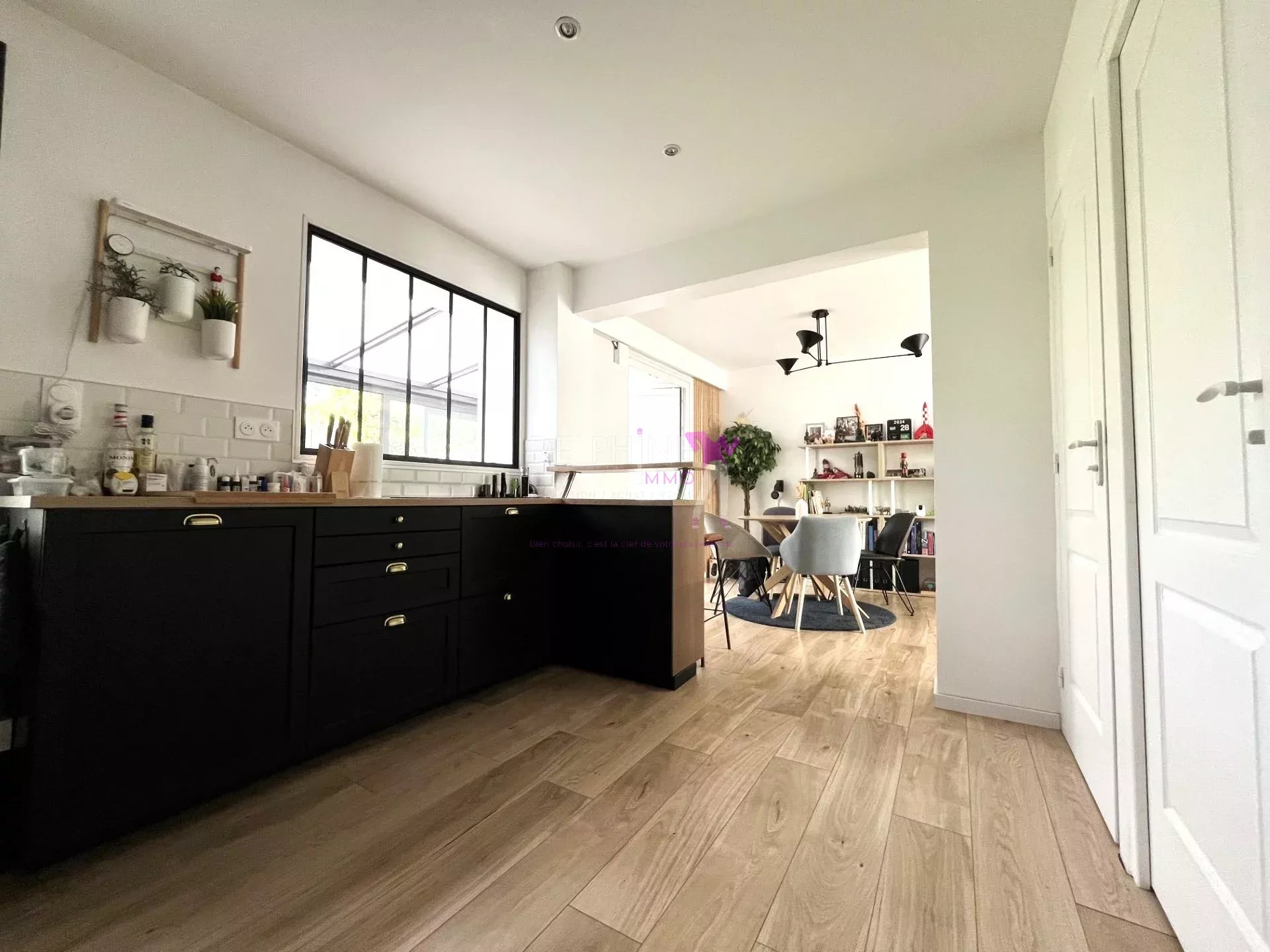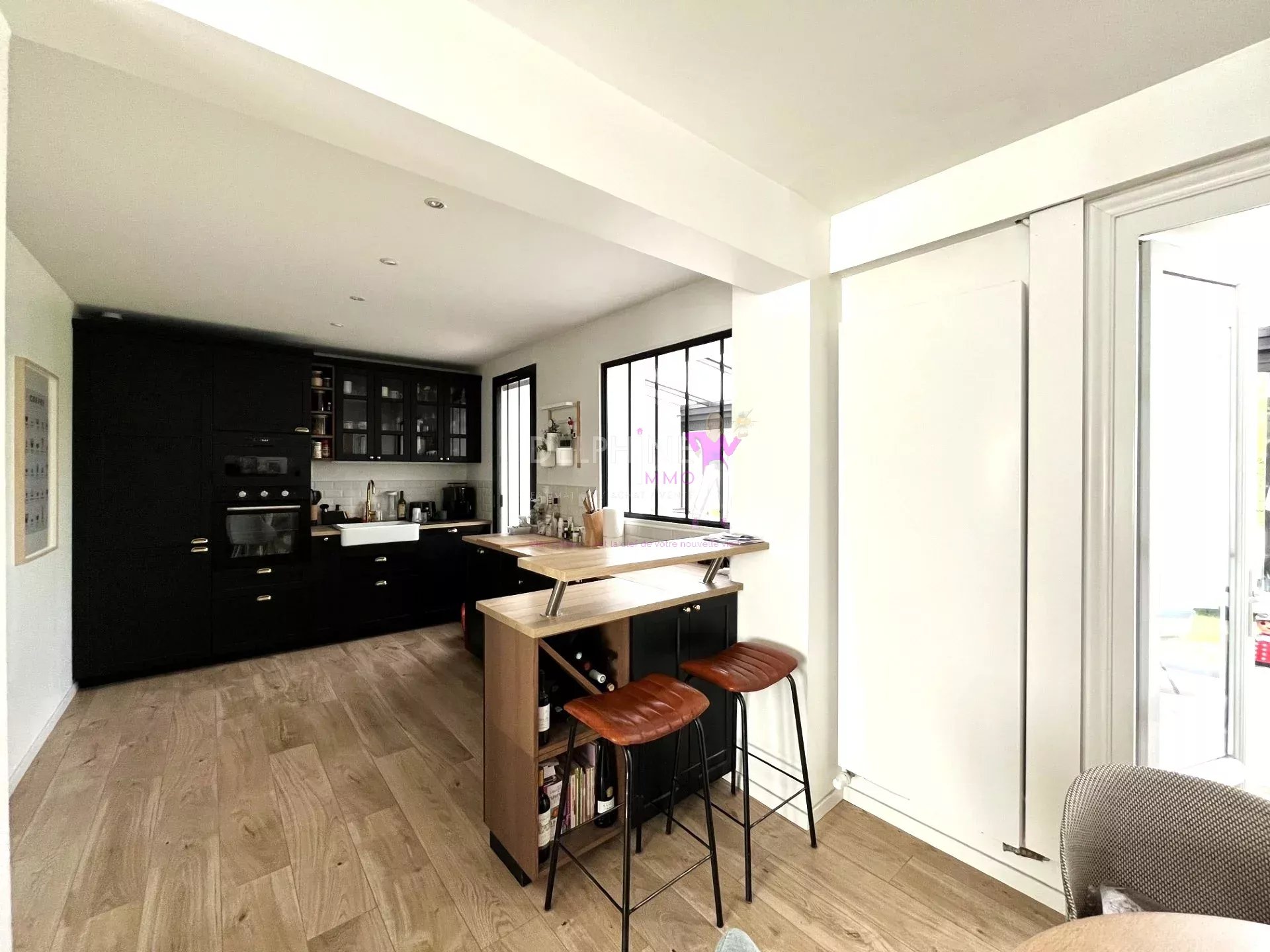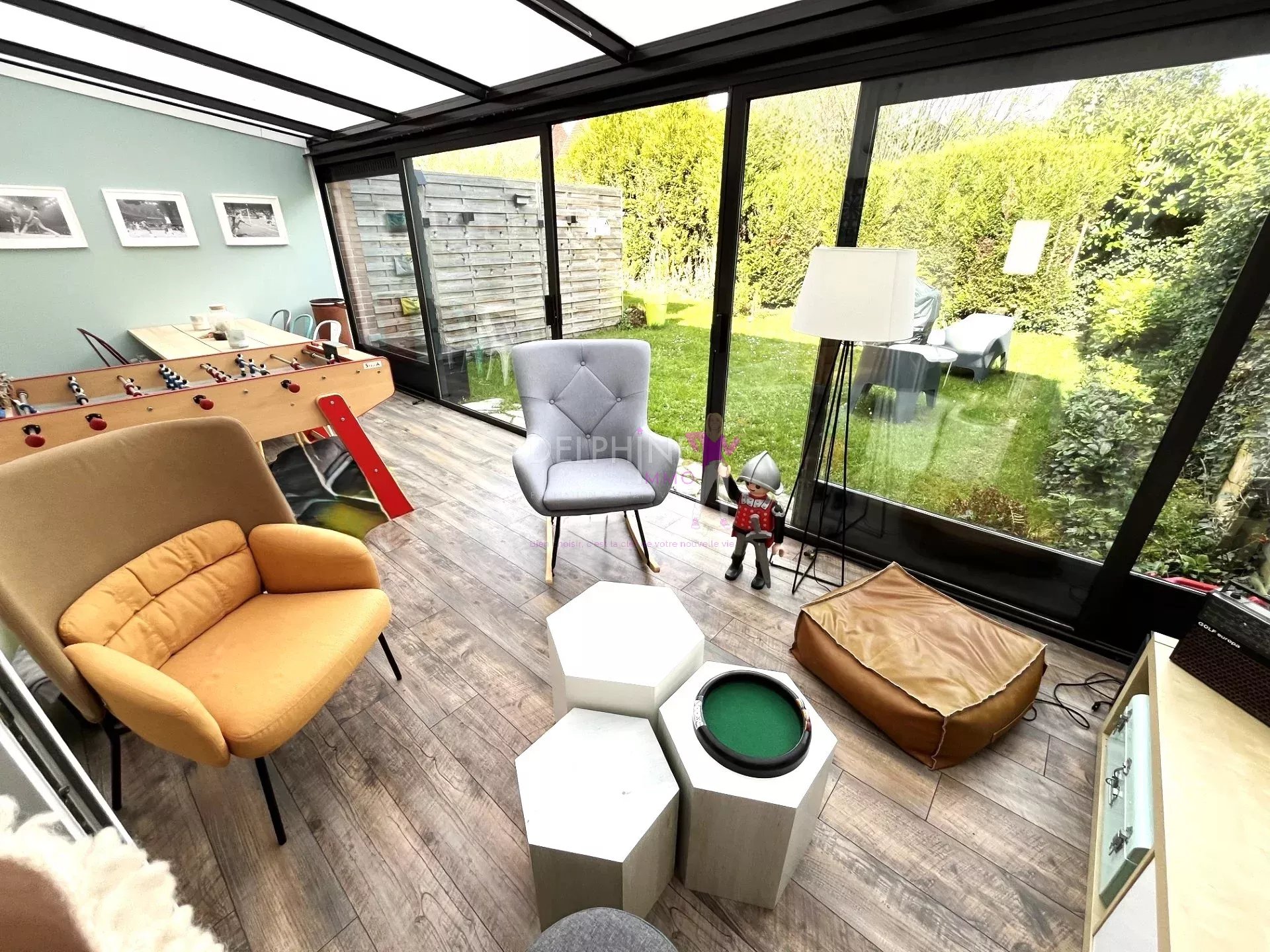 Entrée avec vestiaire, Magnifique pièce de vie lumineuse avec une cuisine équipée ouverte et son espace repas journalier, une vaste véranda, le tout donnant sur un jardin arboré , exposé sud/est et sans aucun vis-à-vis.