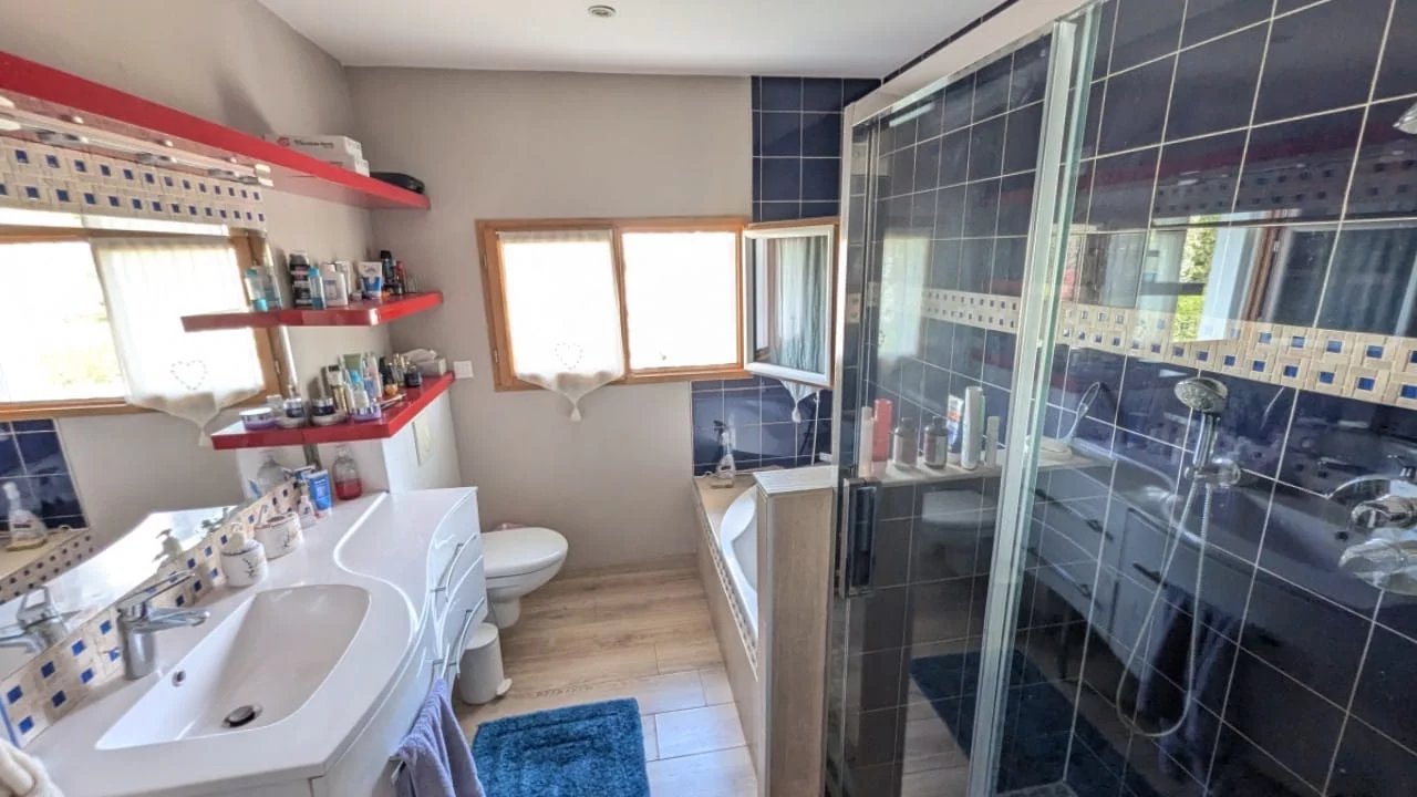 À l’étage, l’espace nuit se compose d’une véritable suite parentale très confortable avec douche et baignoire, ainsi qu’un beau dressing. Une seconde chambre dispose de sa propre salle de bains. Une troisième chambre vient compléter cet étage, accompagnée d’une salle de bains indépendante supplémentaire.